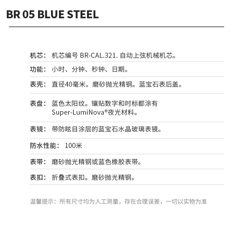 BellRoss 柏莱士全自动男士腕表蓝色商务轻奢 BR05 Blue Steel BR05A-BLU-ST/SRB BR05A-BLU-ST/SST