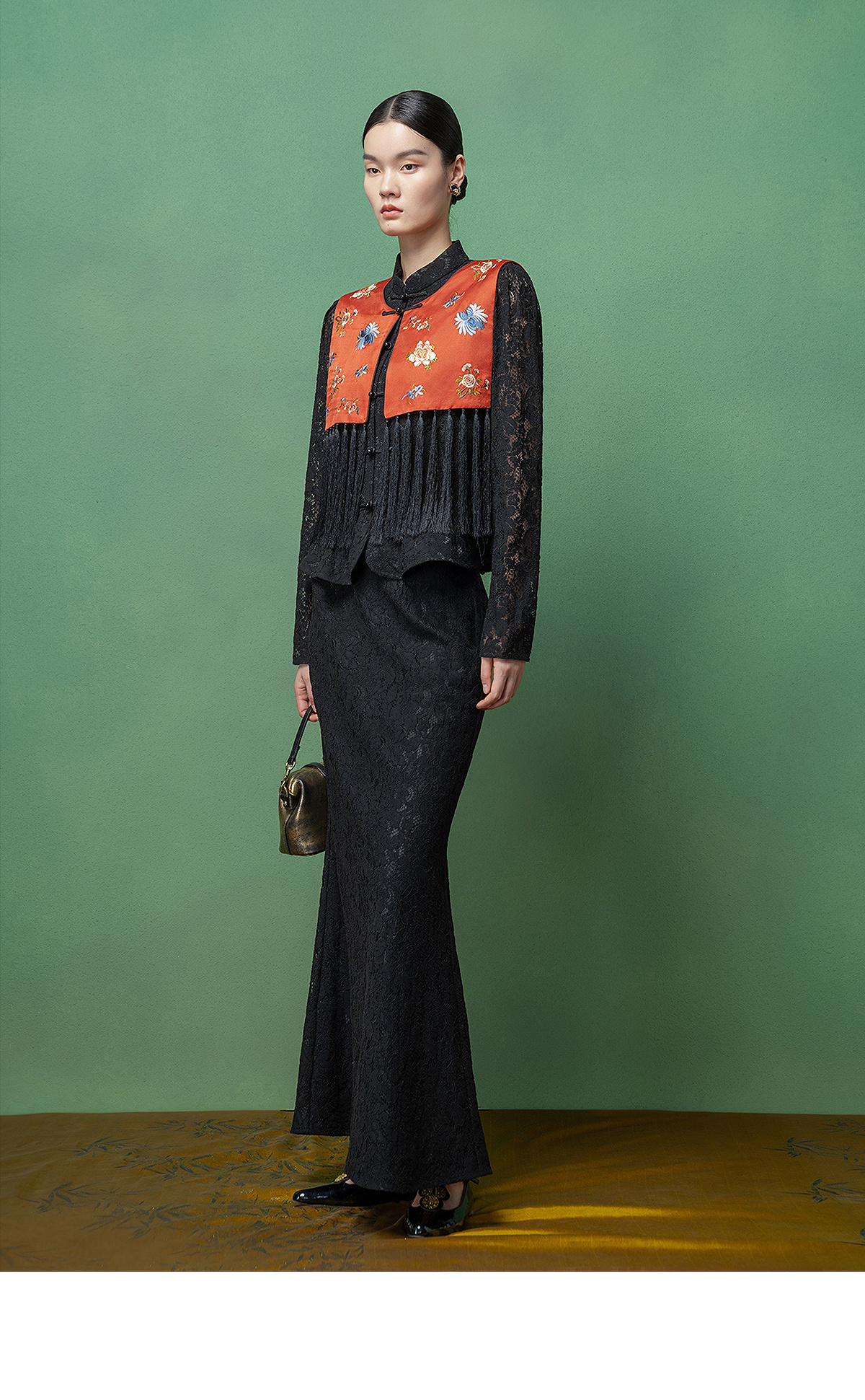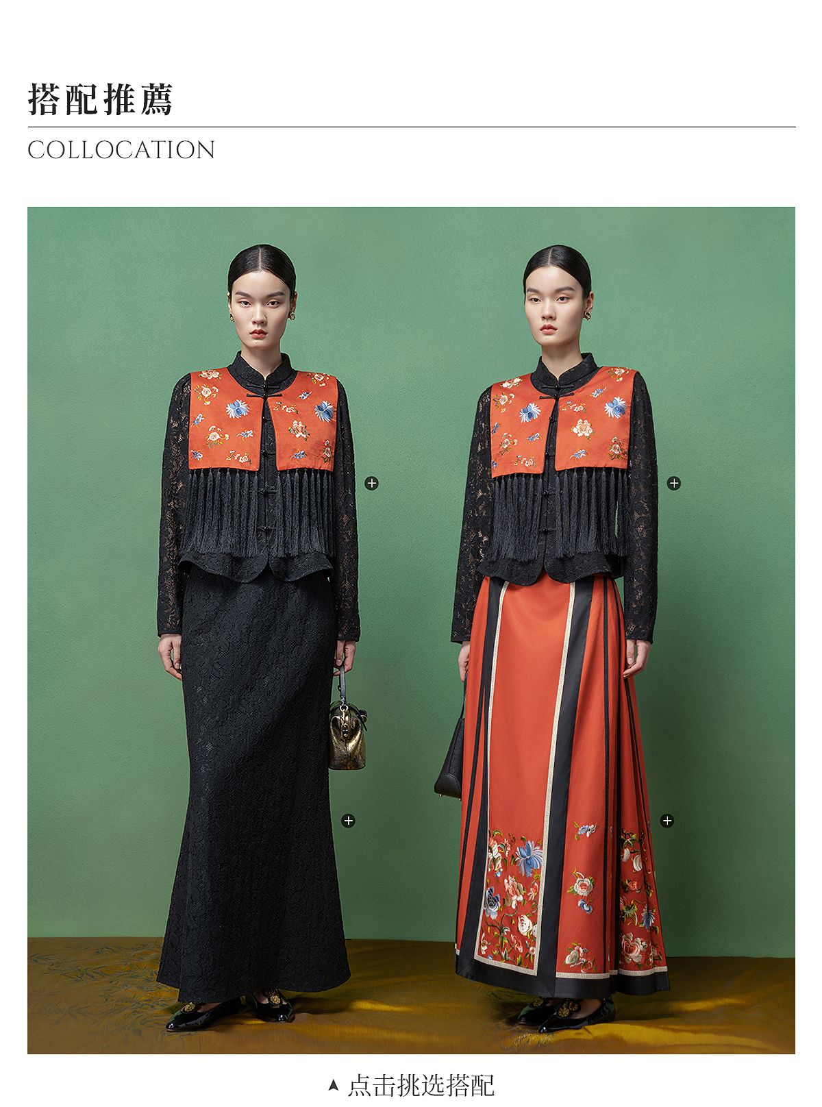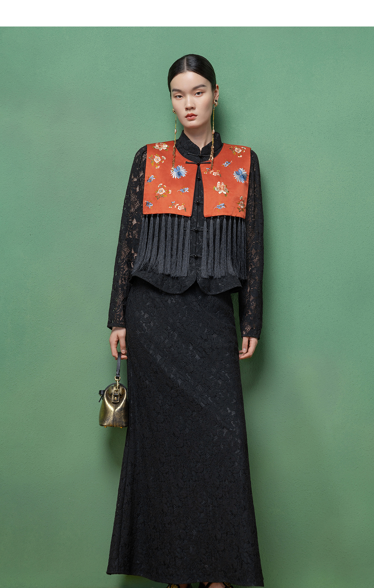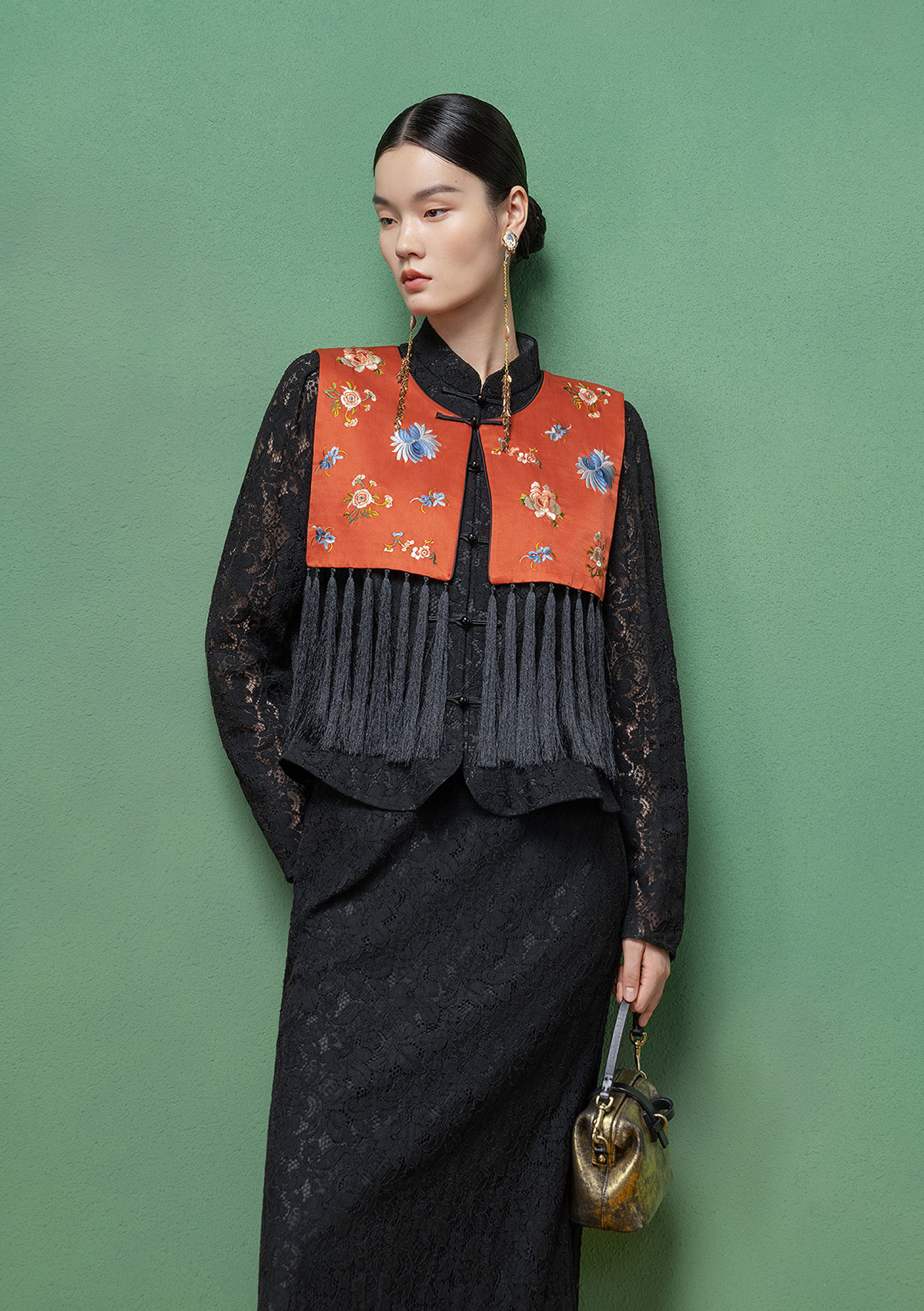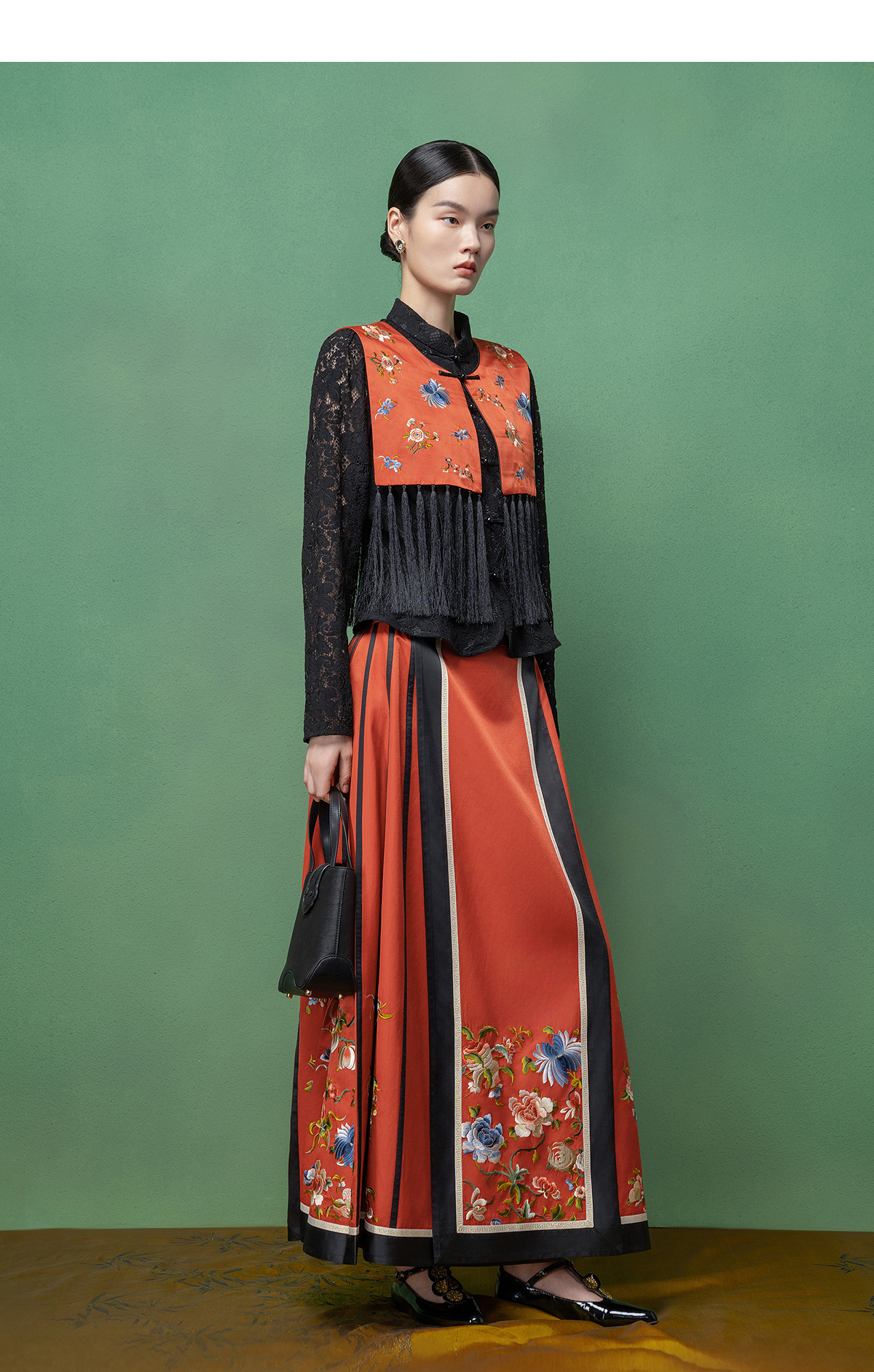 【林栖设计小店】拍行古董陌上花开|丝棉缎绣花橘红色云肩2026春新款马面裙马甲1961223