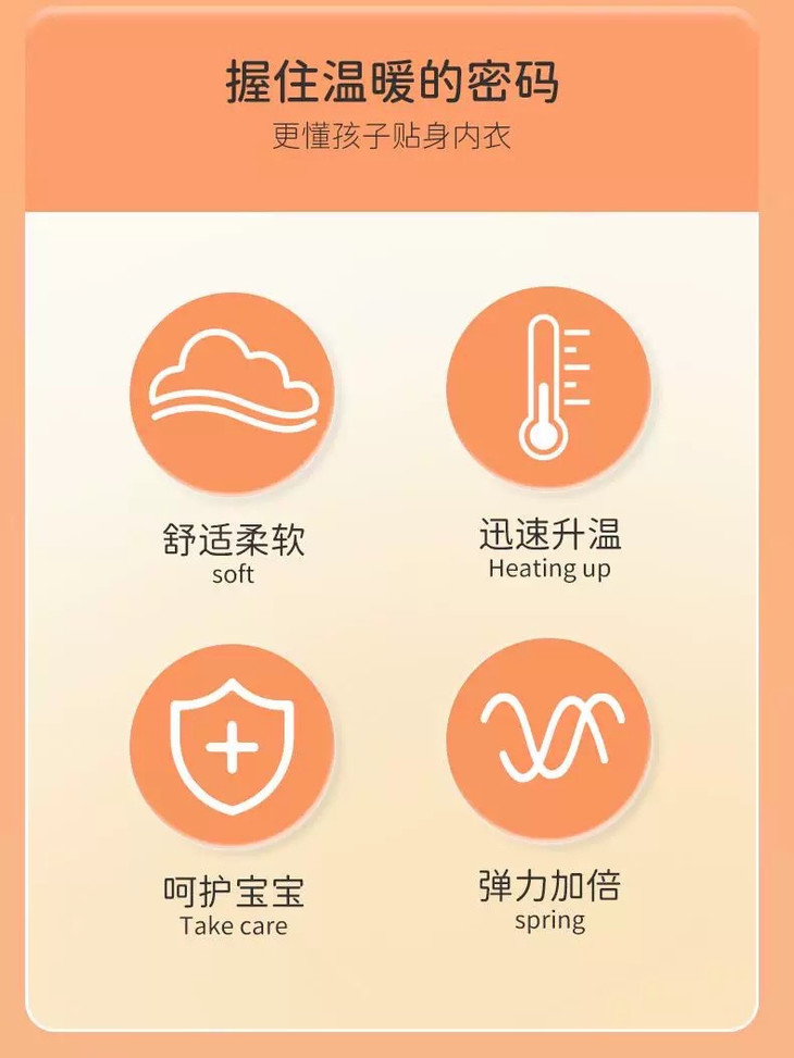 选用聚酯纤维和氨纶的组合,更加轻薄更加的贴身舒适保暖,蓄热保暖,自主升温。 握住温暖的密码,更懂孩子的贴身内衣,这种保暖衣是冬天必备的! 轻便保暖不压身的自发热保暖内衣,即使北方内里一件足以,不用叠加N层又绵又软,带有微磨毛触感,一秒速热,拒绝冰凉感。