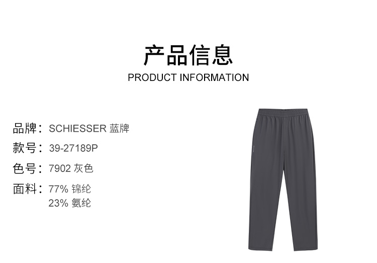 【凉感速干系列】SCHIESSER德国舒雅男士速干凉爽运动休闲户外多用直筒长裤 39/27189P