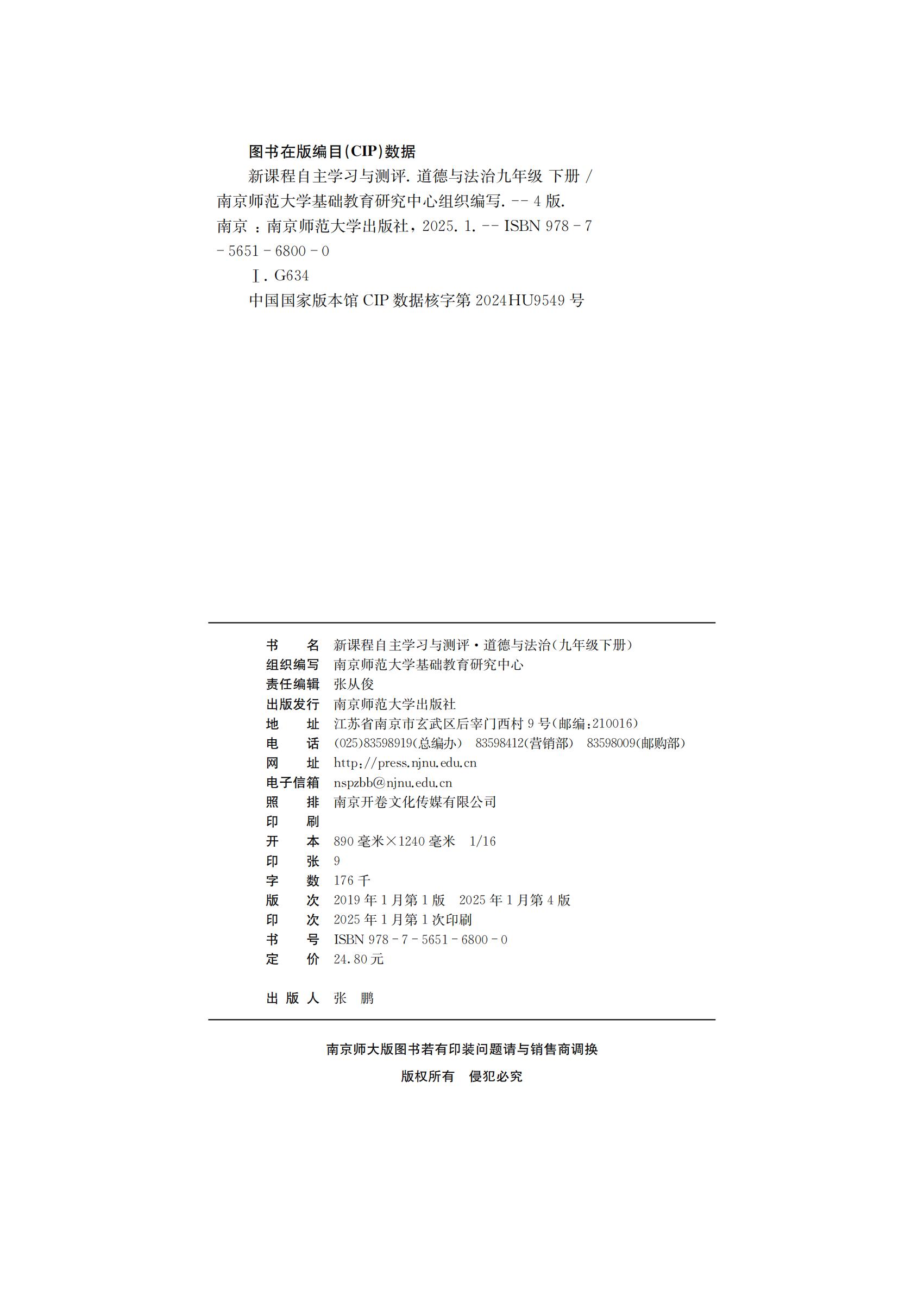 新课程自主学习与测评·道德与法治 (九年级 下) 南京师范大学出版社 正版书籍