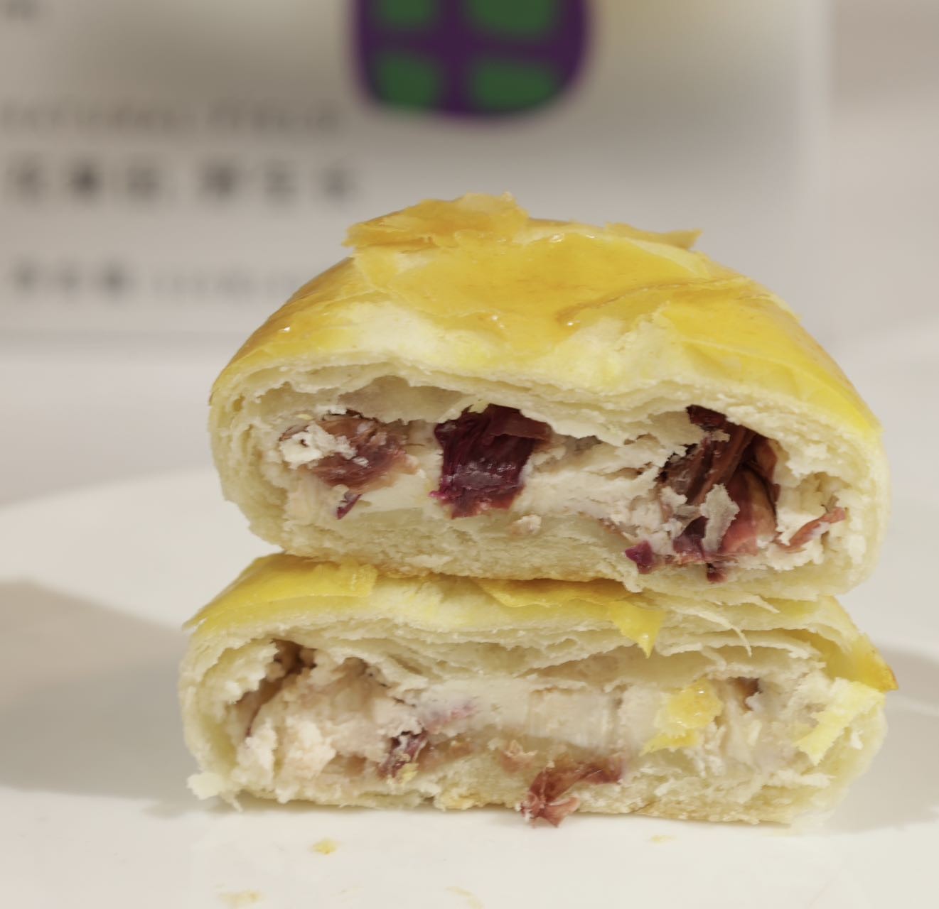 软糯,黄油面皮如天鹅绒,包裹舌尖的触起酥,轻轻一掰,酥皮可见如云叠酸甜,乳酪的微酸勾出玫瑰的甜,像月光吻过花瓣