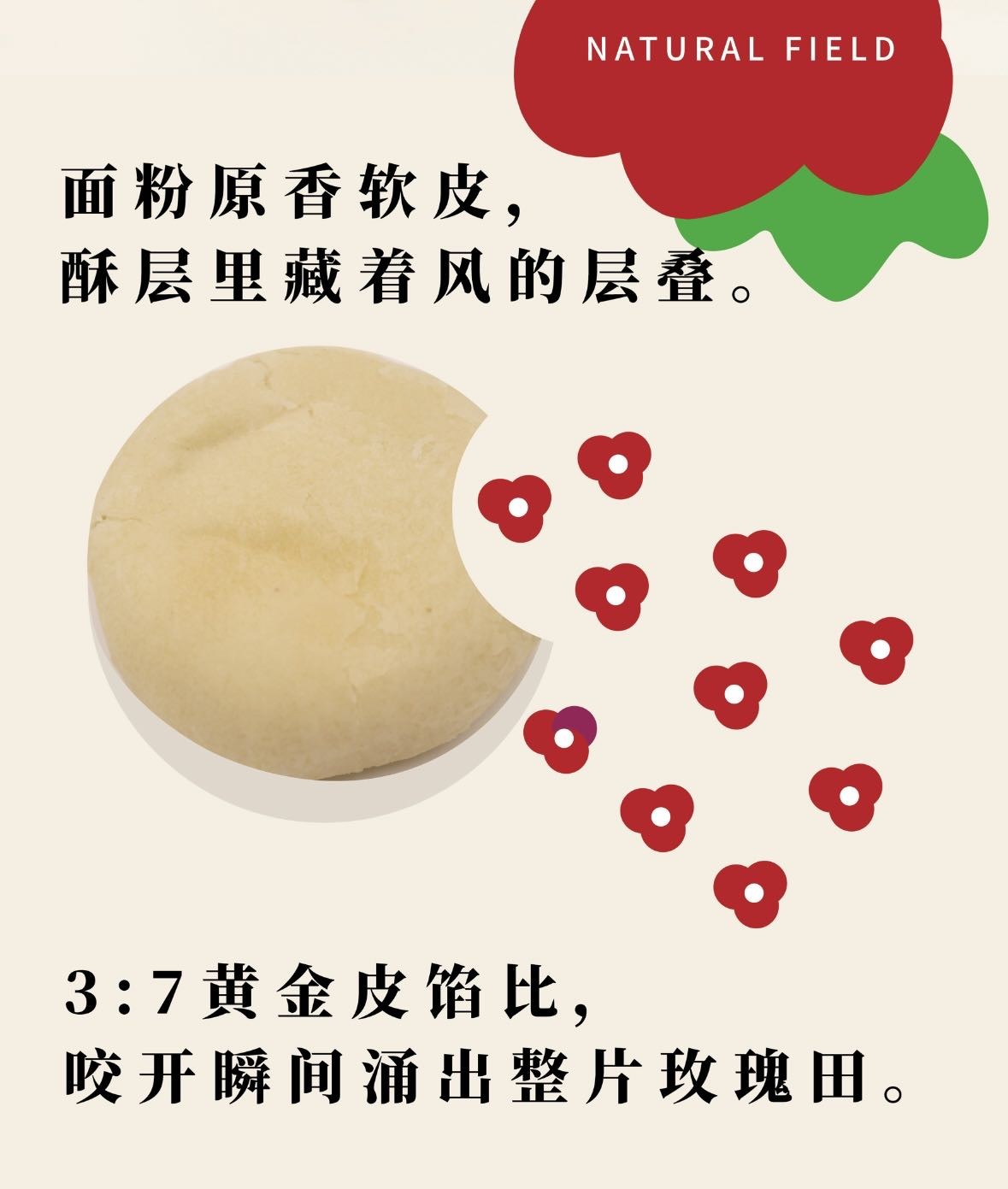 小麦粉更生态,玫瑰花馅更新鲜,黄油、糯米粉的精心调配让口感更宜人。一口咬下,酥皮纷落,清澈的玫瑰花馅,给你清爽的甜和素雅的花香。