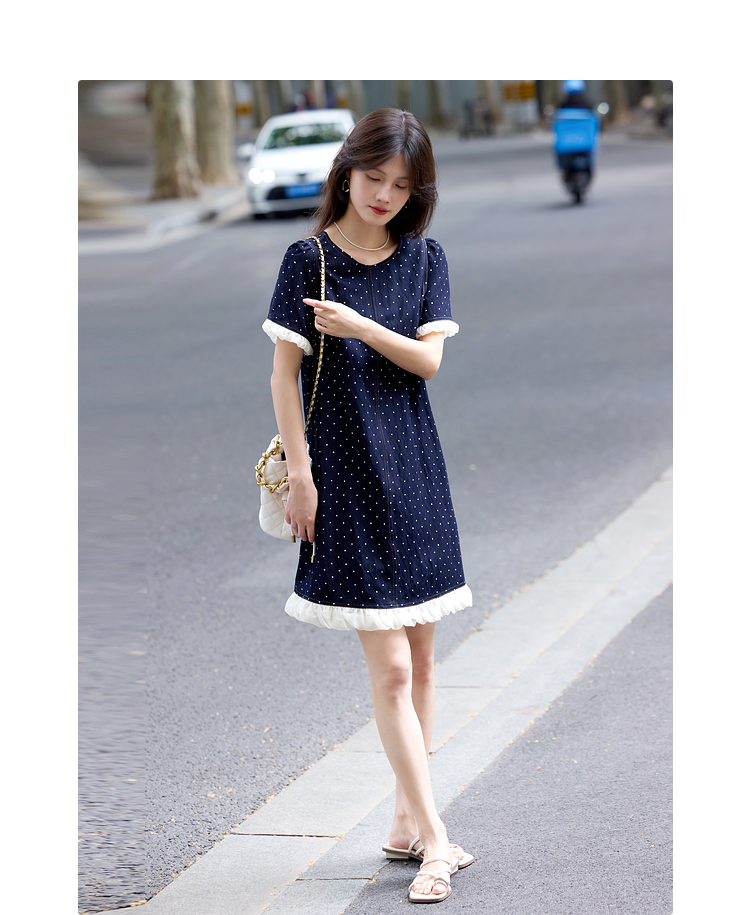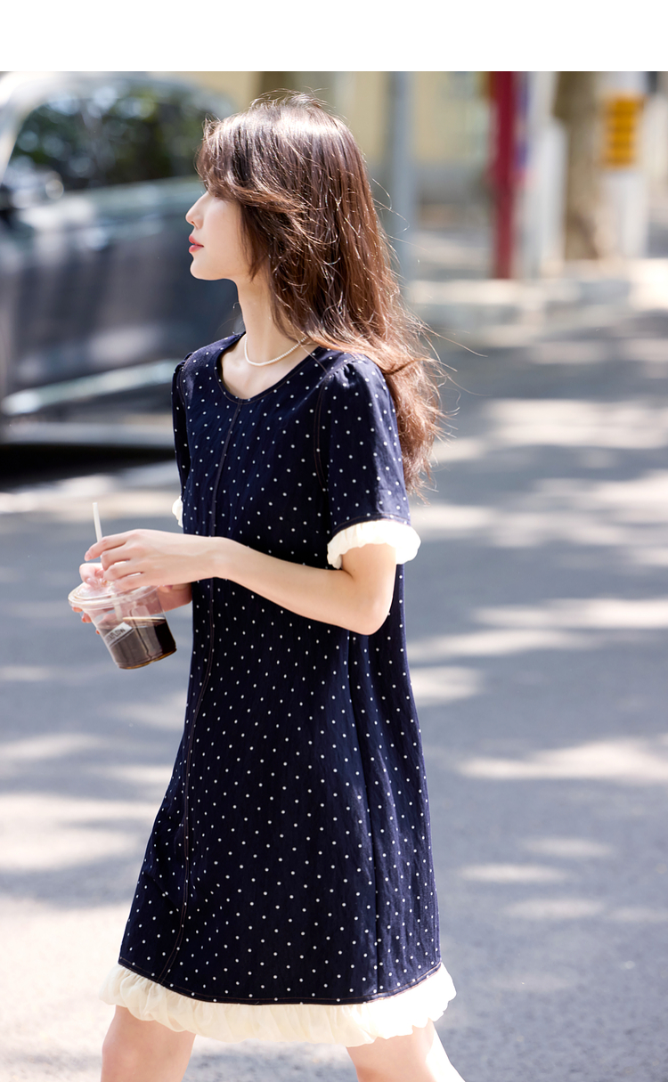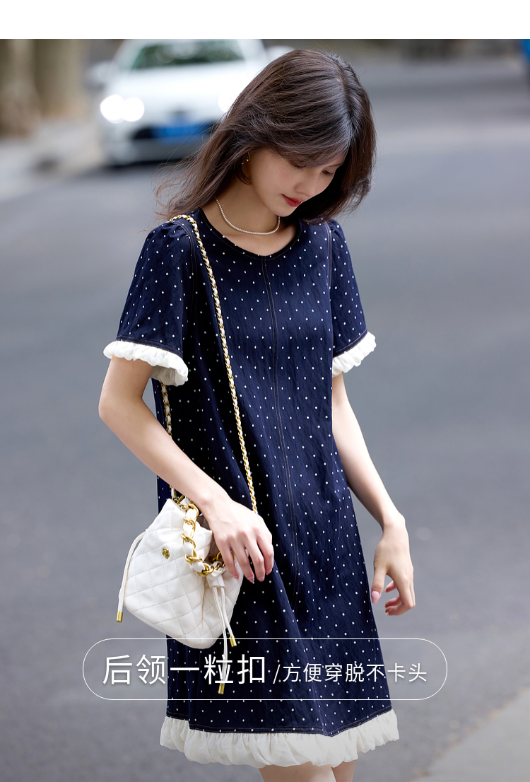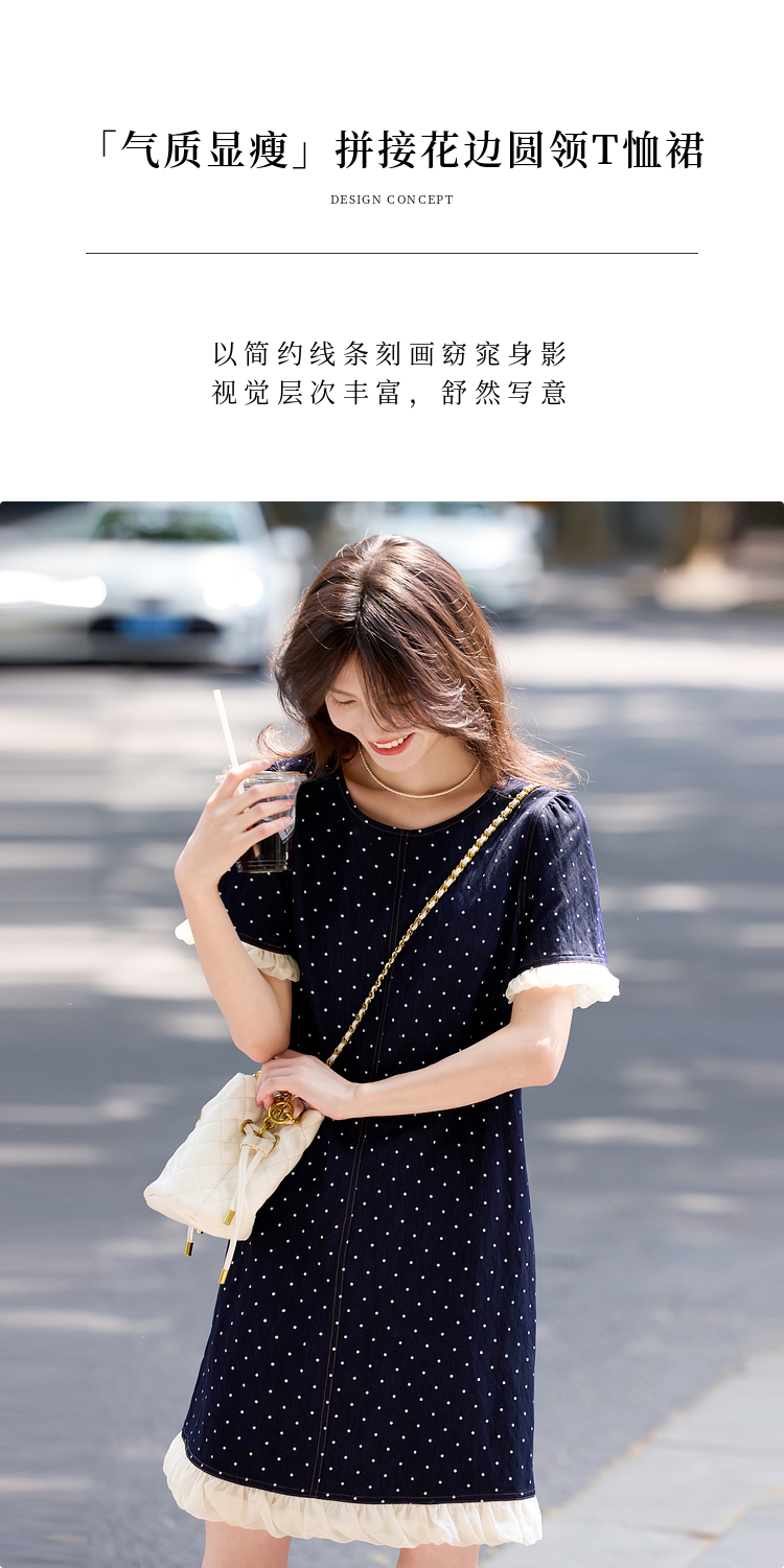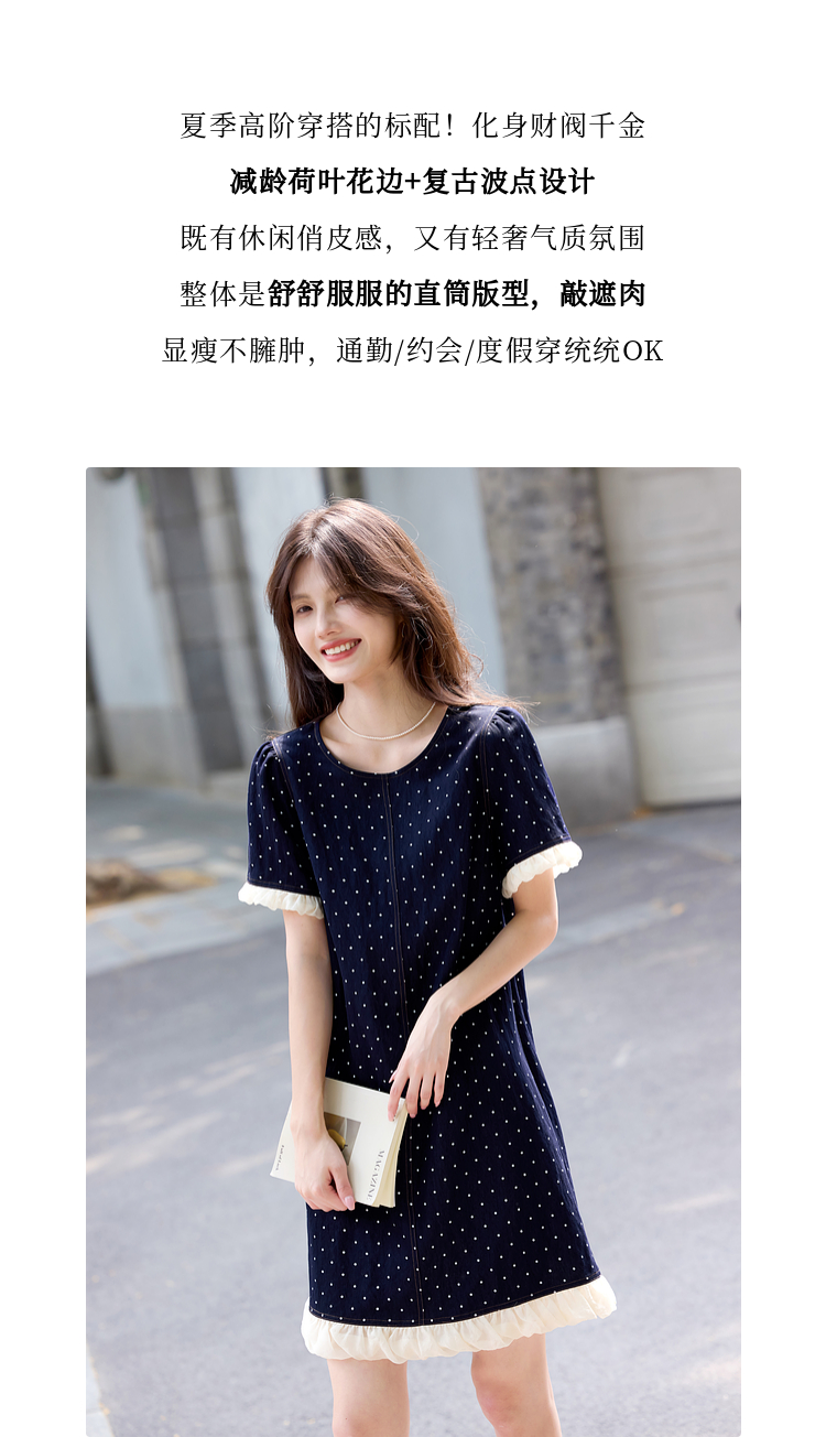 【专属特价】熙世界休闲风荷叶花边拼接短袖圆领复古波点连衣裙女2025夏日新款