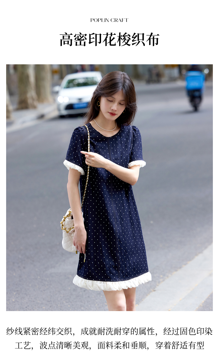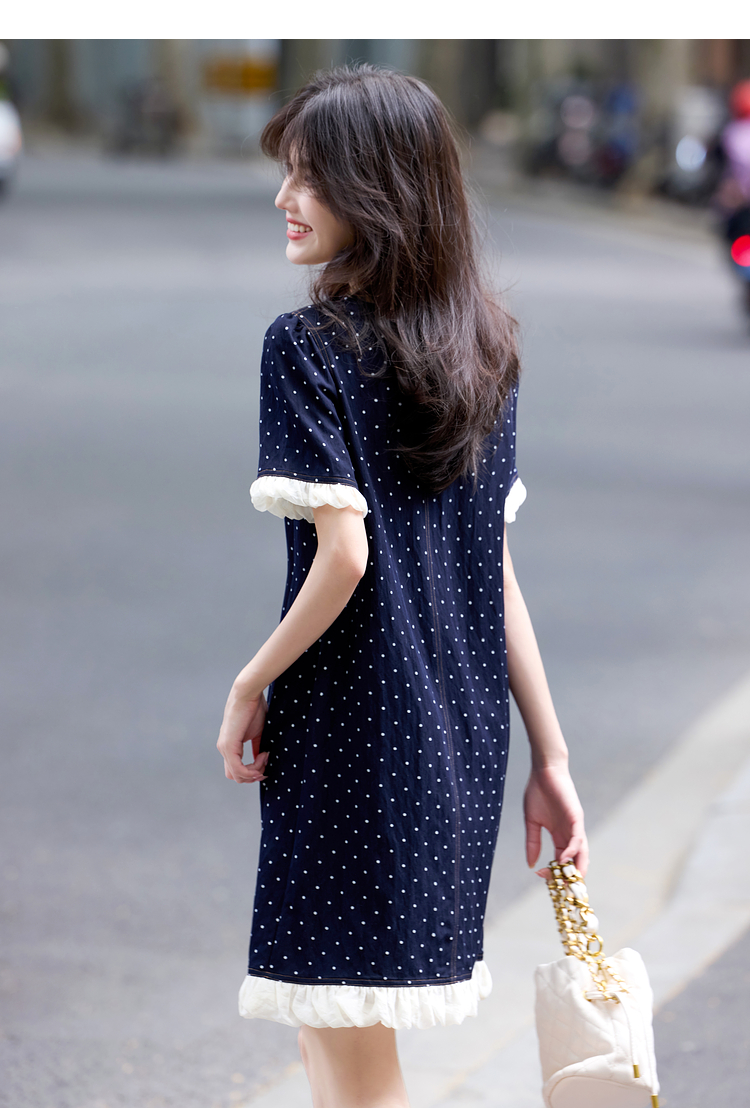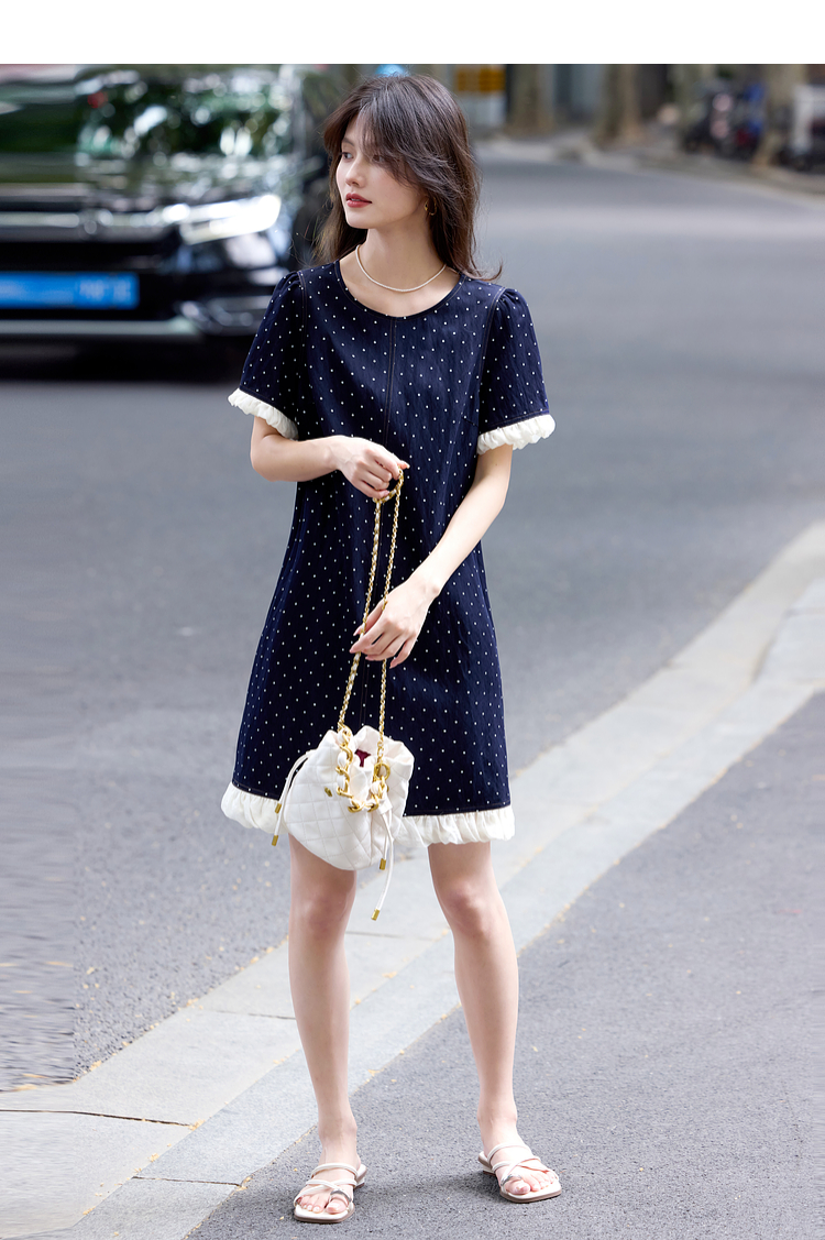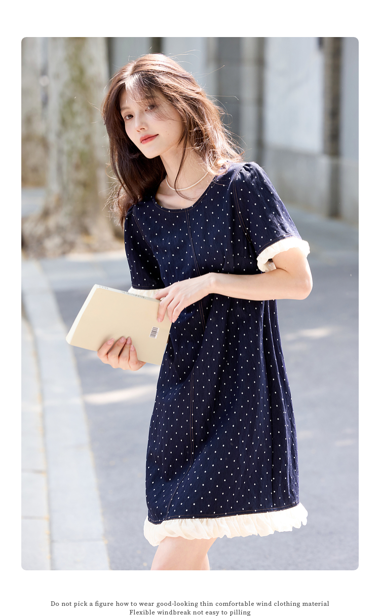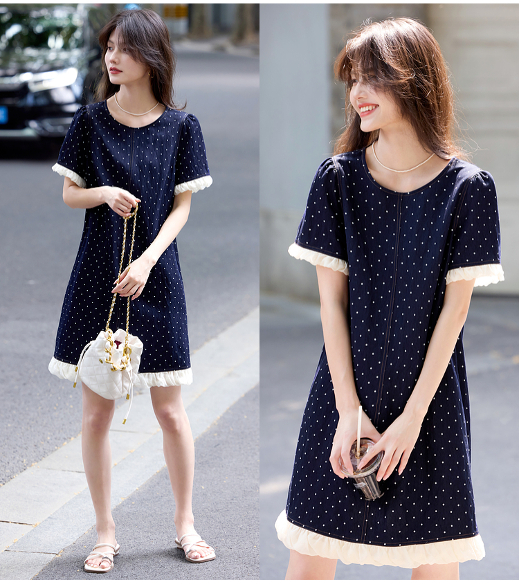 【专属特价】熙世界休闲风荷叶花边拼接短袖圆领复古波点连衣裙女2025夏日新款