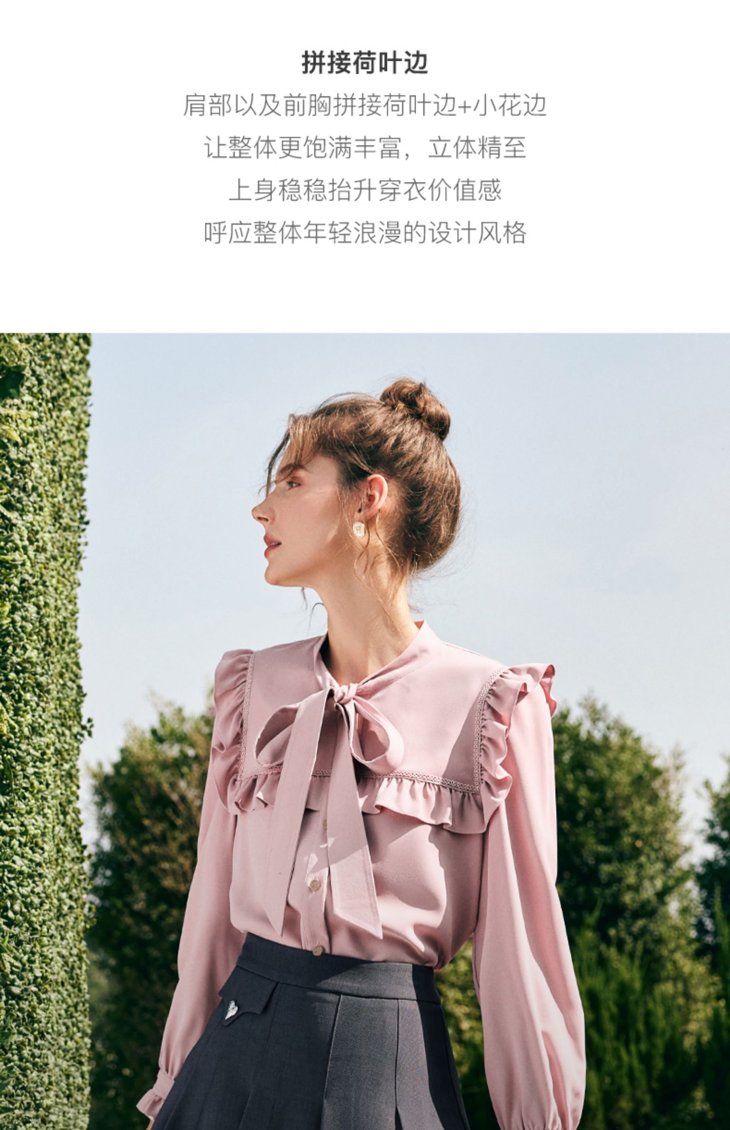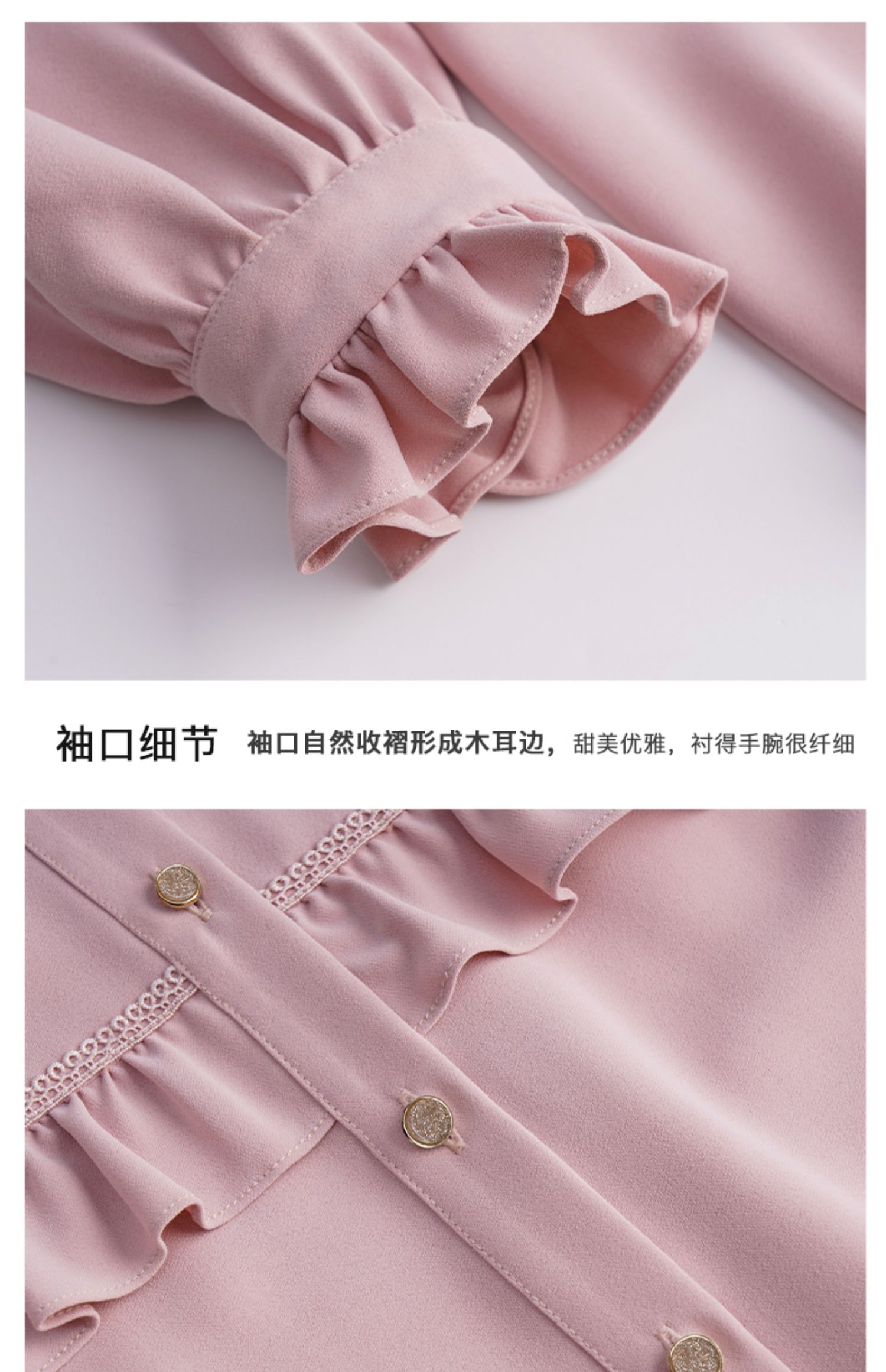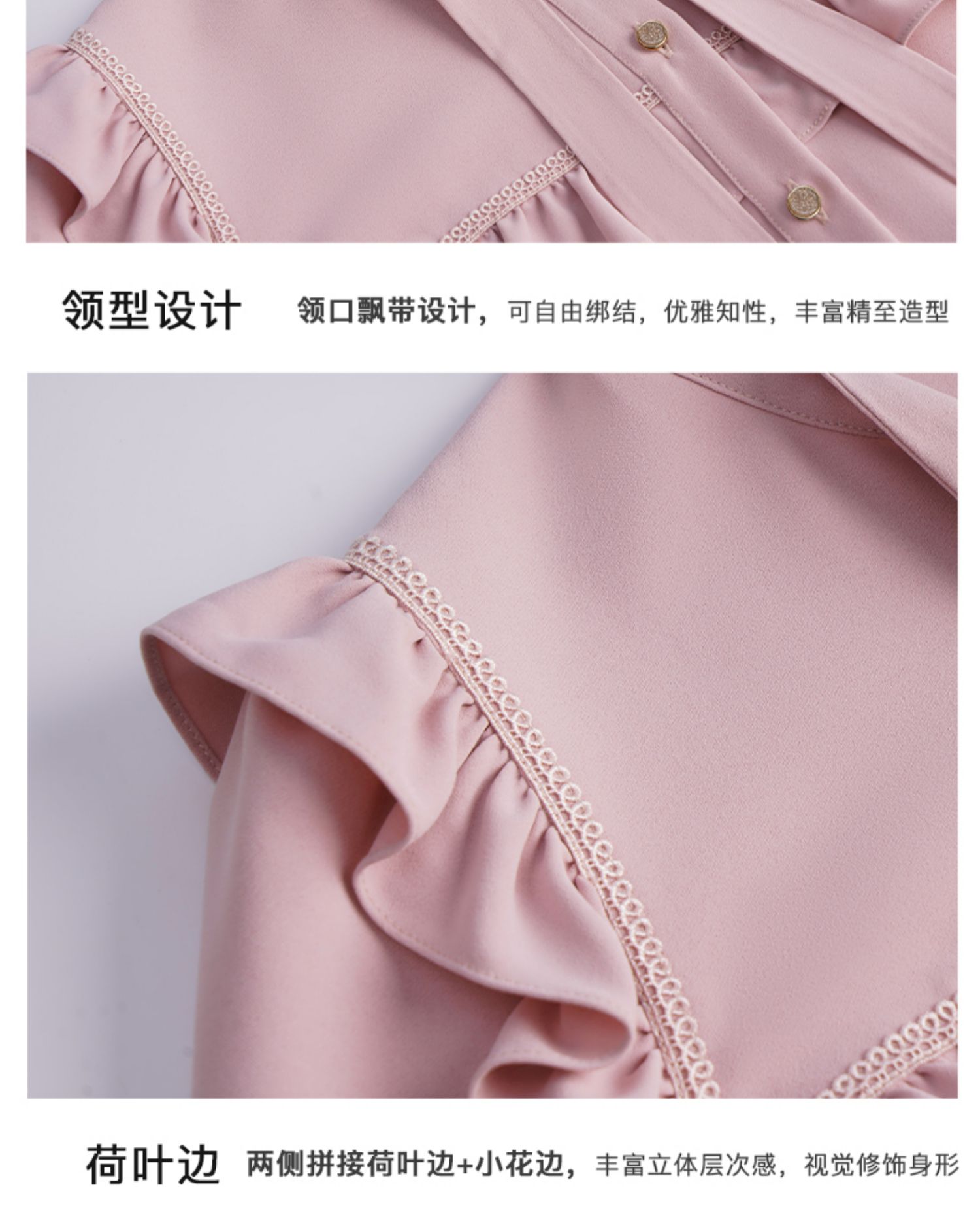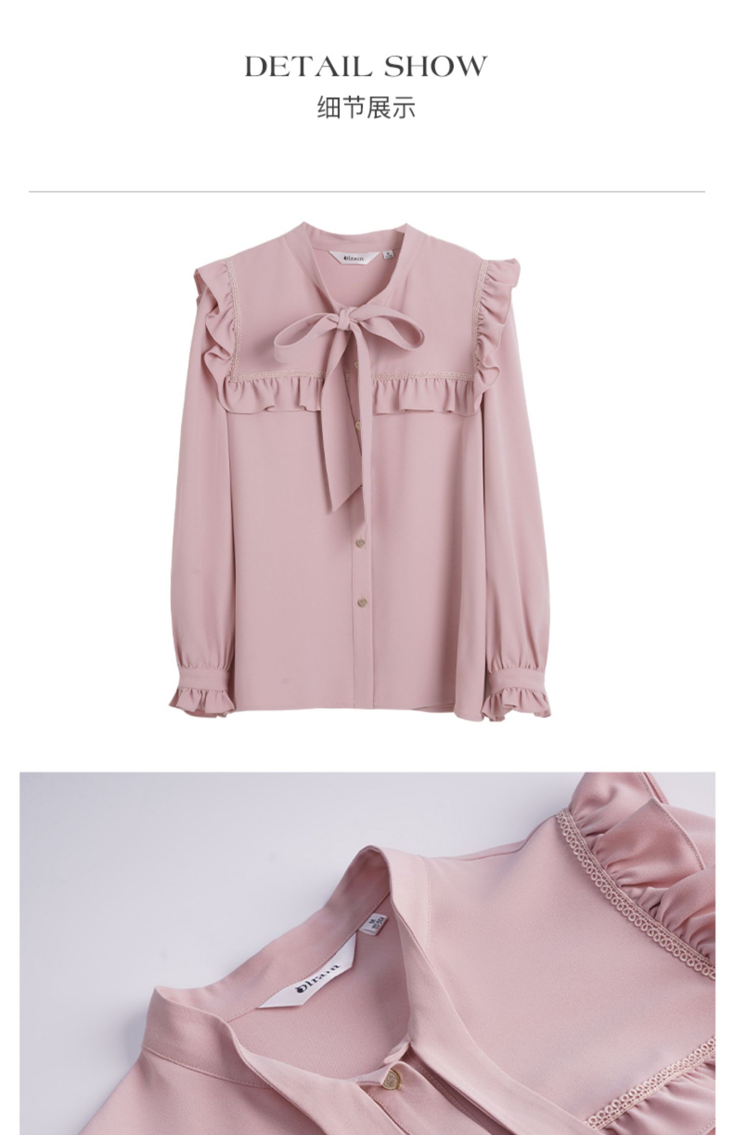 OLrain欧芮儿法式粉色蕾丝雪纺衫女秋季2023年新款荷叶边飘带衬衣