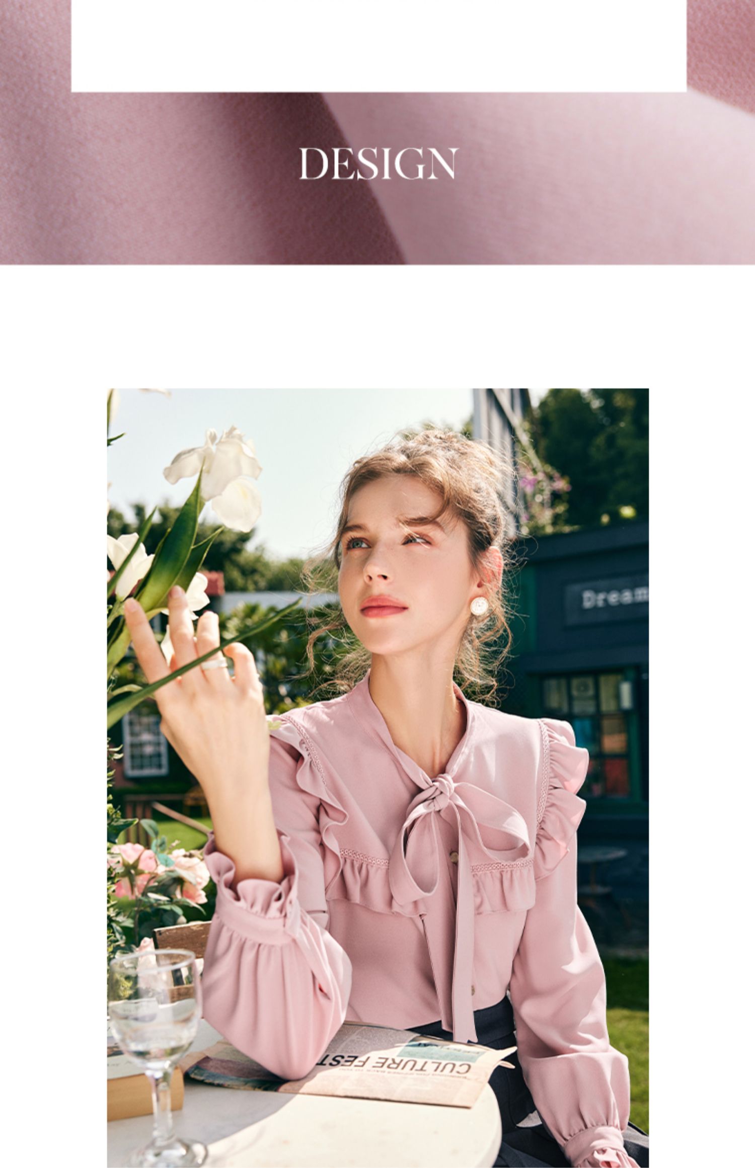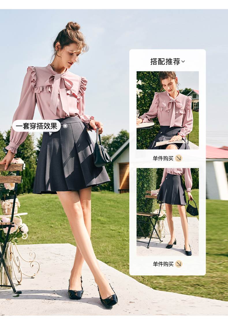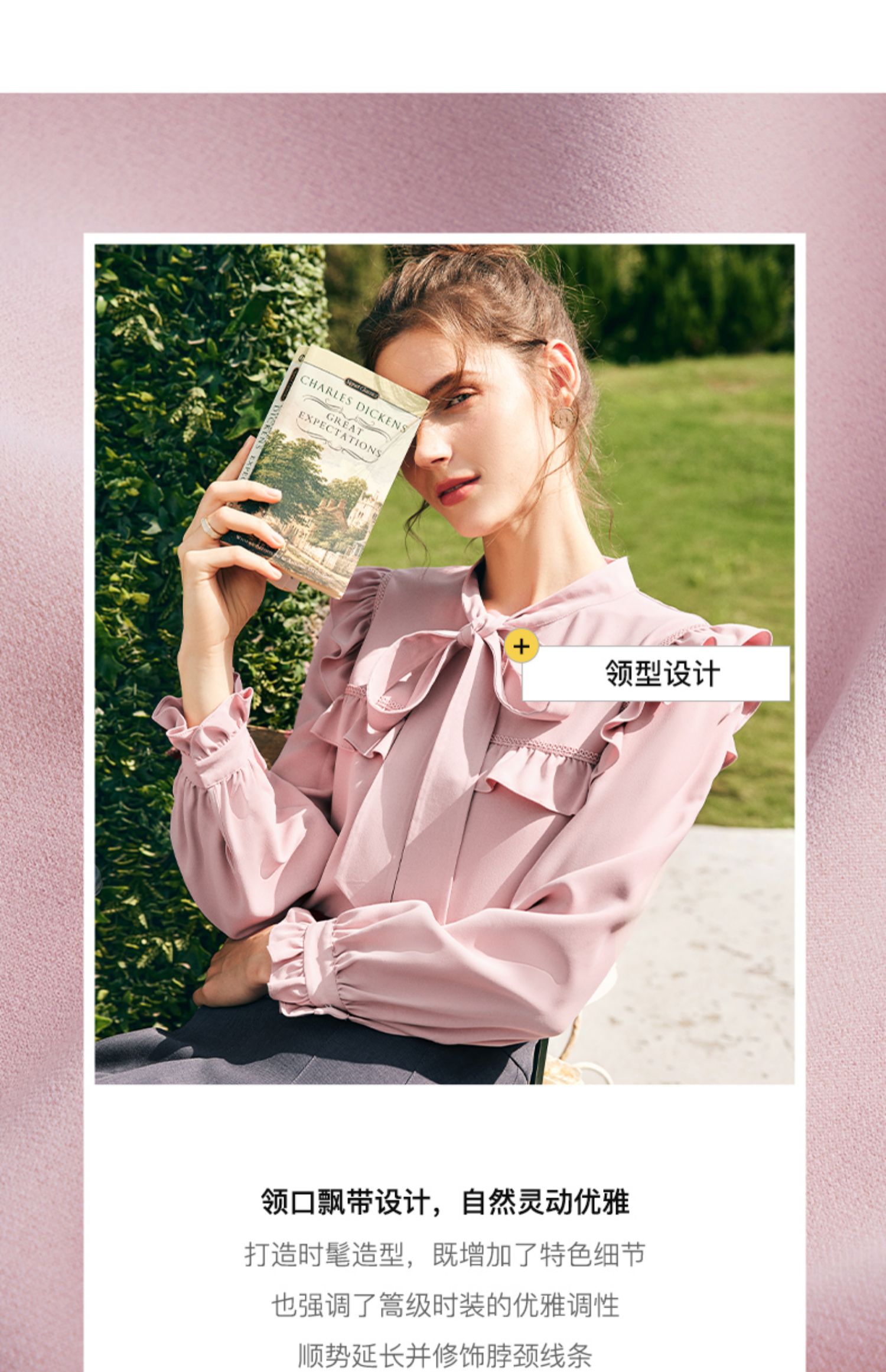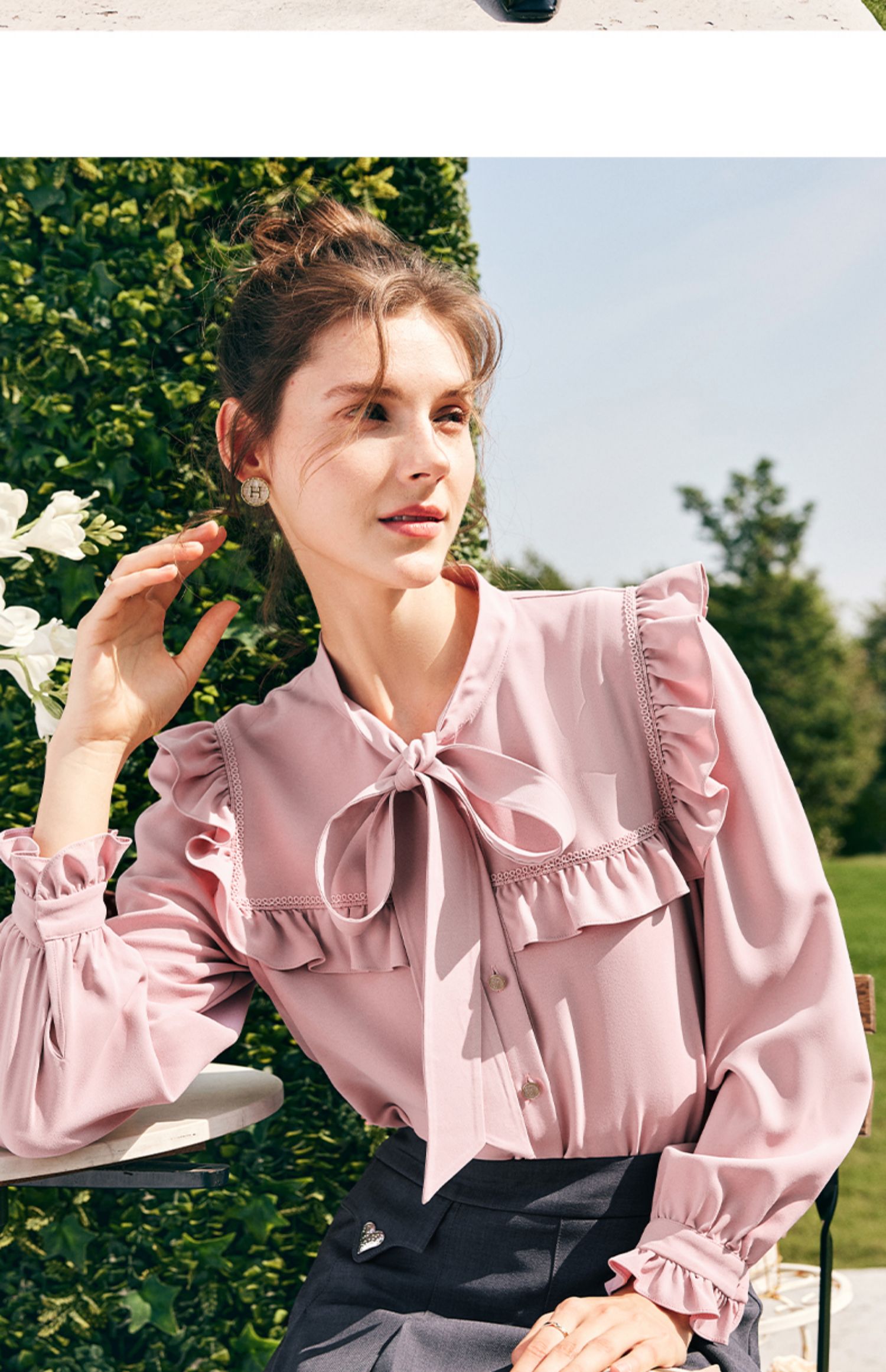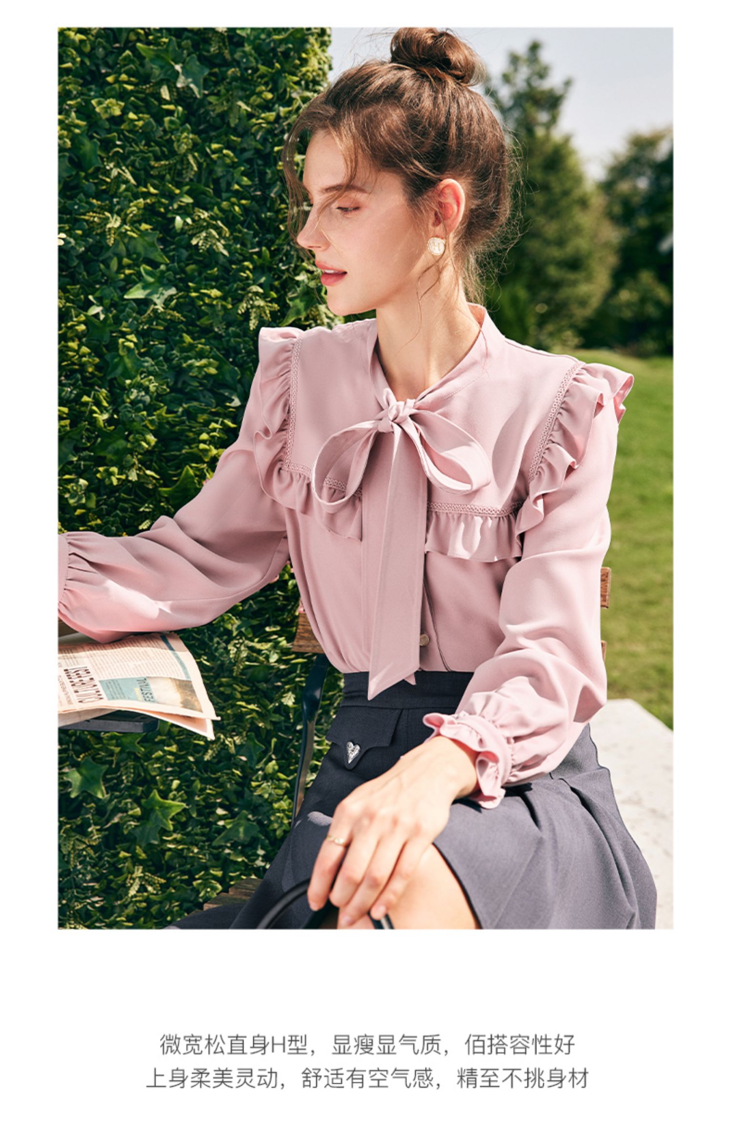OLrain欧芮儿法式粉色蕾丝雪纺衫女秋季2023年新款荷叶边飘带衬衣