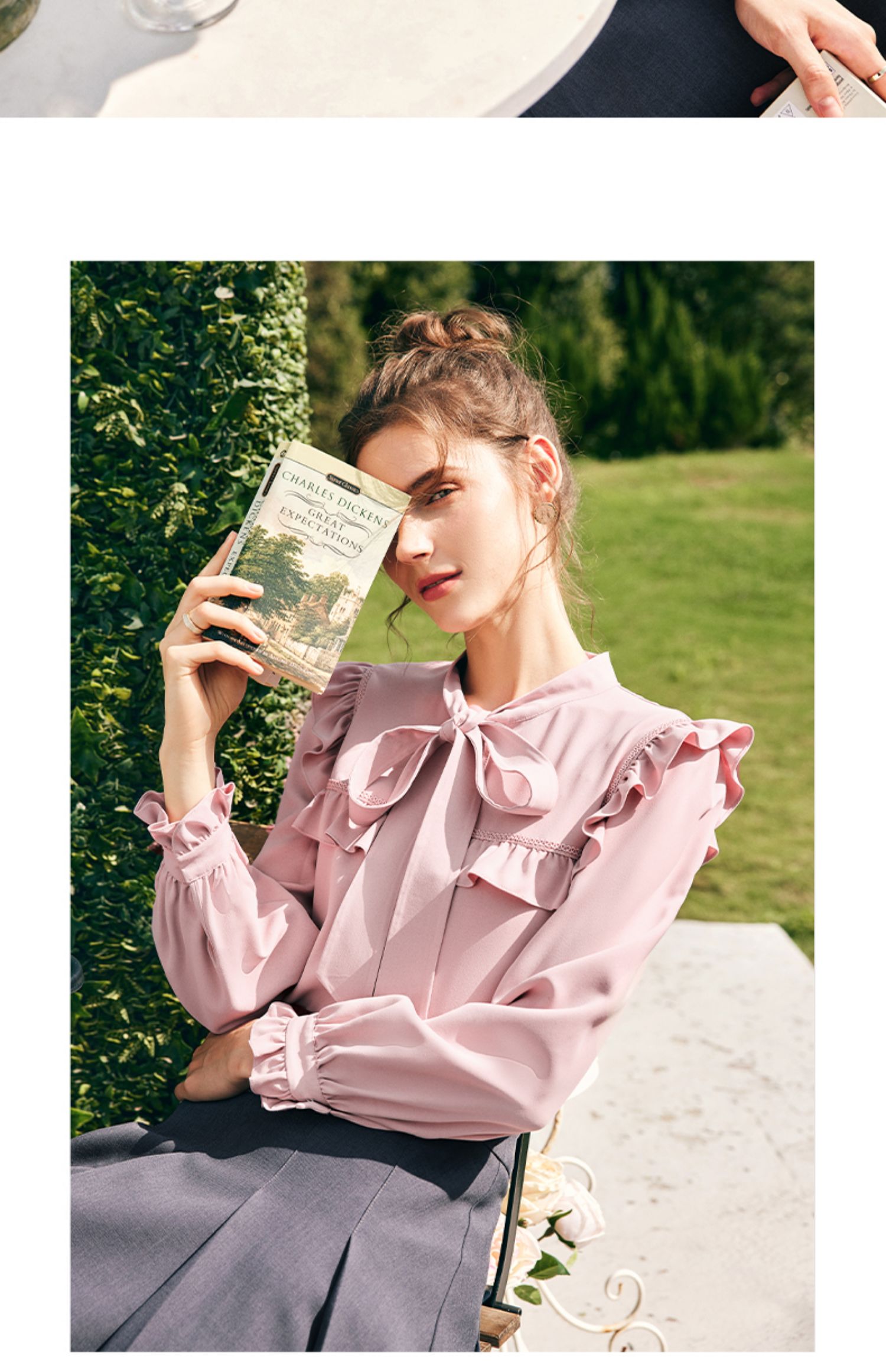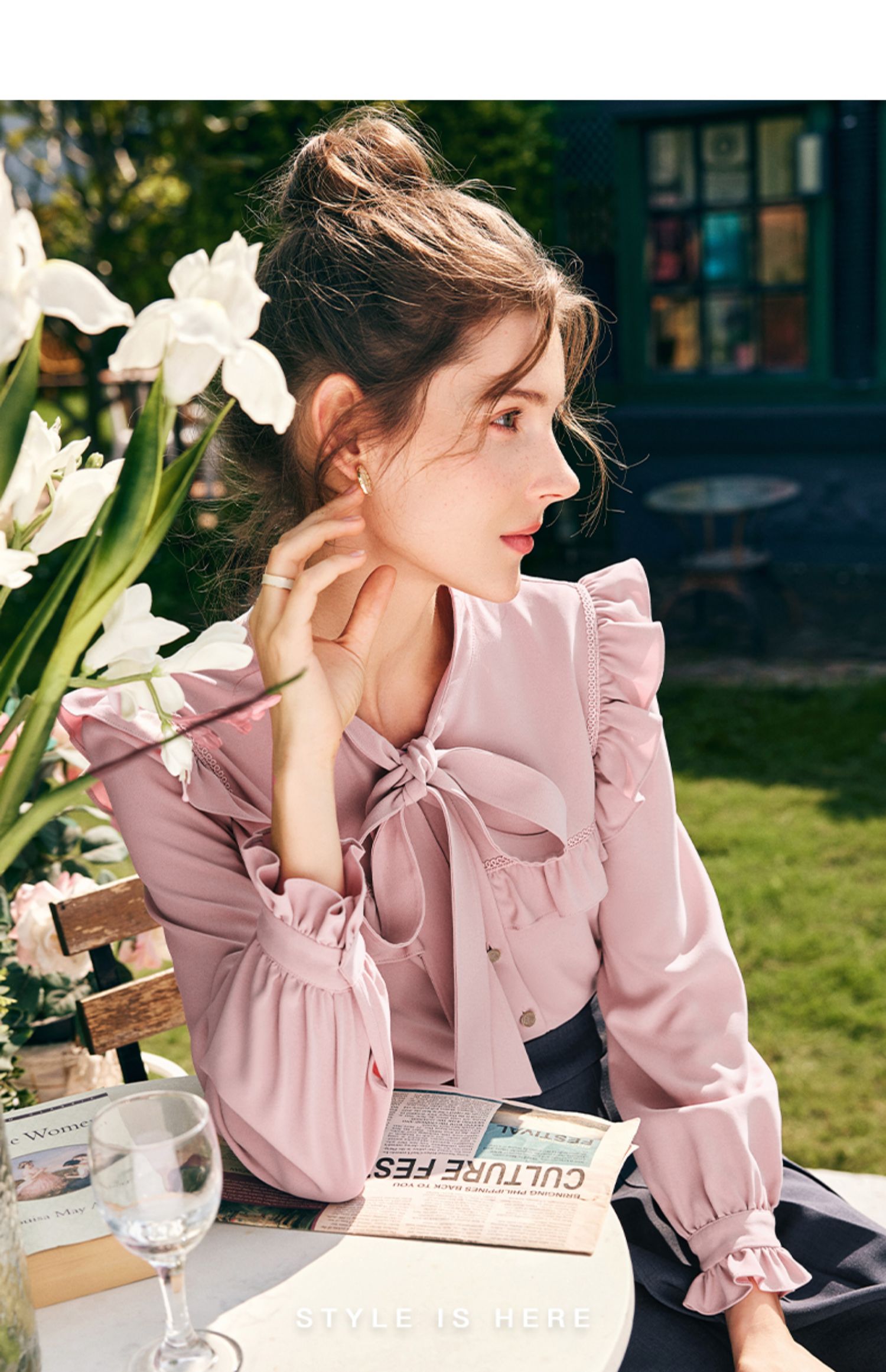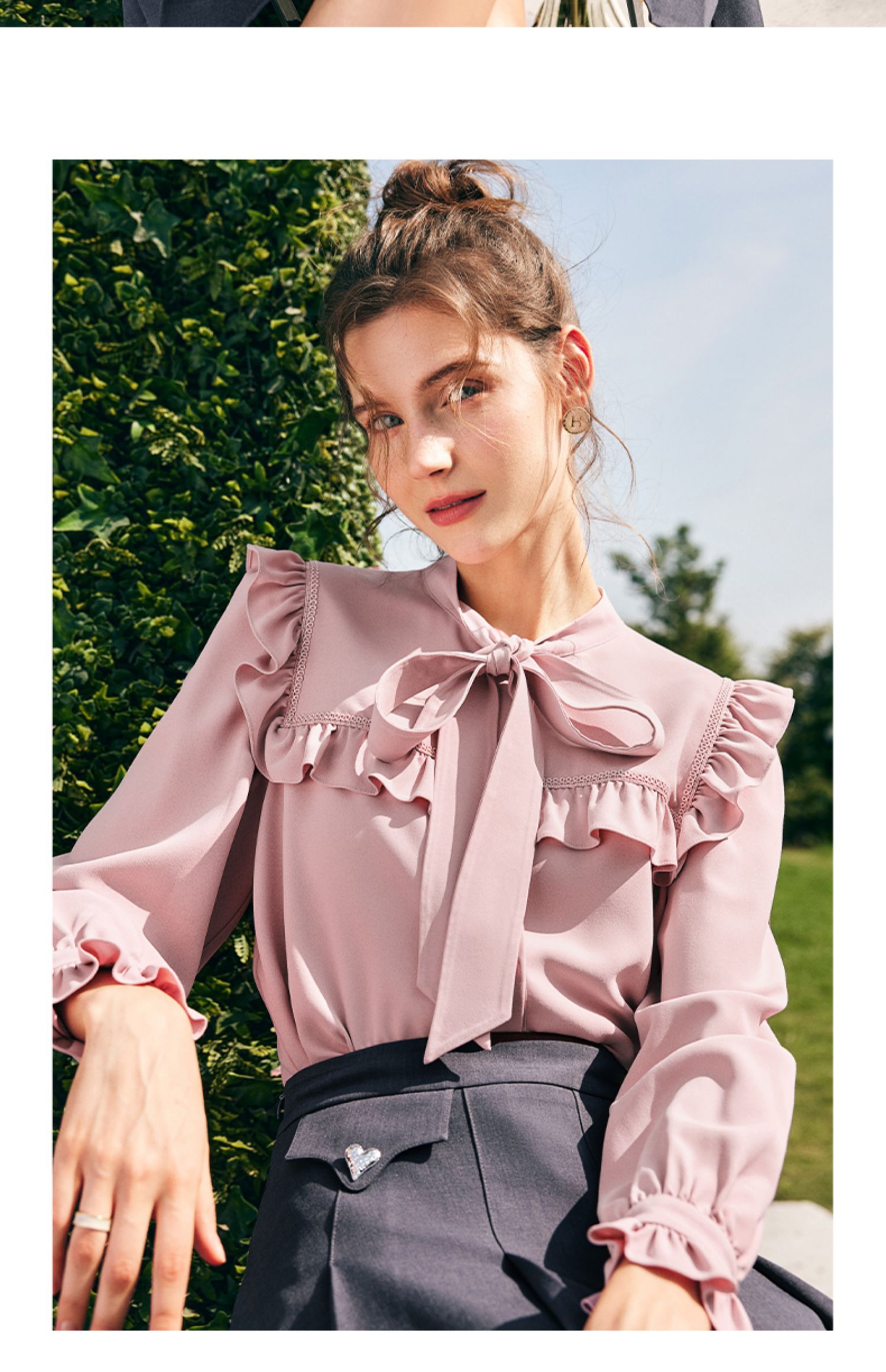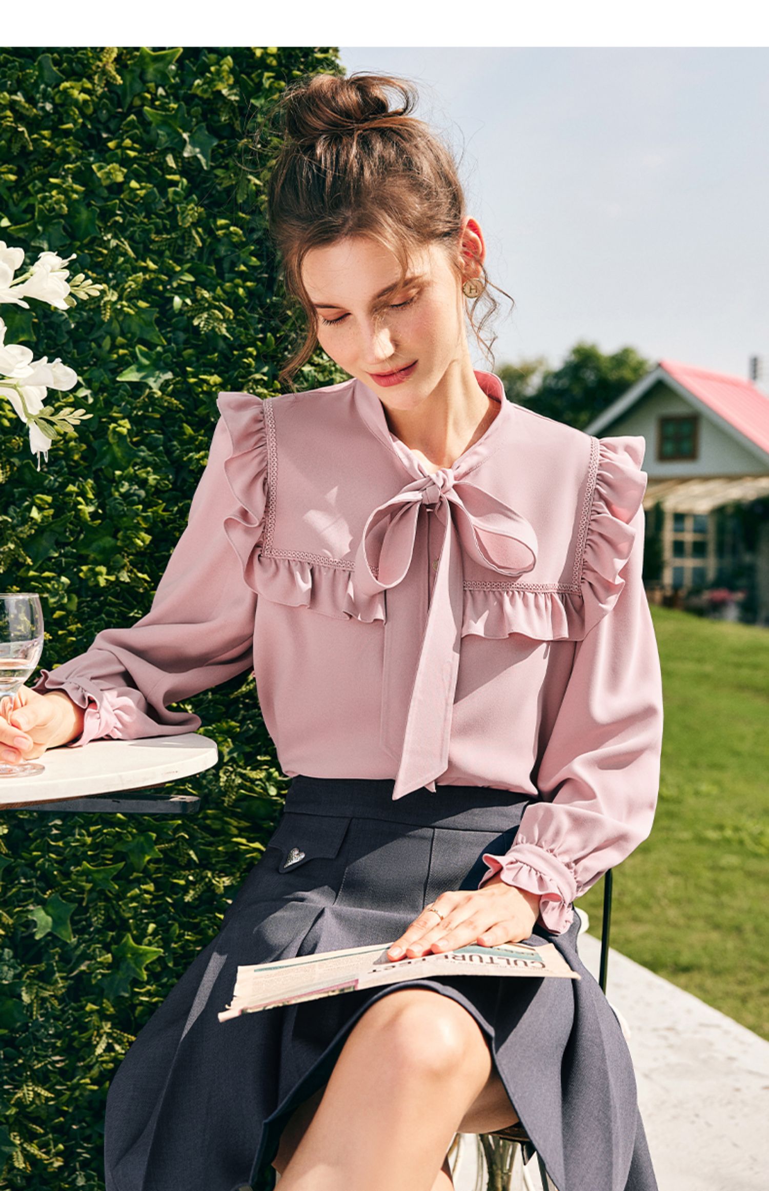 OLrain欧芮儿法式粉色蕾丝雪纺衫女秋季2023年新款荷叶边飘带衬衣