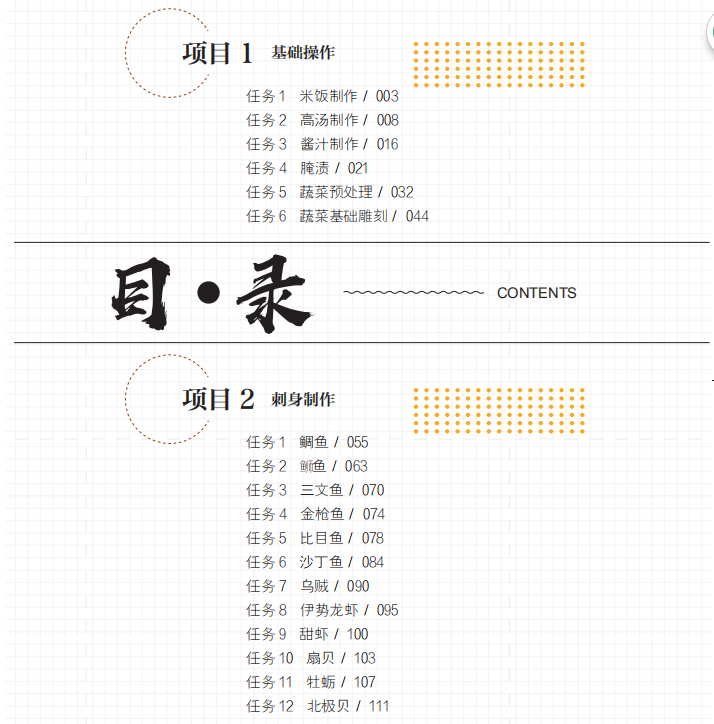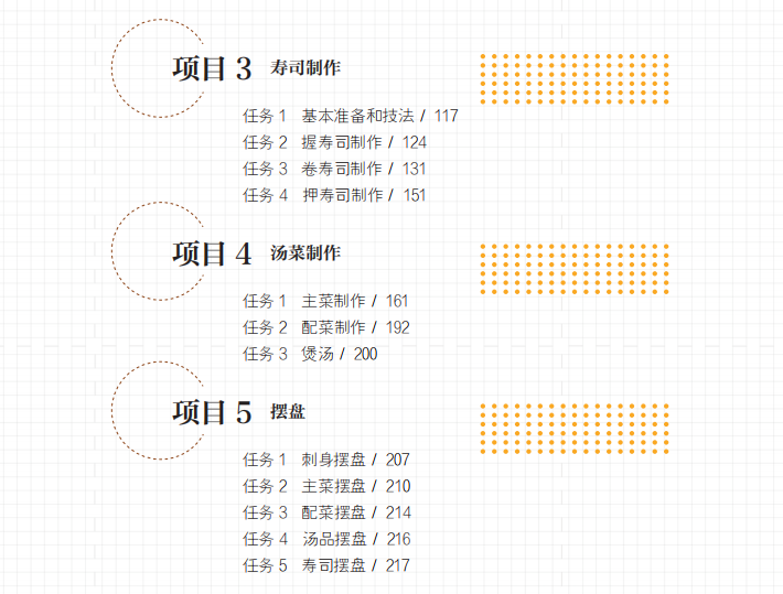 本教材在编写中根据岗位工作特点,以能力培养为根本出发点,采用模块化的编写方式。全书共分为5个项目,内容包括:基础操作、刺身制作、寿司制作、汤菜制作、摆盘等。
