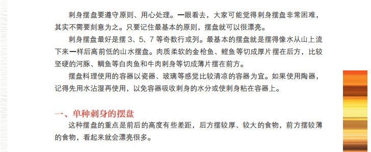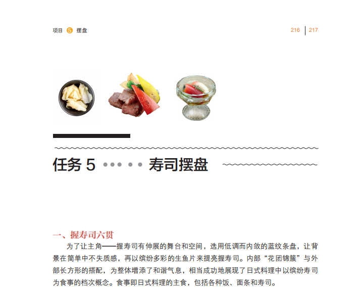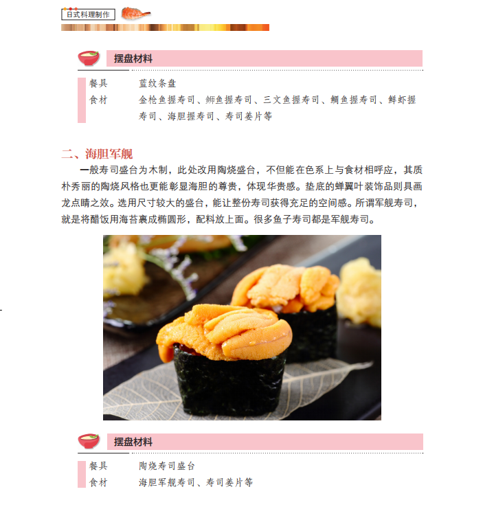 通过本教材学习,学员应能掌握日式料理的基础操作、刺身制作、寿司制作、汤菜制作、摆盘等。