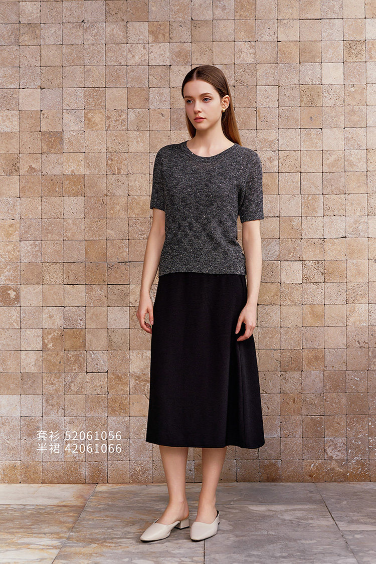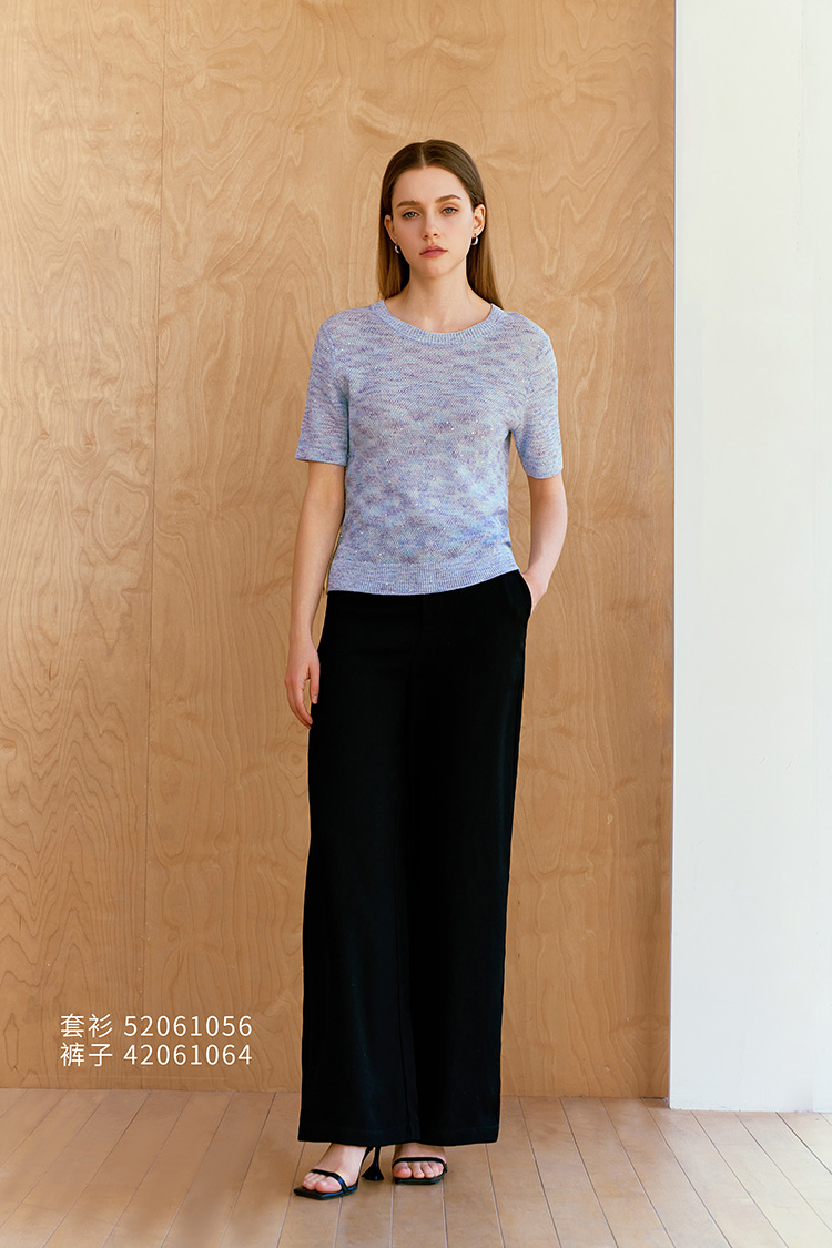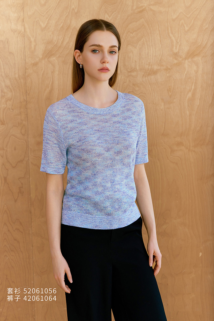 【棉麻亮片装饰套衫】26年春夏新品女士圆领短袖针织套衫混色上衣