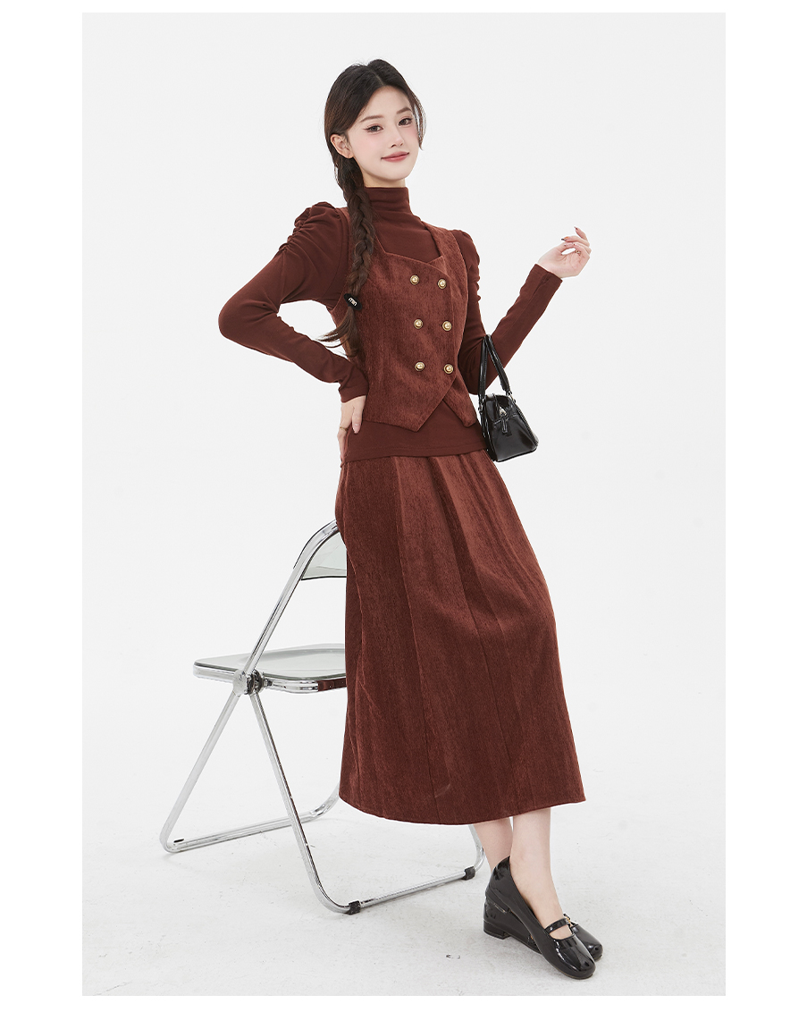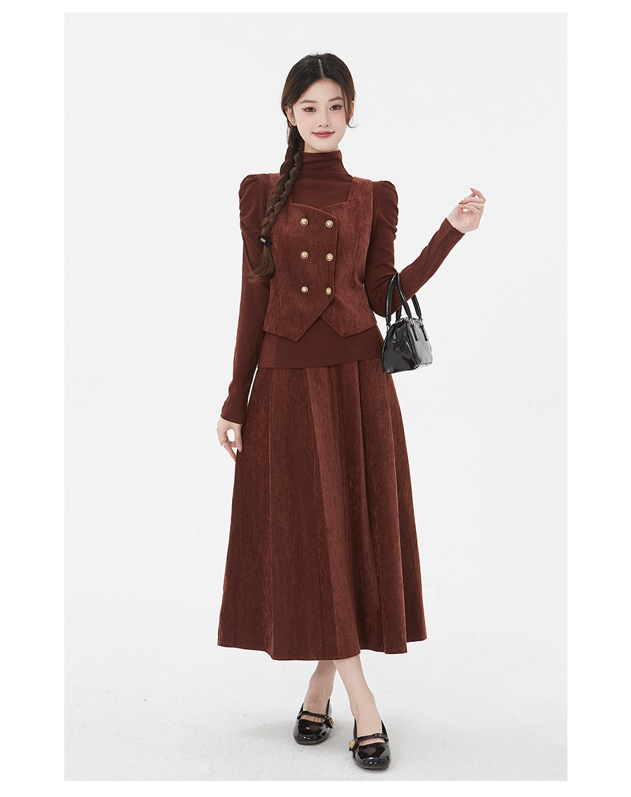 P&X设计师女装春季复古抽褶高领套装长裙825114012 枣红