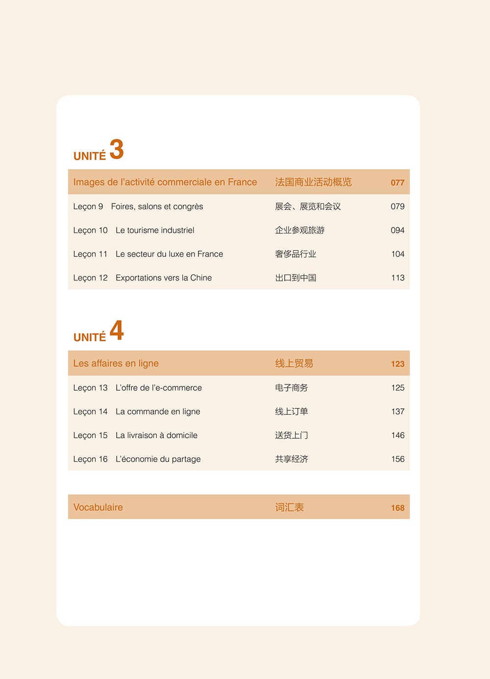 教材下设四个单元:法国经济面面观、走入法国职场、法国商业活动概览、线上贸易。通过学习本教材,学生可以: