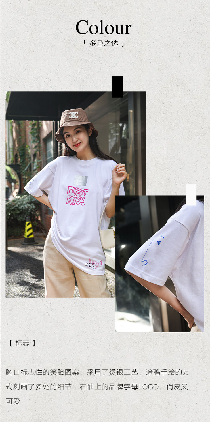 有机长绒棉/烫银笑脸印花AS宽松T恤-男女版 QH382