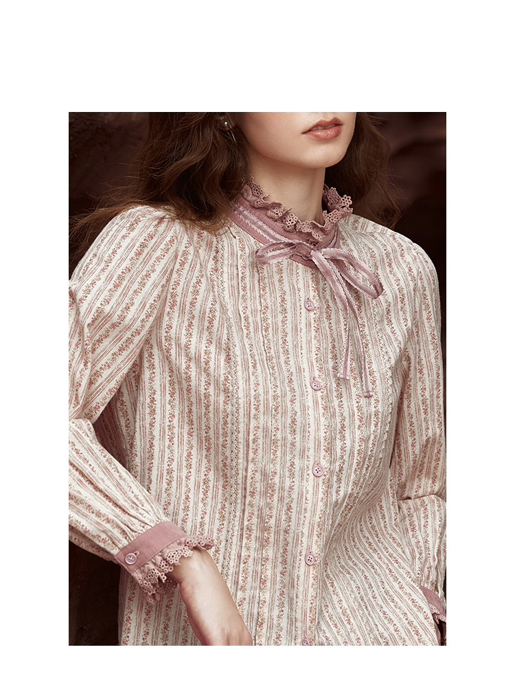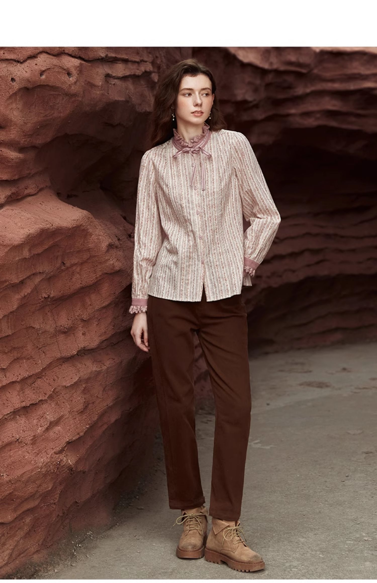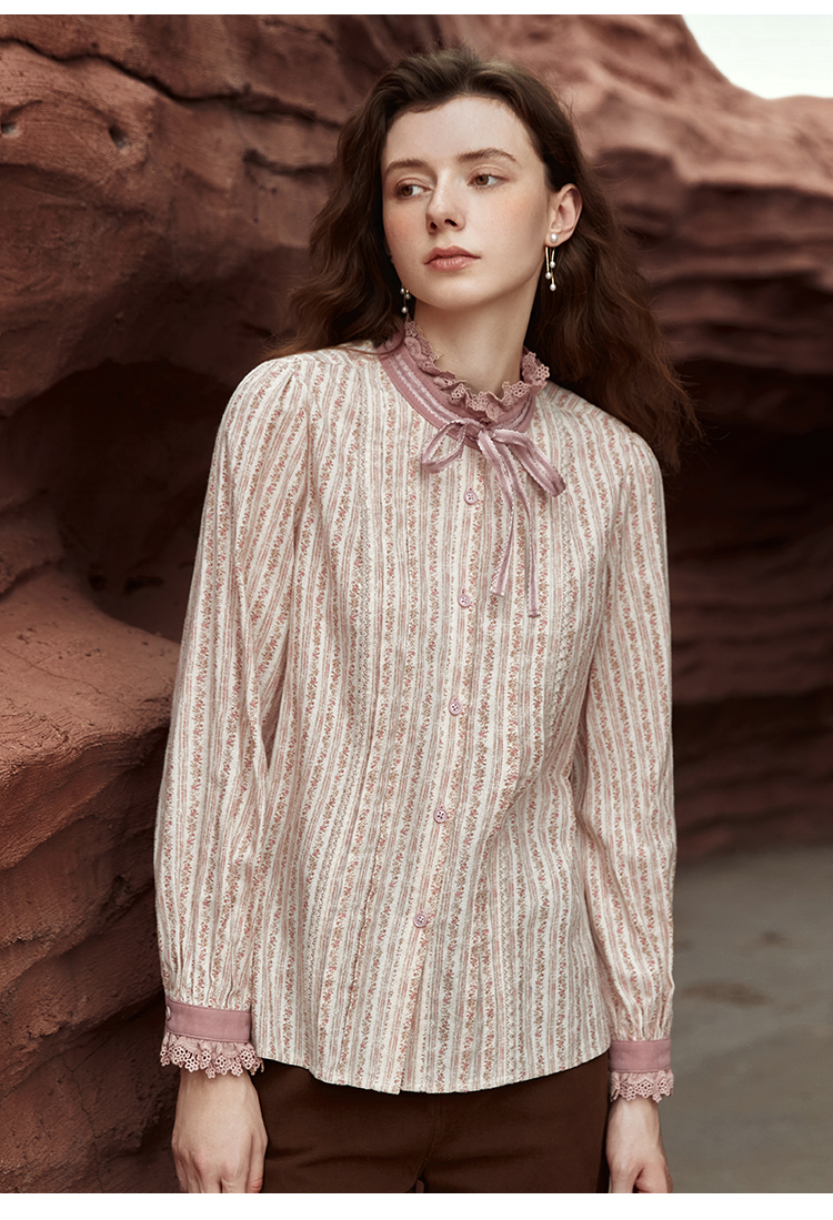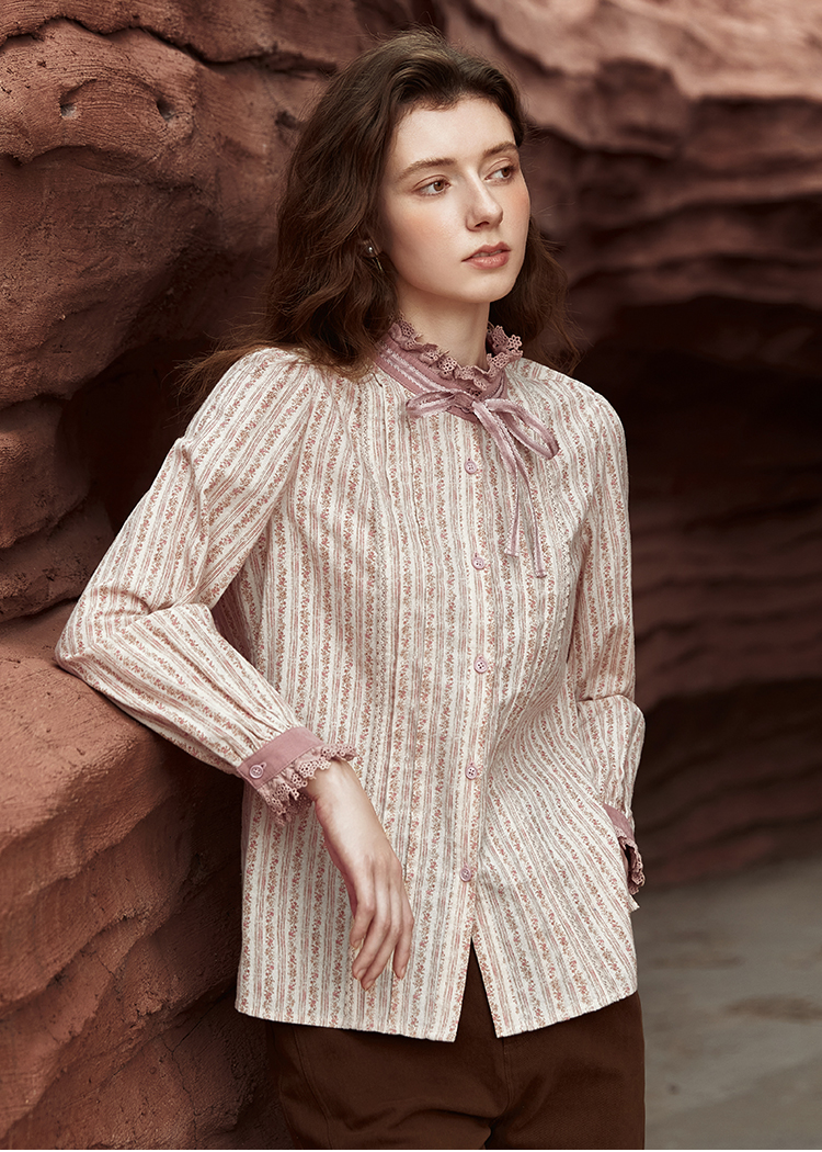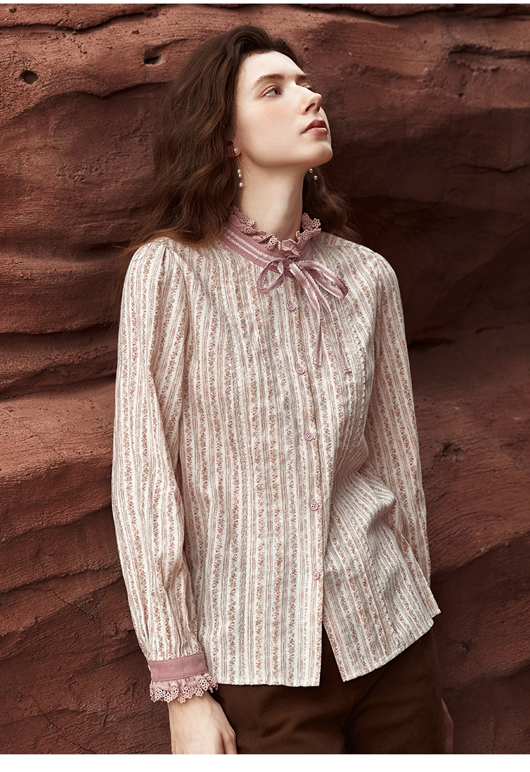 Famecoco范可儿立领拼接衬衫粉色内搭长袖衬衣秋冬款FAB8BH001