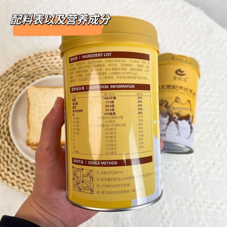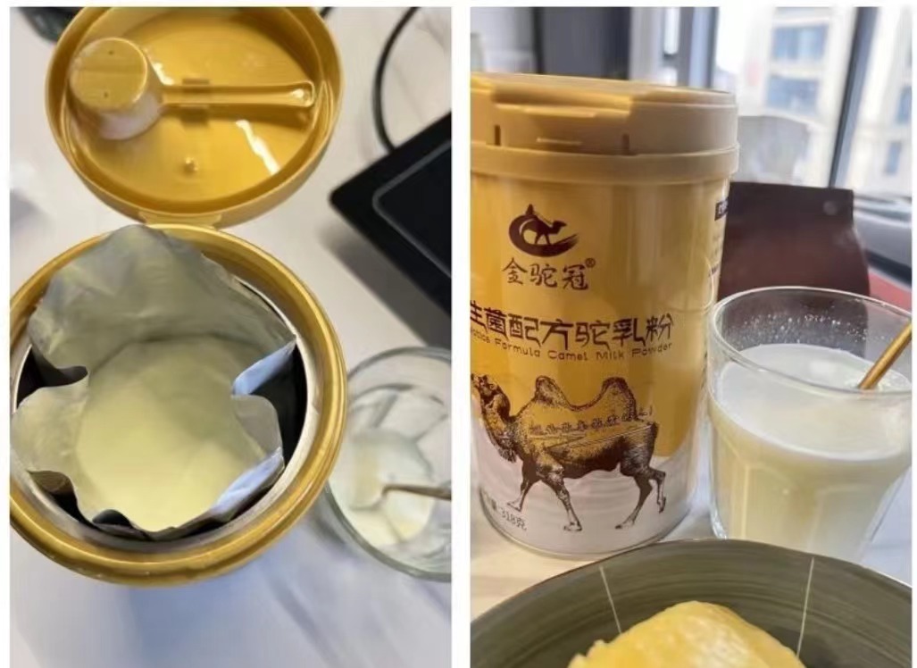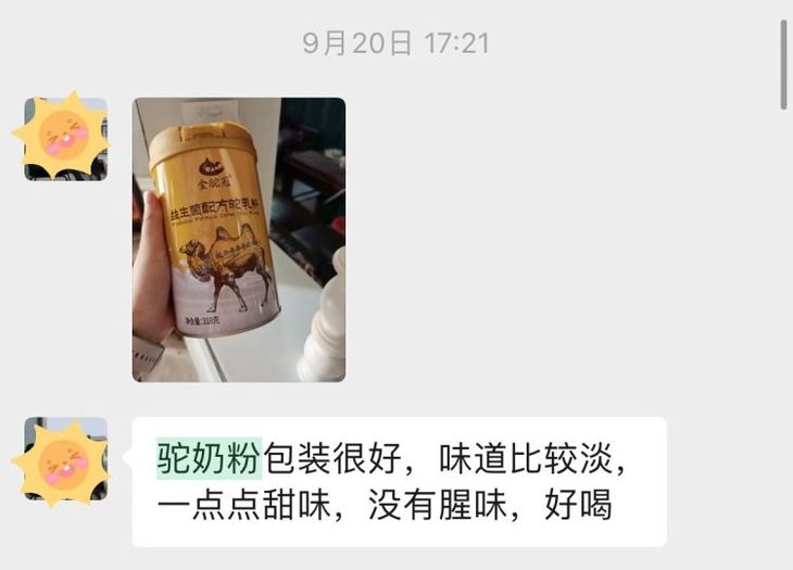 2.金驼冠驼乳粉加工工艺成熟,经评测及用户反馈,绝大多数人不会感受到有腥膻味,有少部分人群对膻味及其敏感人群,能喝出一点腥味,但也在可接受范围内(还有一部分人群能喝出微微的咸味)。