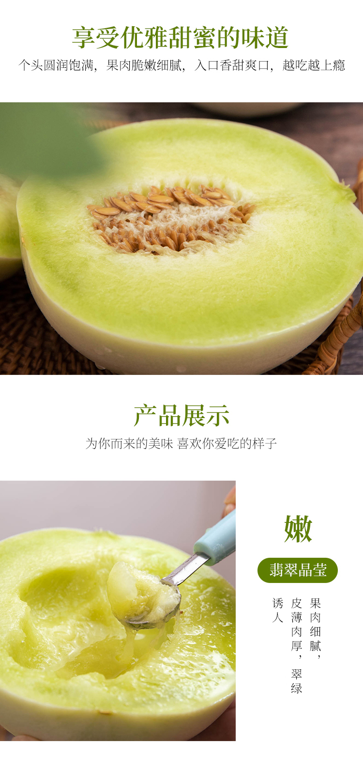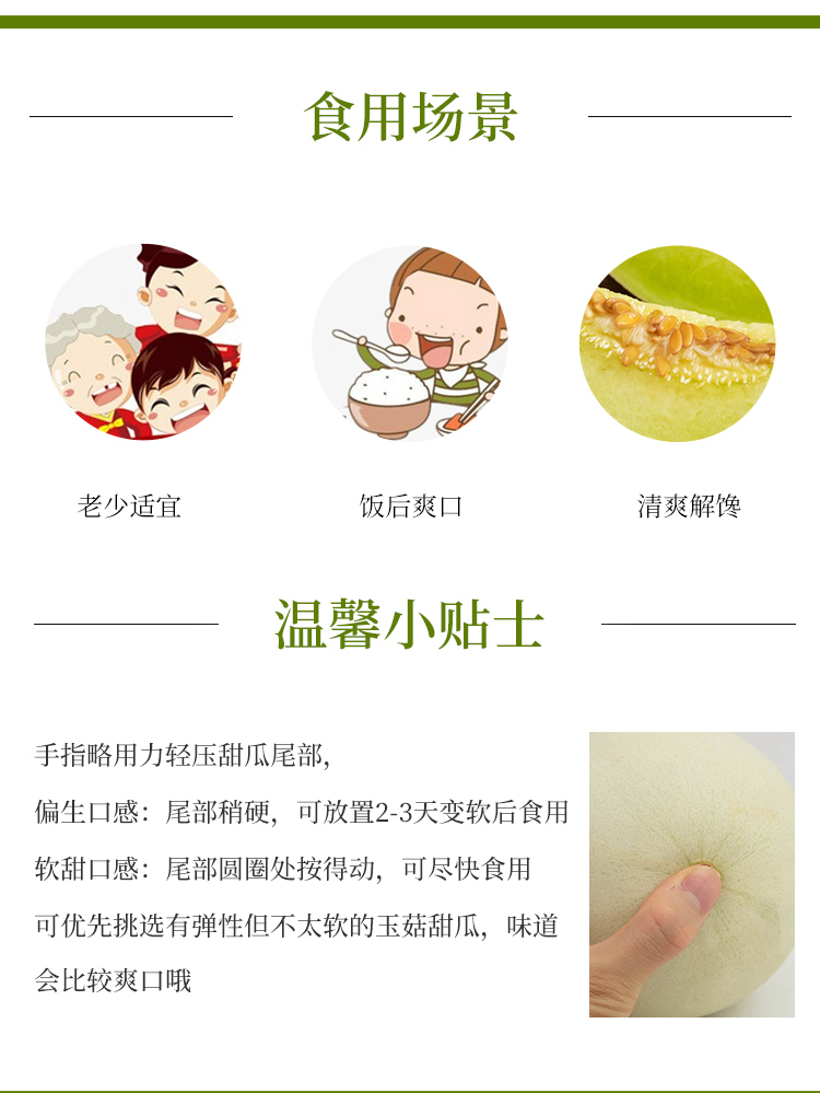2.手指略用力摁压甜瓜尾部,软了即可食用,口感更佳