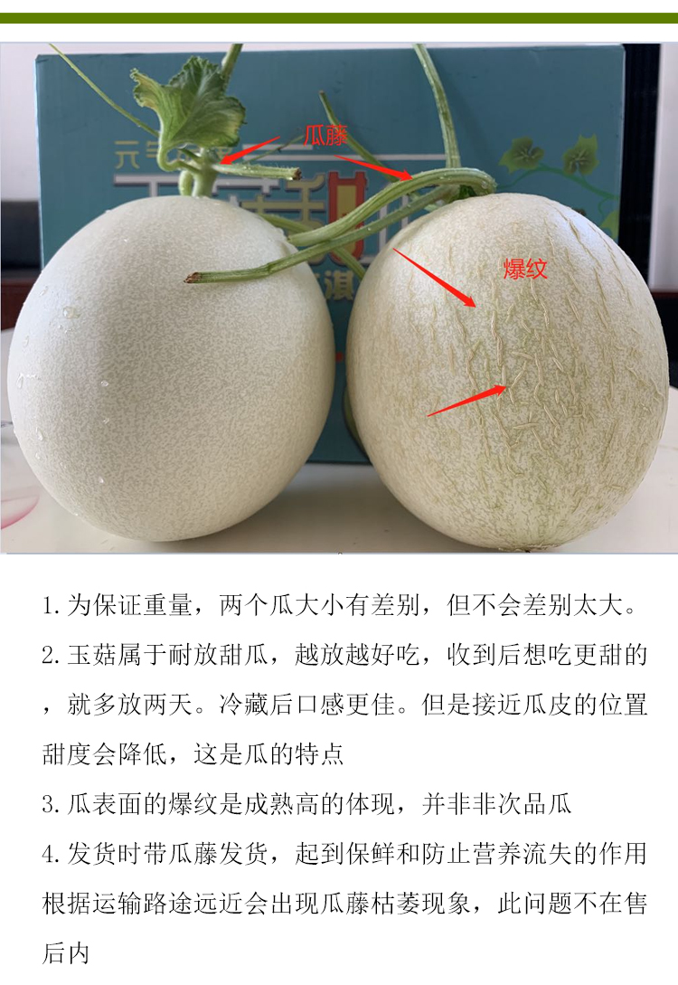 1.玉菇甜瓜自然生长,个别外皮存在花点斑点现象,不影响食用,介意者慎拍
