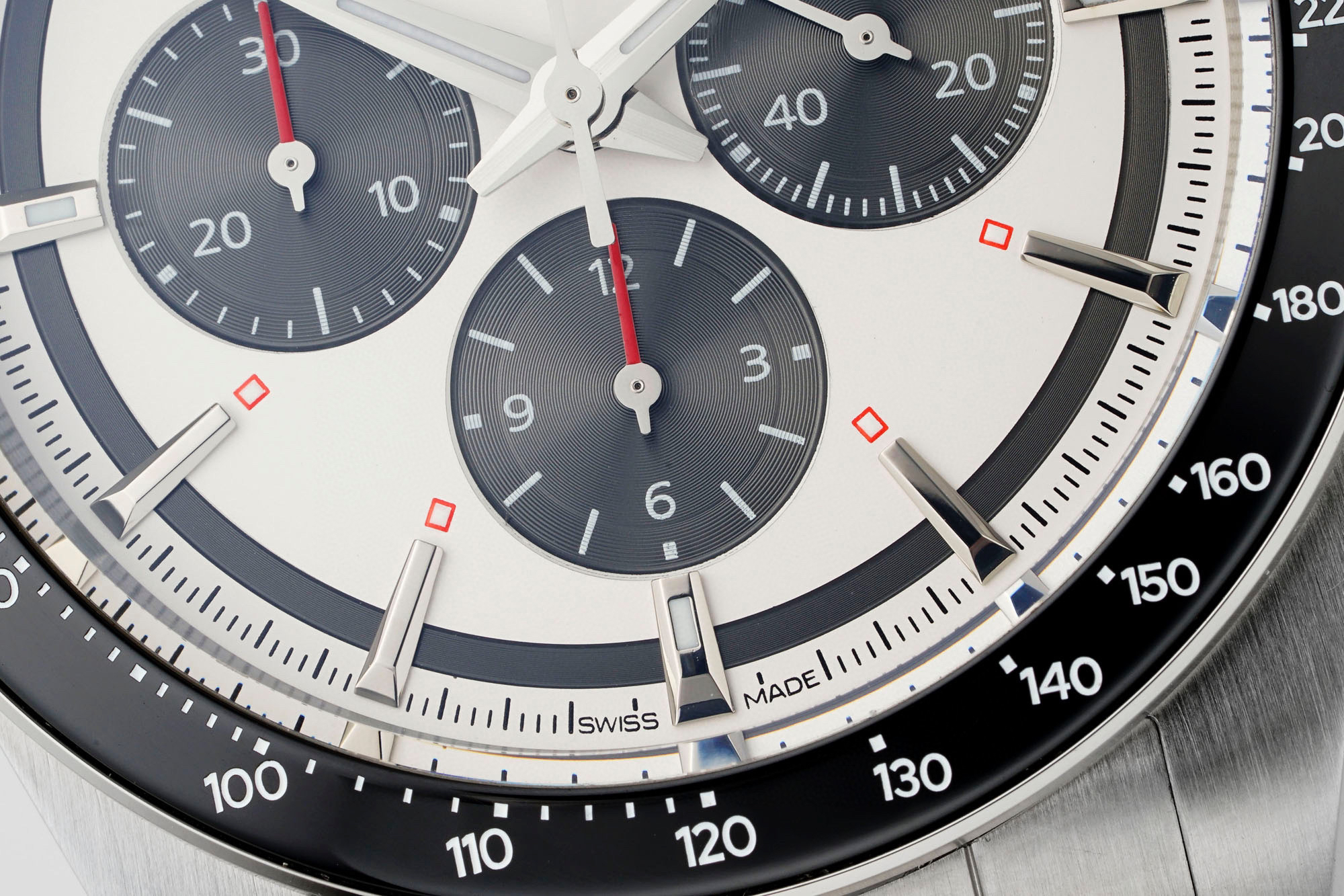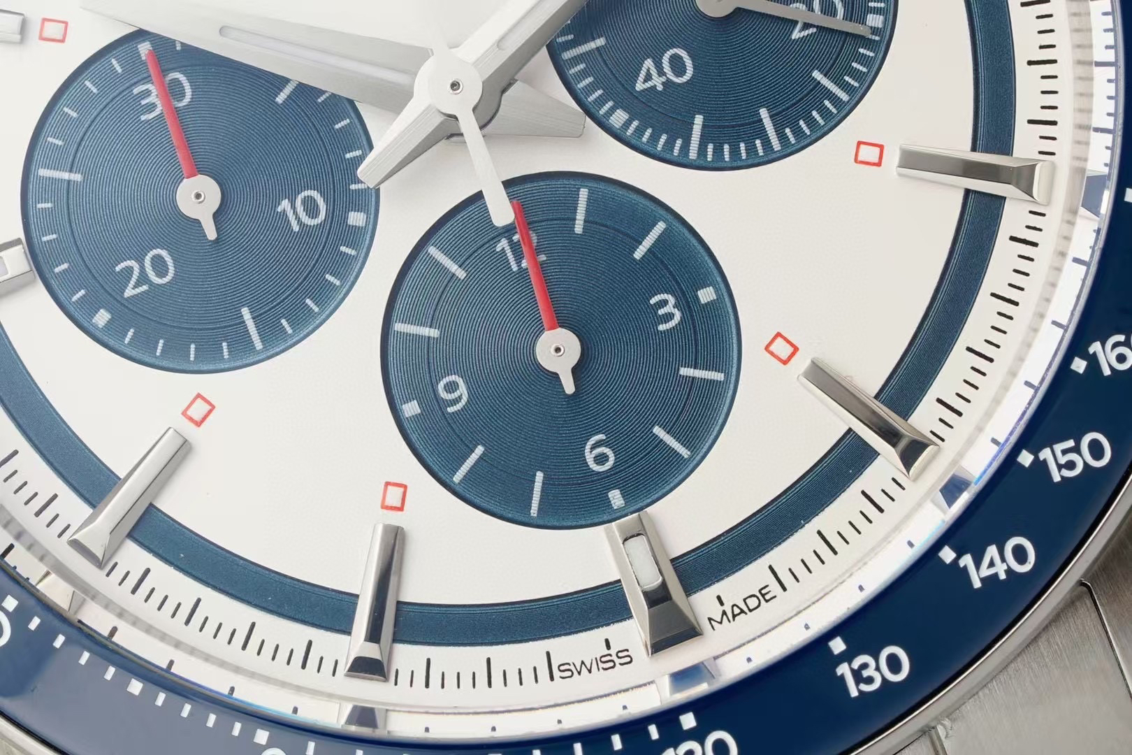 42.00 mm表径,使用陶瓷表圈,表圈上有有测速圈,并有红字点缀。