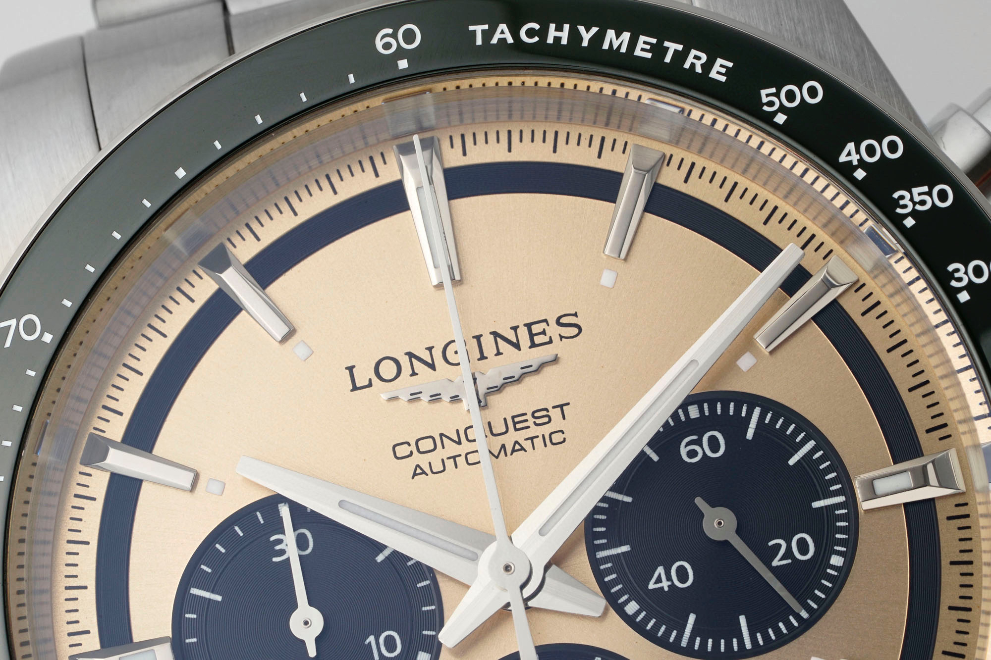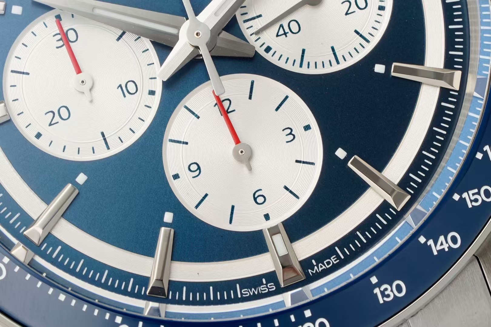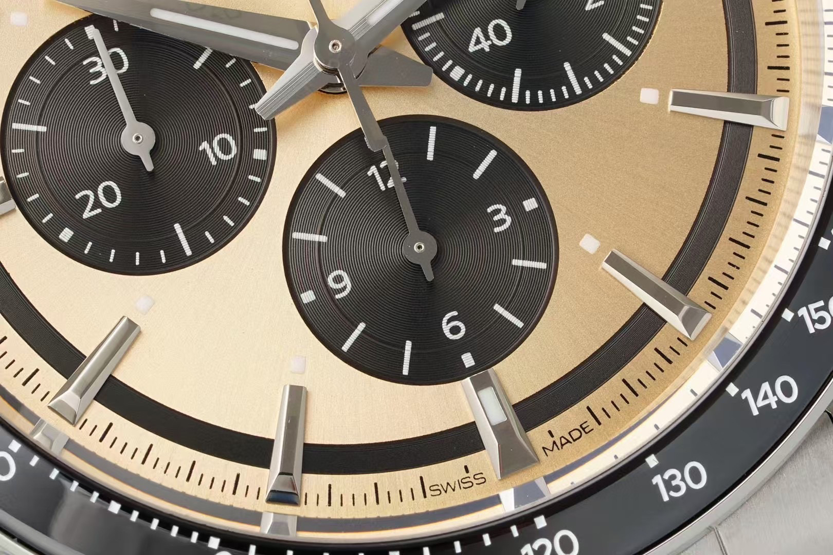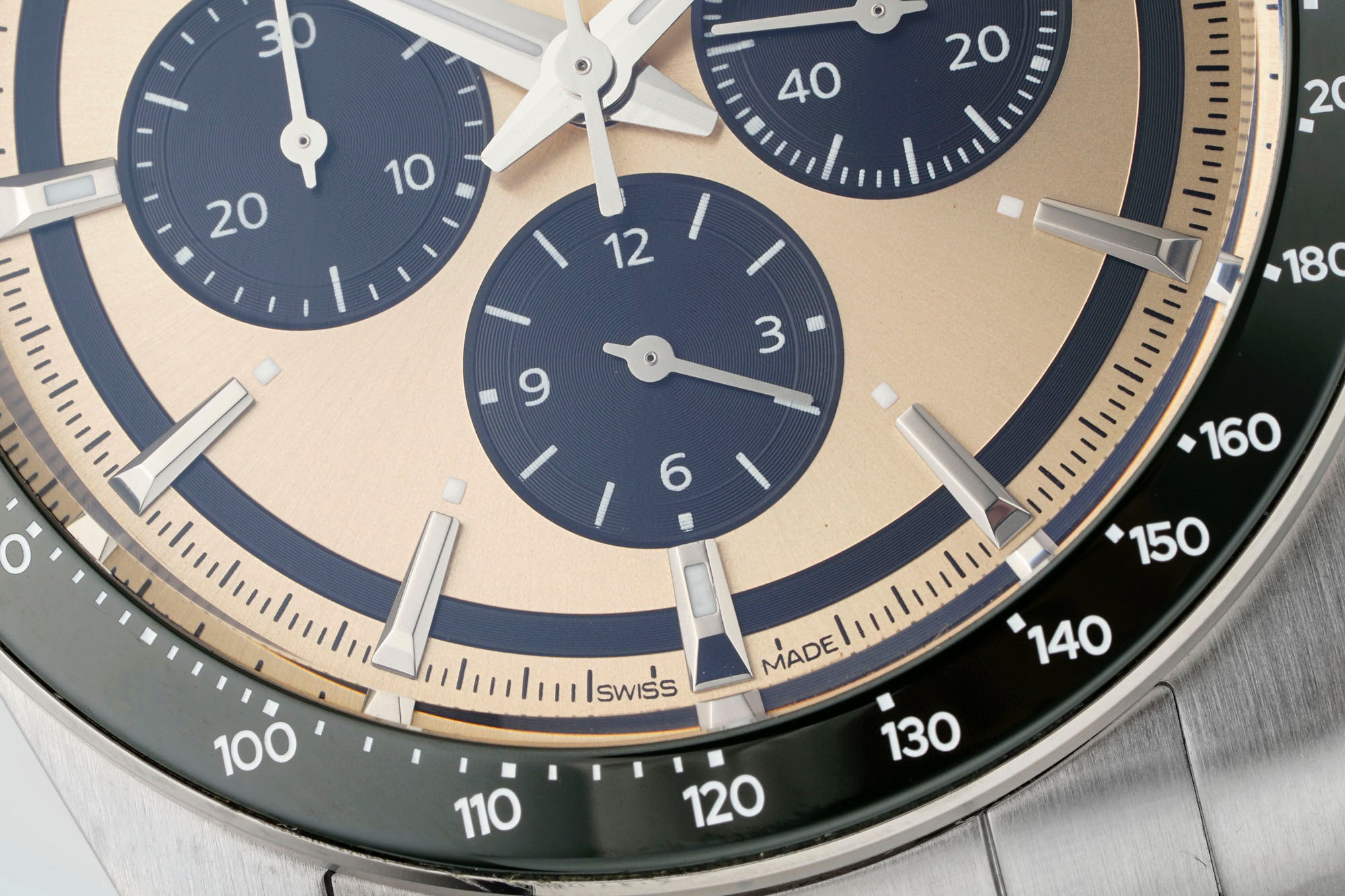 表盘有黑、白、蓝、香槟,多种配色,黑色的三眼计时盘和黑色陶瓷圈,同样有“熊猫盘”的神韵。虽然康卡斯计时的表盘,整体走现代风格,但盘面外侧的一圈扭索纹黑圈,让手表有了那么一点儿“sector dial”(分区表盘)的复古味道。同时,在每个条形立体时标的前端,都有一个小小的夜光点。这种设计在上世纪90年代、21世纪初的名表上,经常能见到,这又为新款康卡斯计时表带来了一些复古气息。