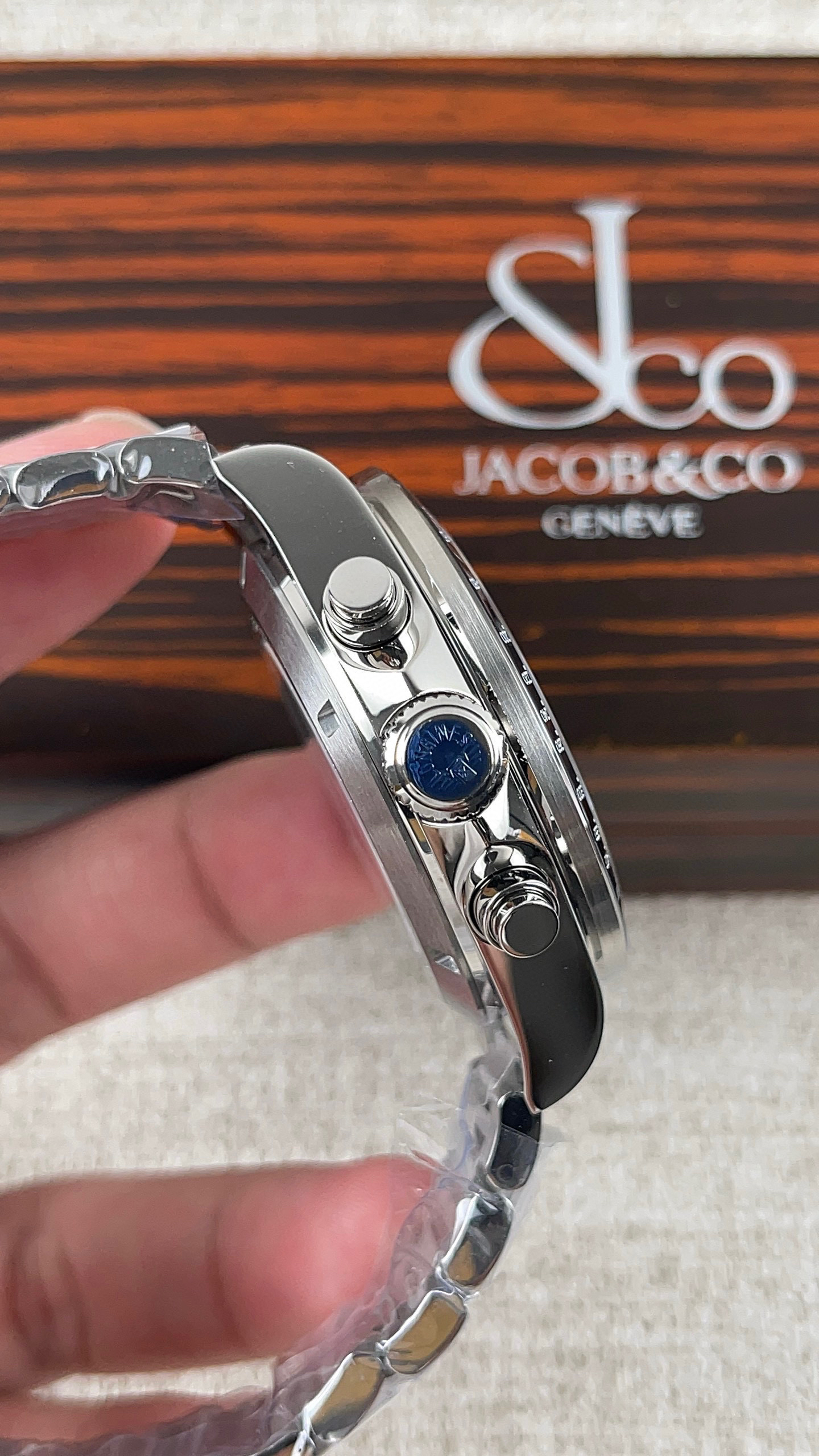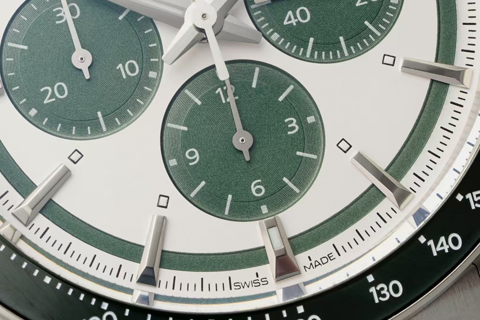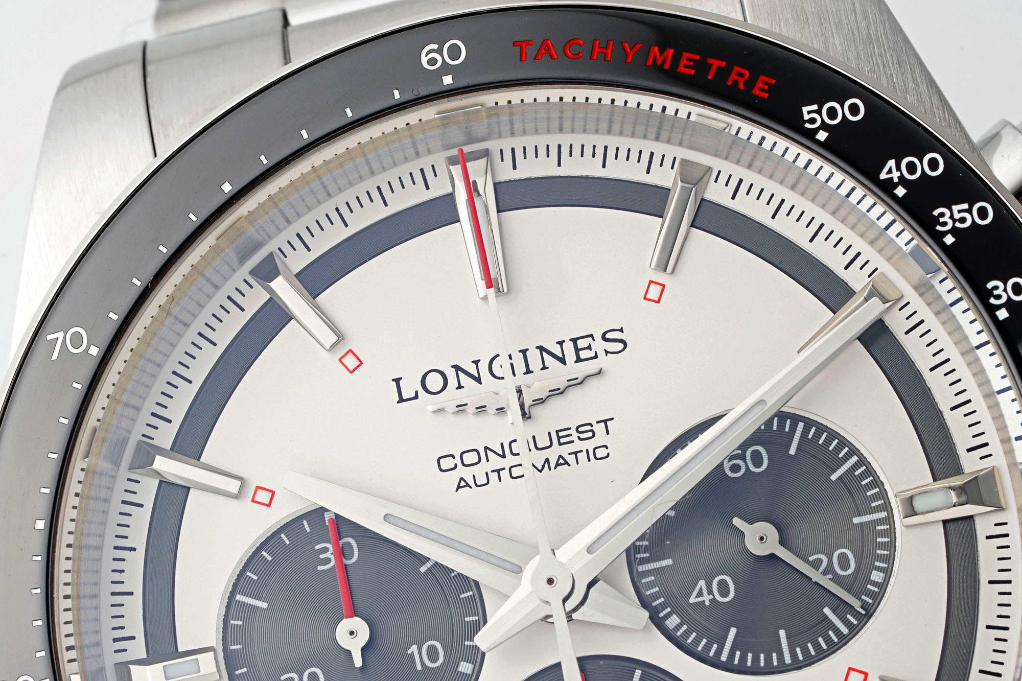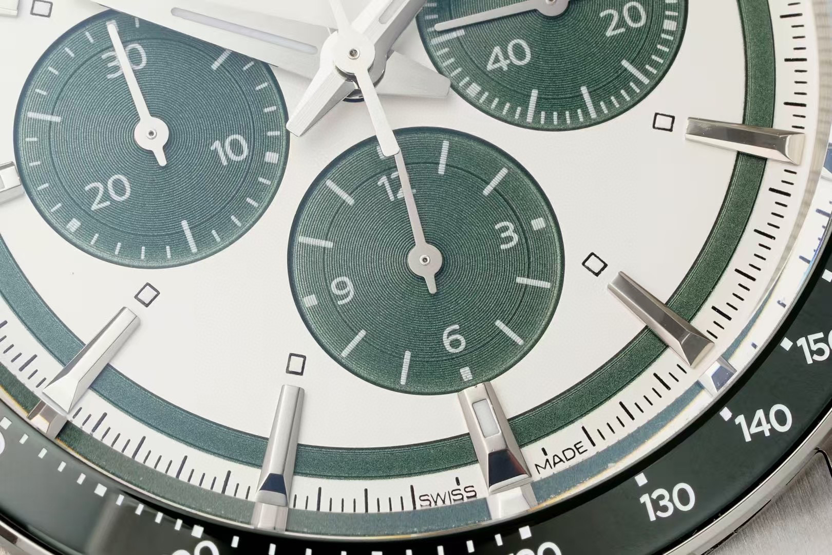 表盘有黑、白、蓝、香槟,多种配色,黑色的三眼计时盘和黑色陶瓷圈,同样有“熊猫盘”的神韵。虽然康卡斯计时的表盘,整体走现代风格,但盘面外侧的一圈扭索纹黑圈,让手表有了那么一点儿“sector dial”(分区表盘)的复古味道。同时,在每个条形立体时标的前端,都有一个小小的夜光点。这种设计在上世纪90年代、21世纪初的名表上,经常能见到,这又为新款康卡斯计时表带来了一些复古气息。