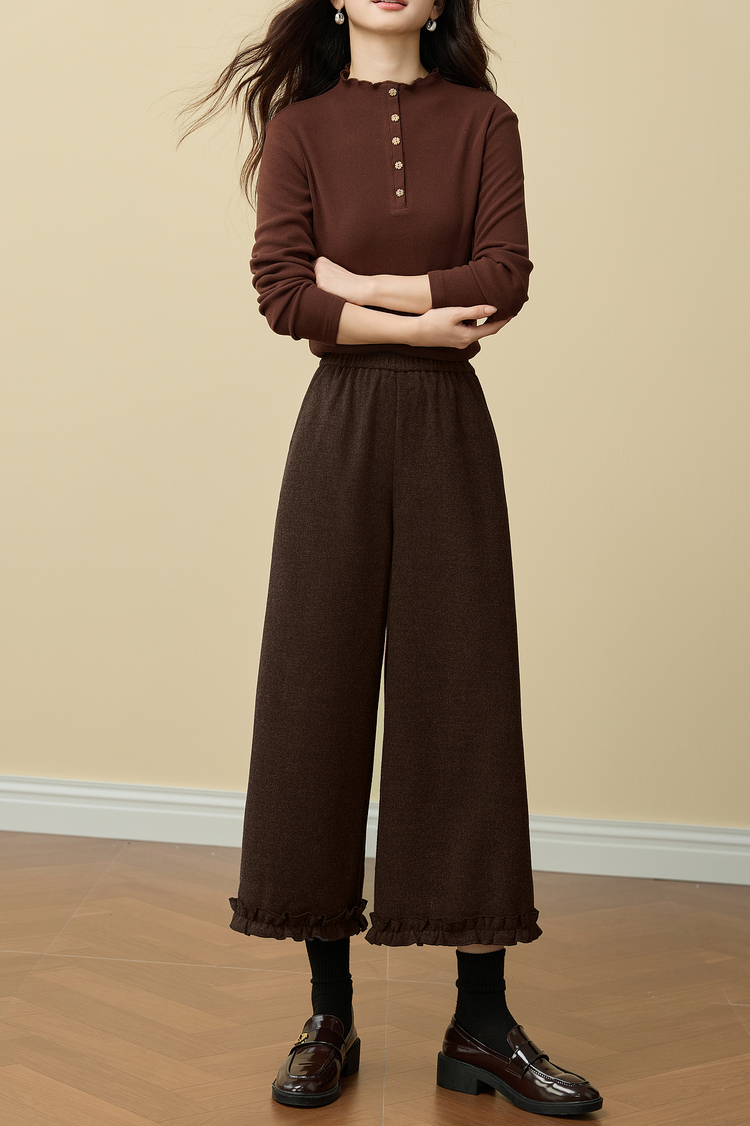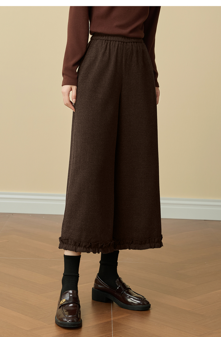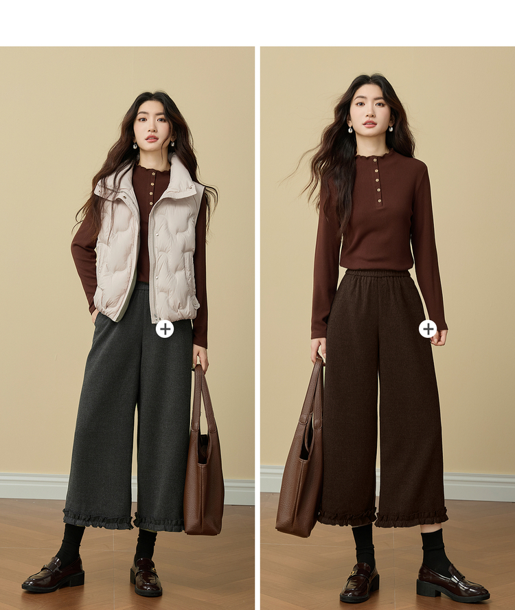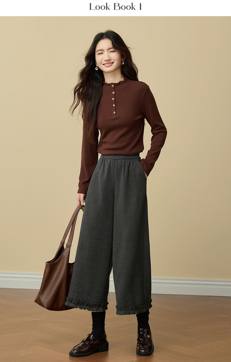 【12/03新品】熙世界灰色木耳花边阔腿裤女2025秋冬新款小个子八九分直筒休闲裤