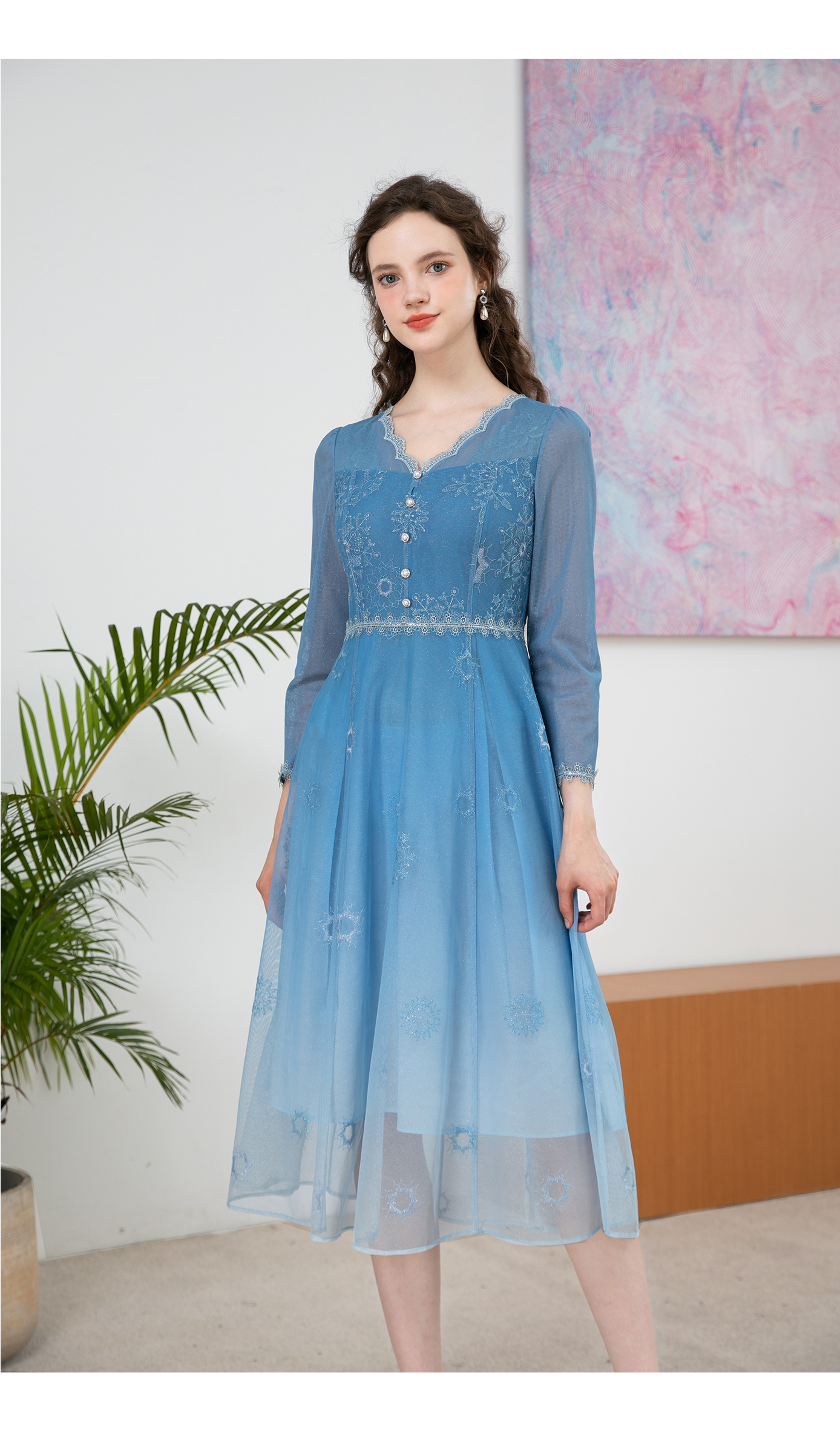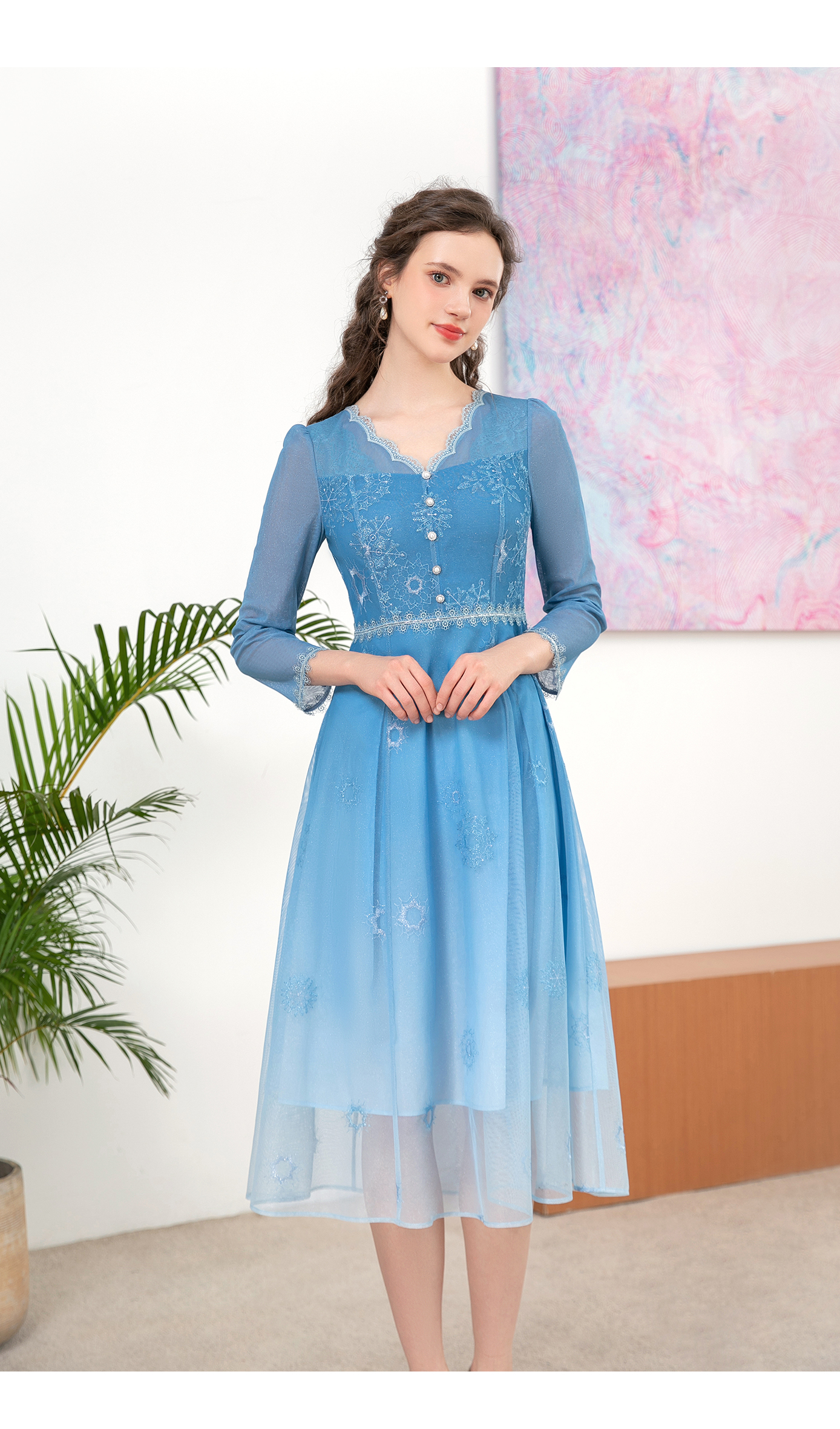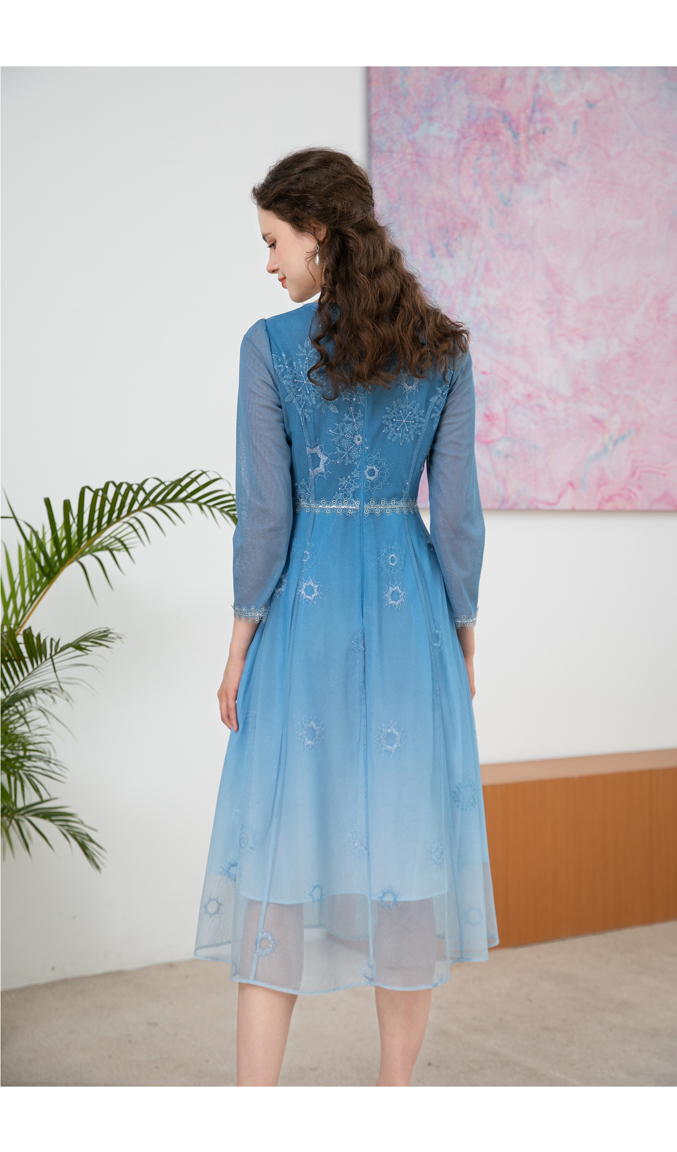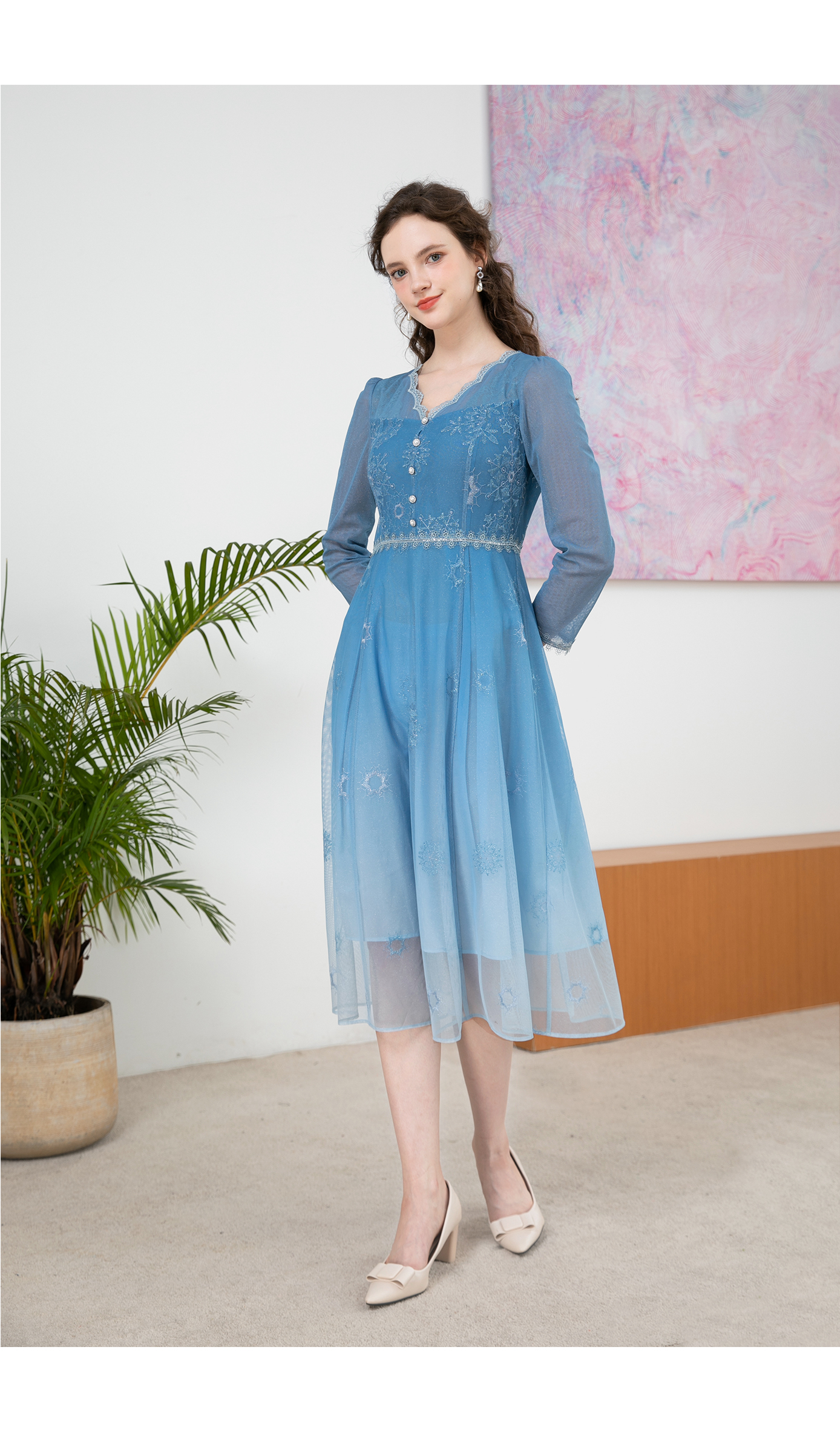 司歌v领刺绣秋连衣裙中长裙渐变仙气A901475X