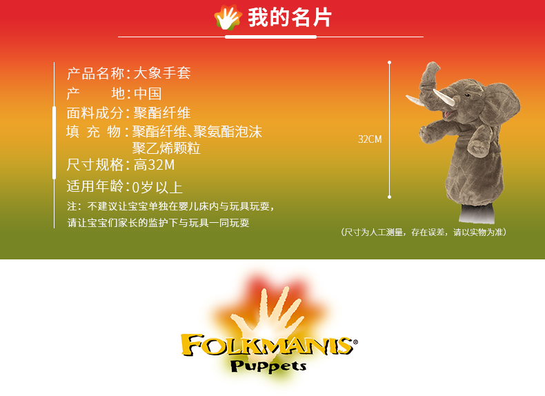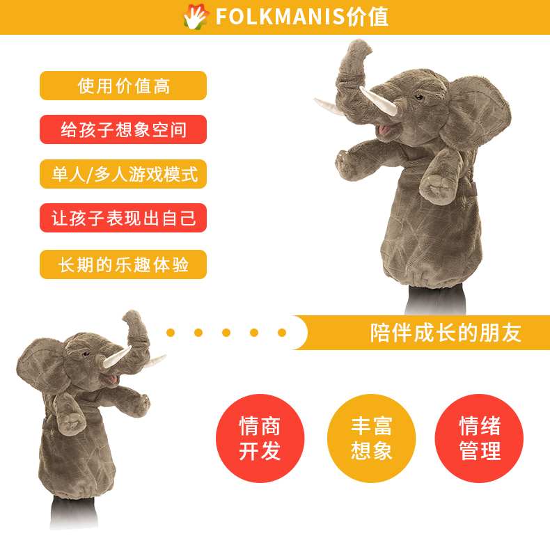 Folkmanis Puppets大象手套玩具/2830玩偶毛绒玩具礼物