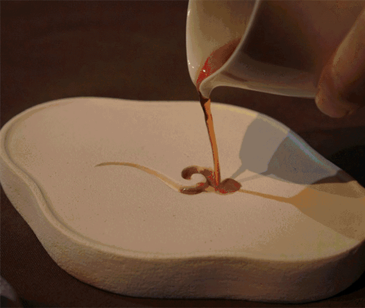 茶台中心是一大片荷叶造型,叶脉生动,茶水滴落便似琥珀般的露珠,咕嘟就瞬间消失了。