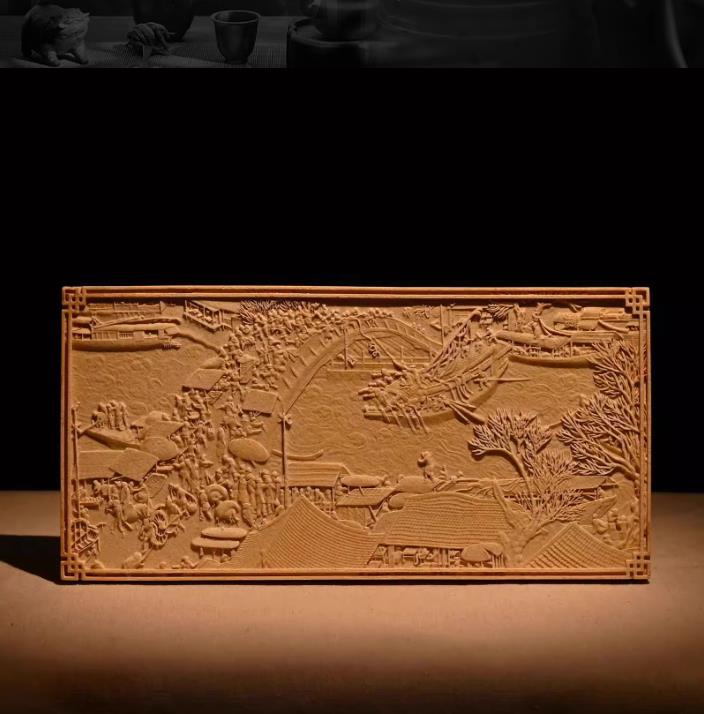 茶承浮雕选取《清明上河图》名场面,在茶席上再现名画风雅。