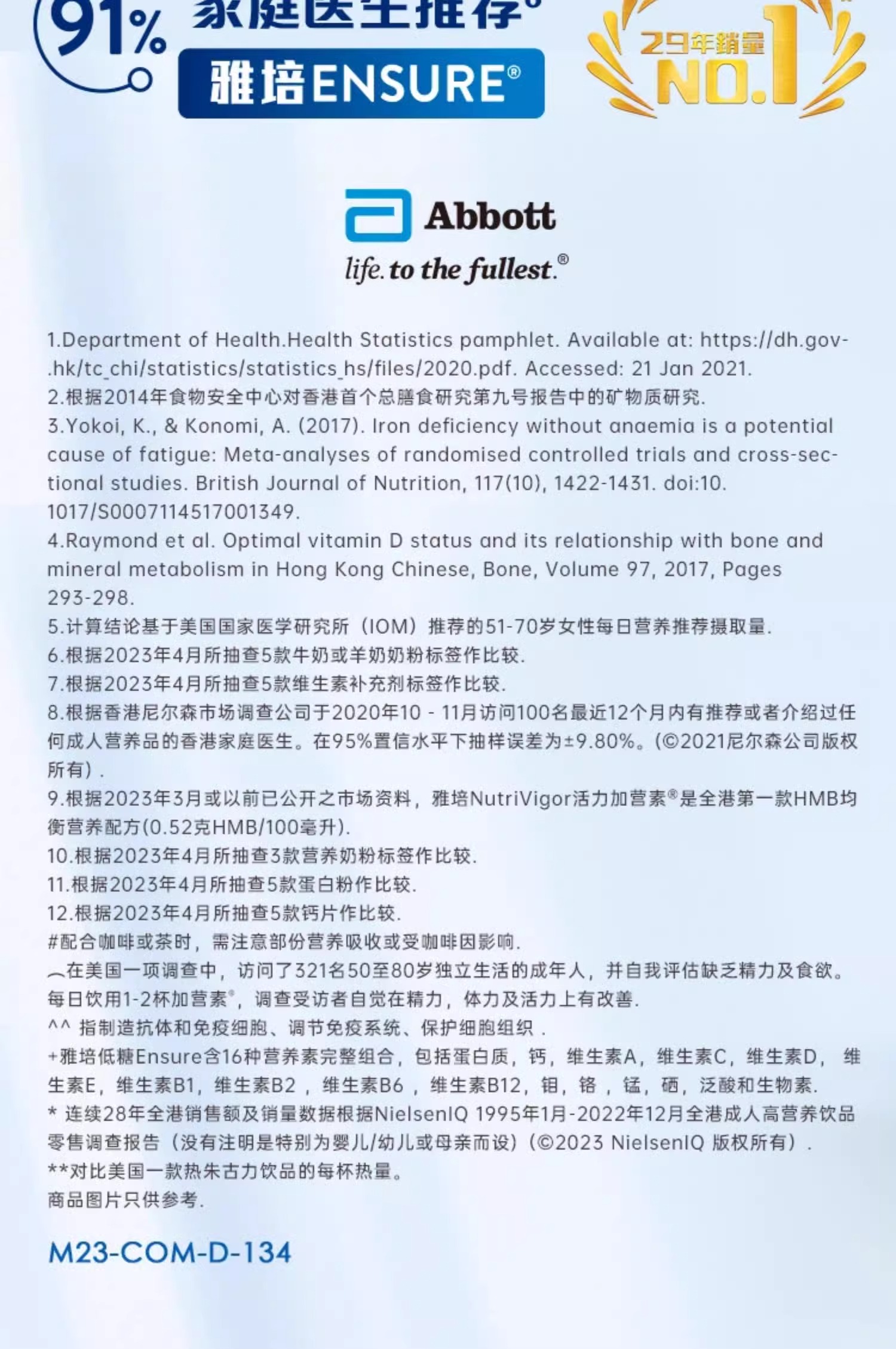 港版雅培 Abbott低糖金装加营素(香草味) 成人奶粉 850g