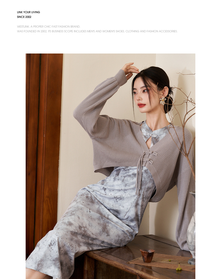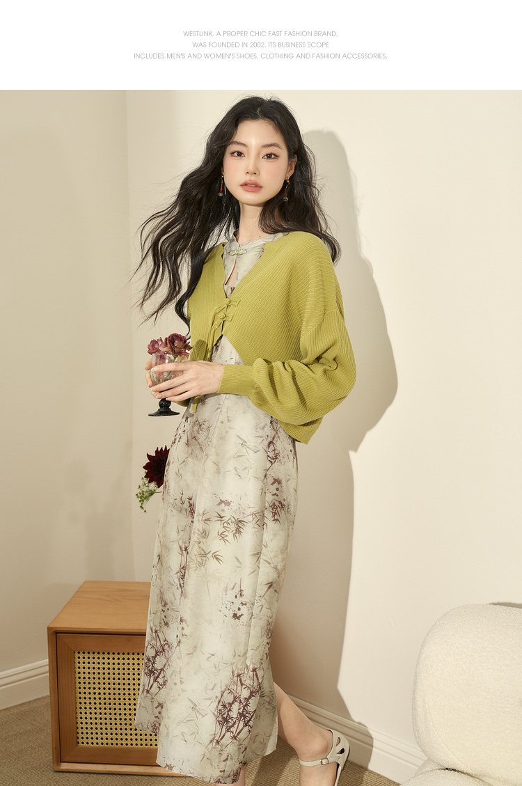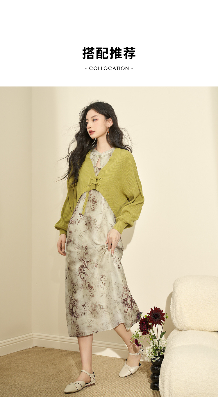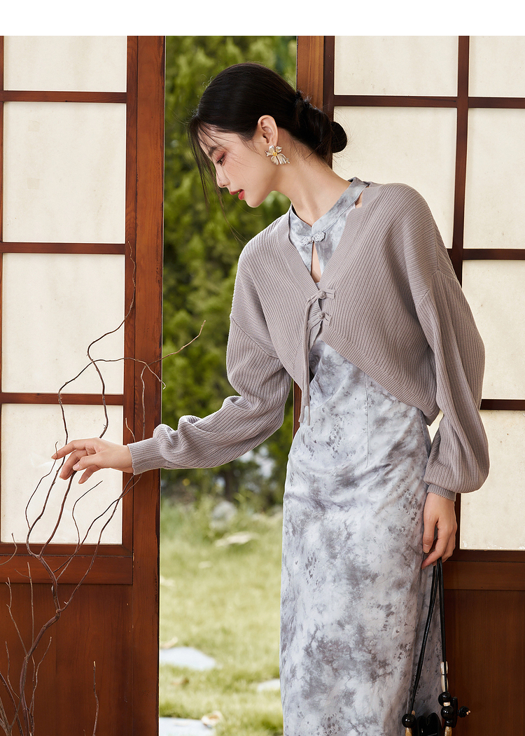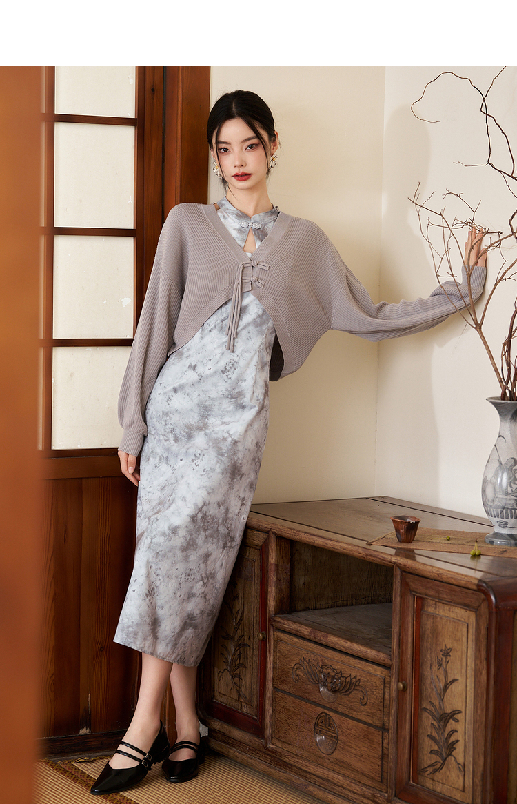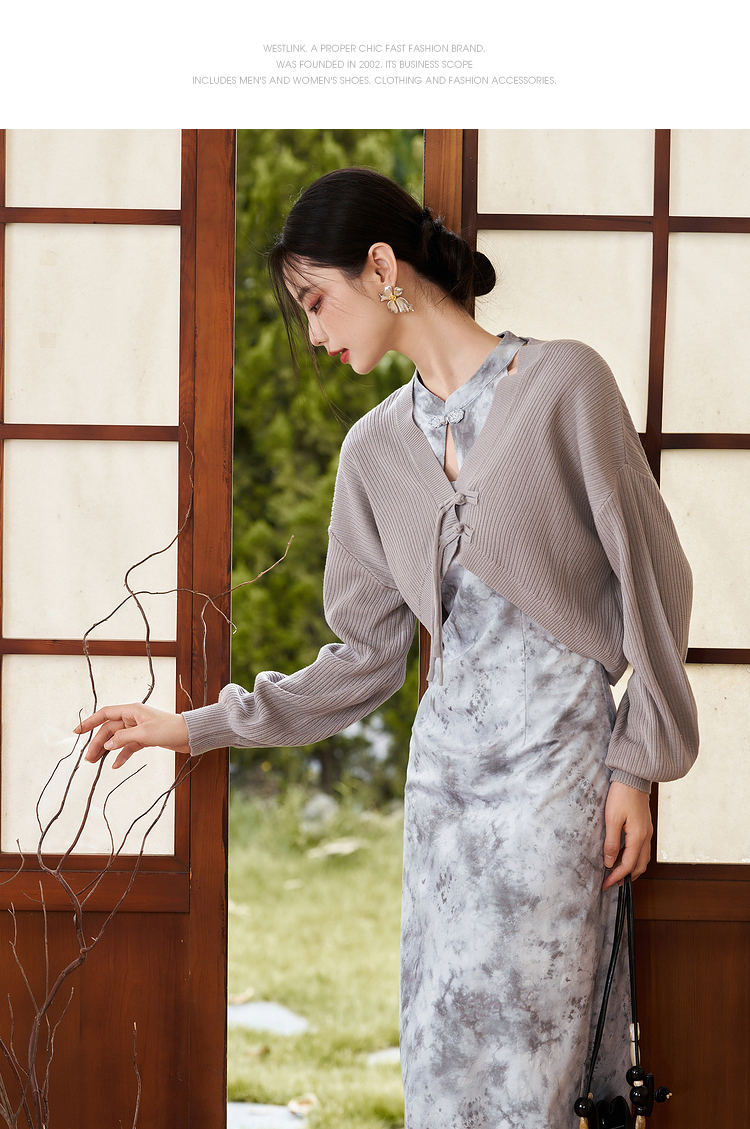 西遇韩系套装新款长袖针织开衫新中式复古旗袍连衣裙两件套V0038448/V0038447