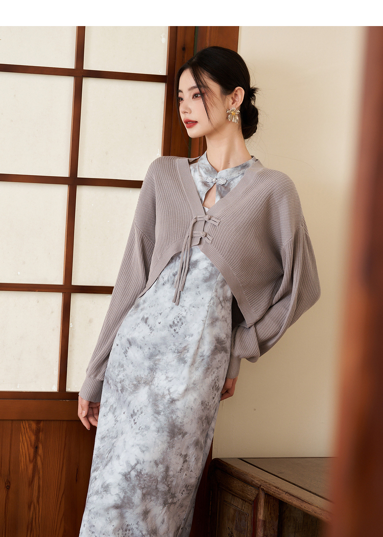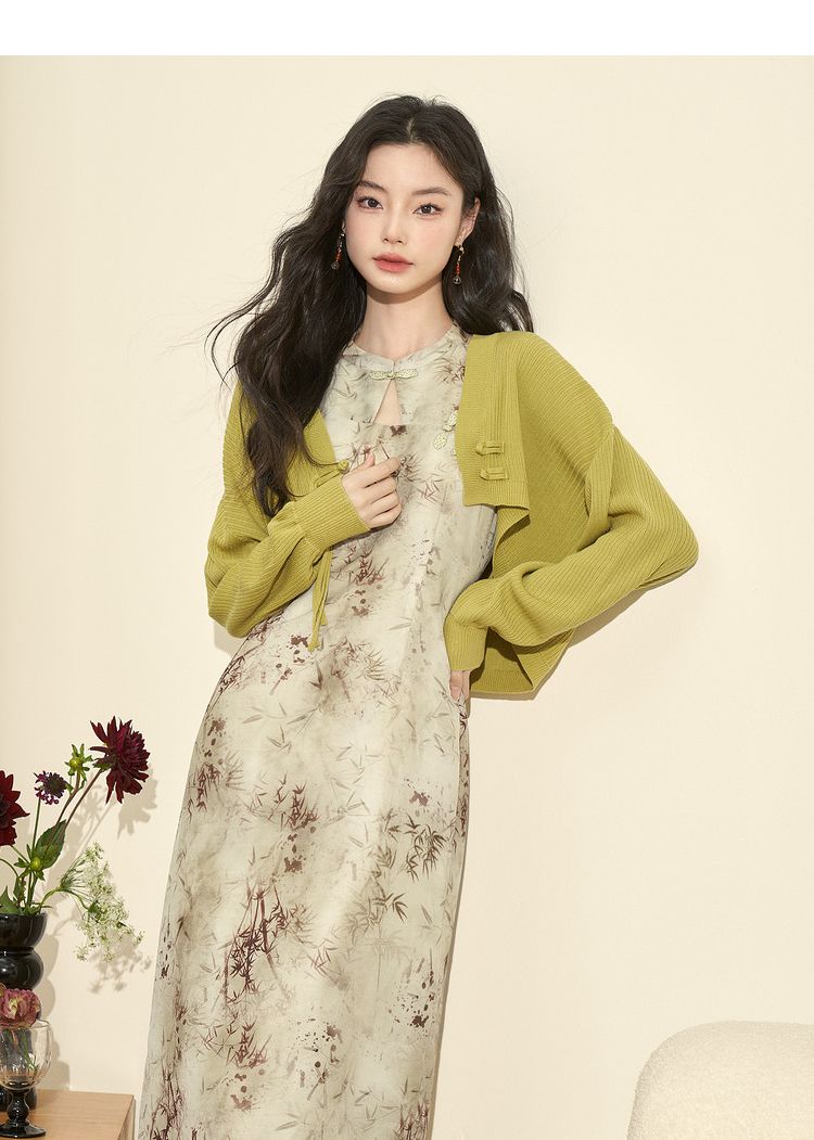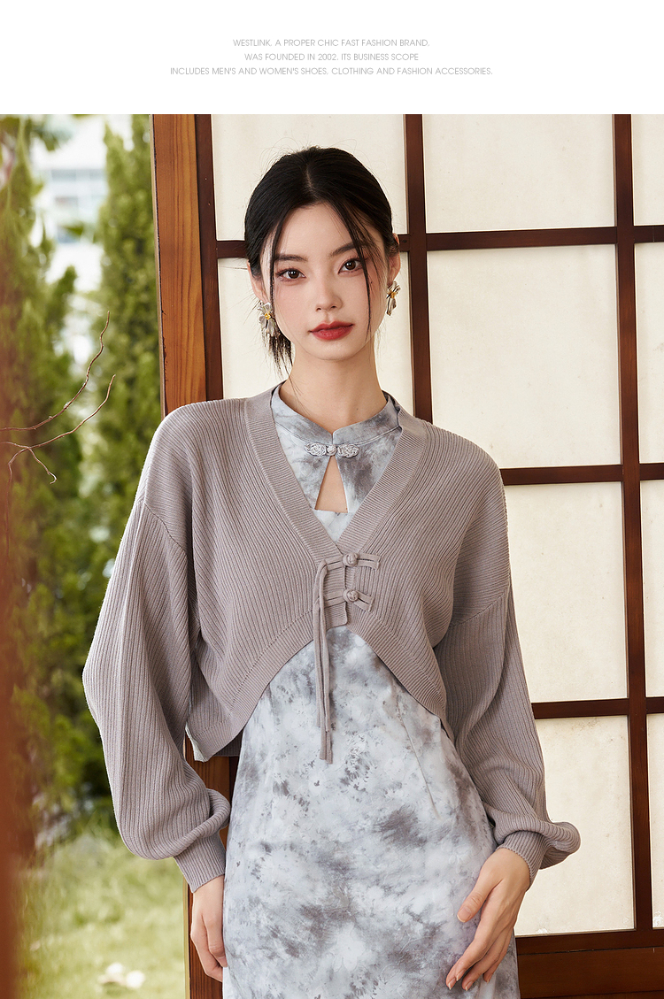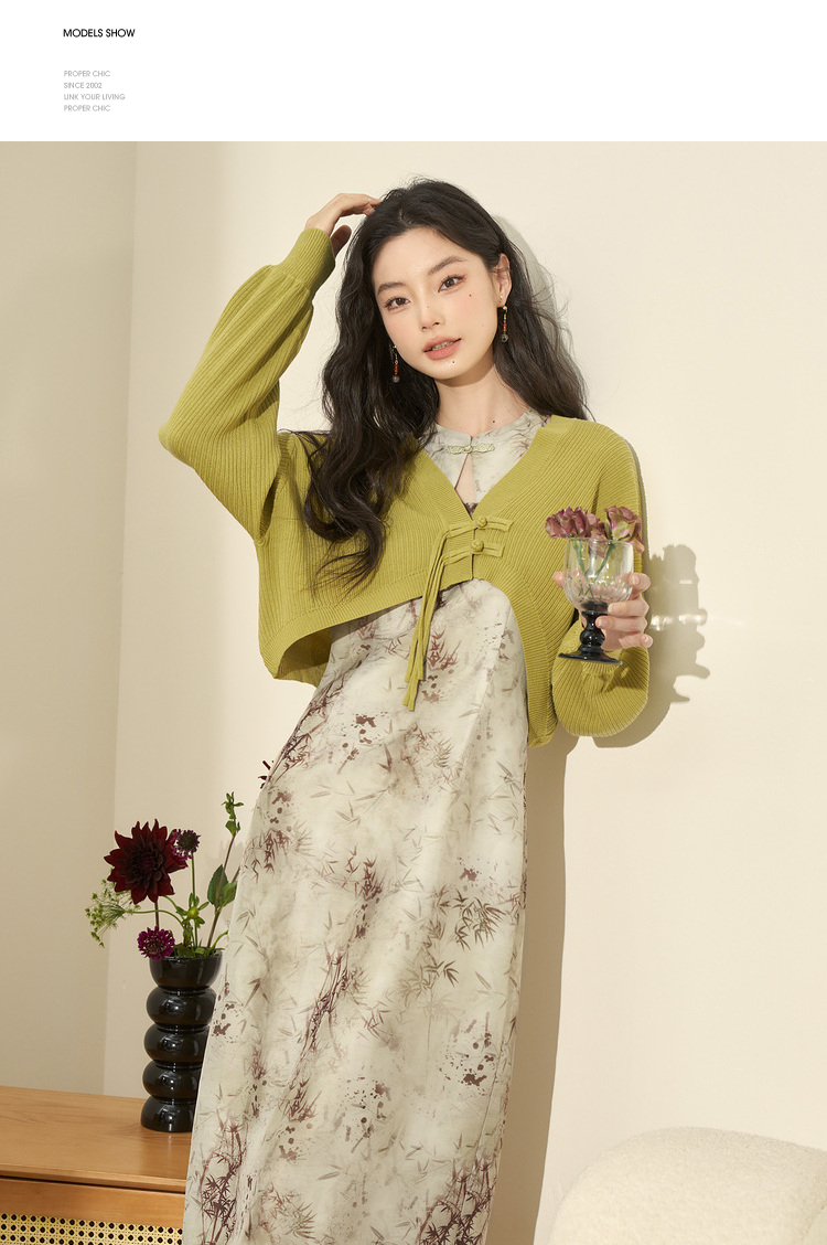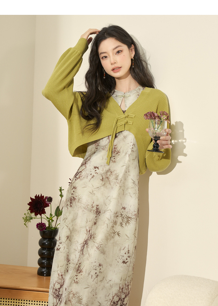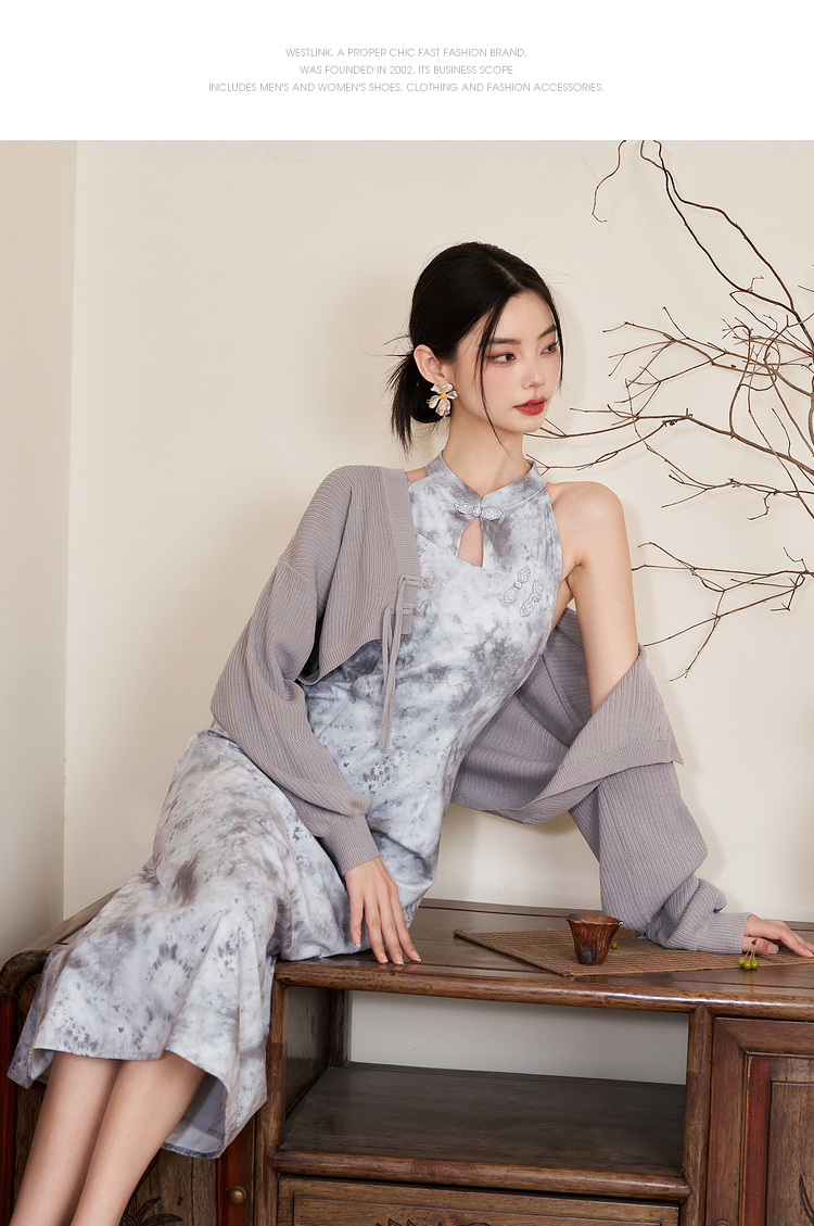 西遇韩系套装新款长袖针织开衫新中式复古旗袍连衣裙两件套V0038448/V0038447