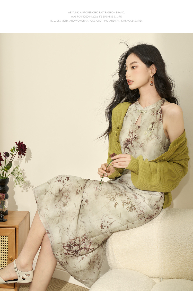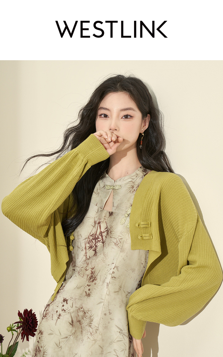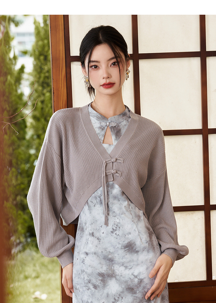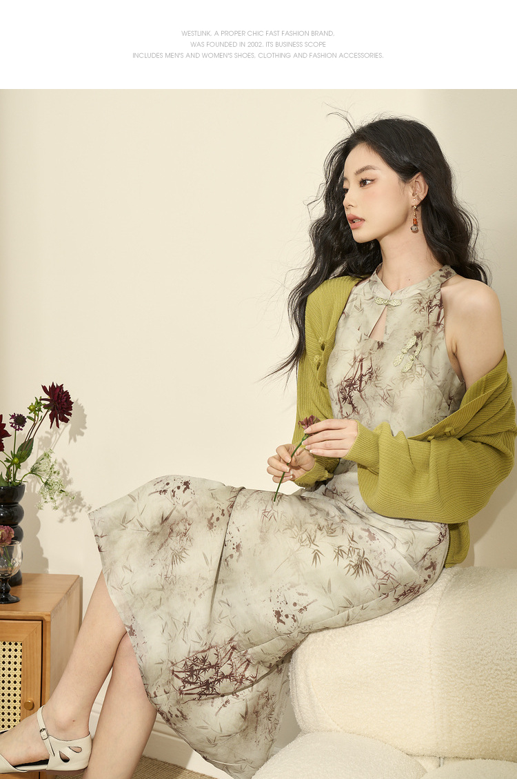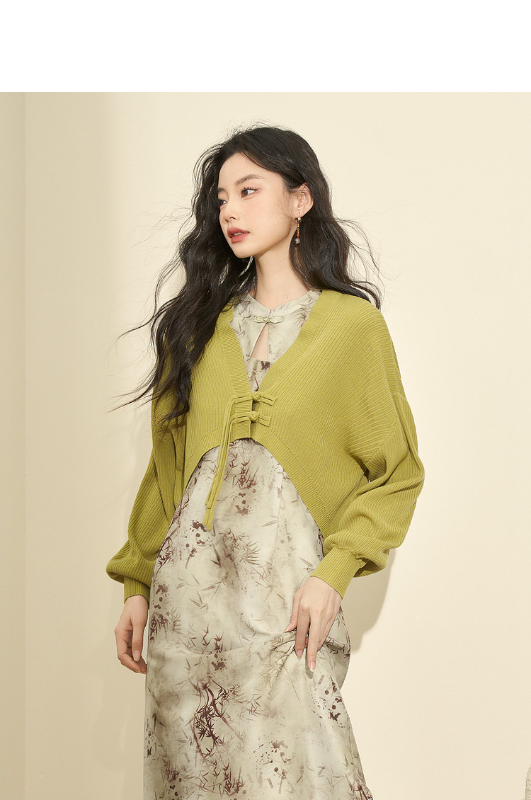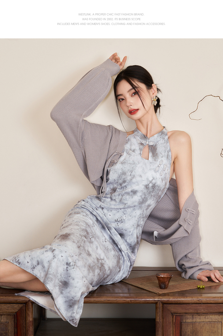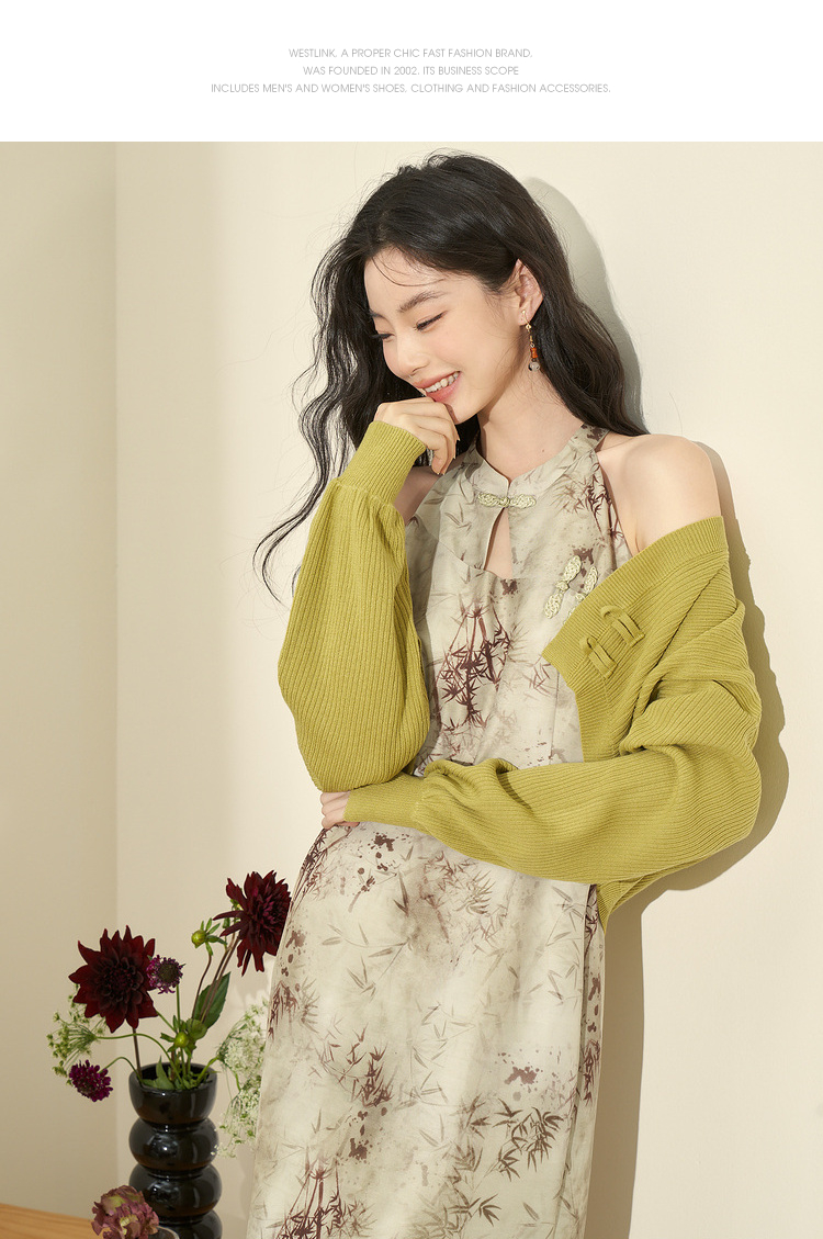 西遇韩系套装新款长袖针织开衫新中式复古旗袍连衣裙两件套V0038448/V0038447