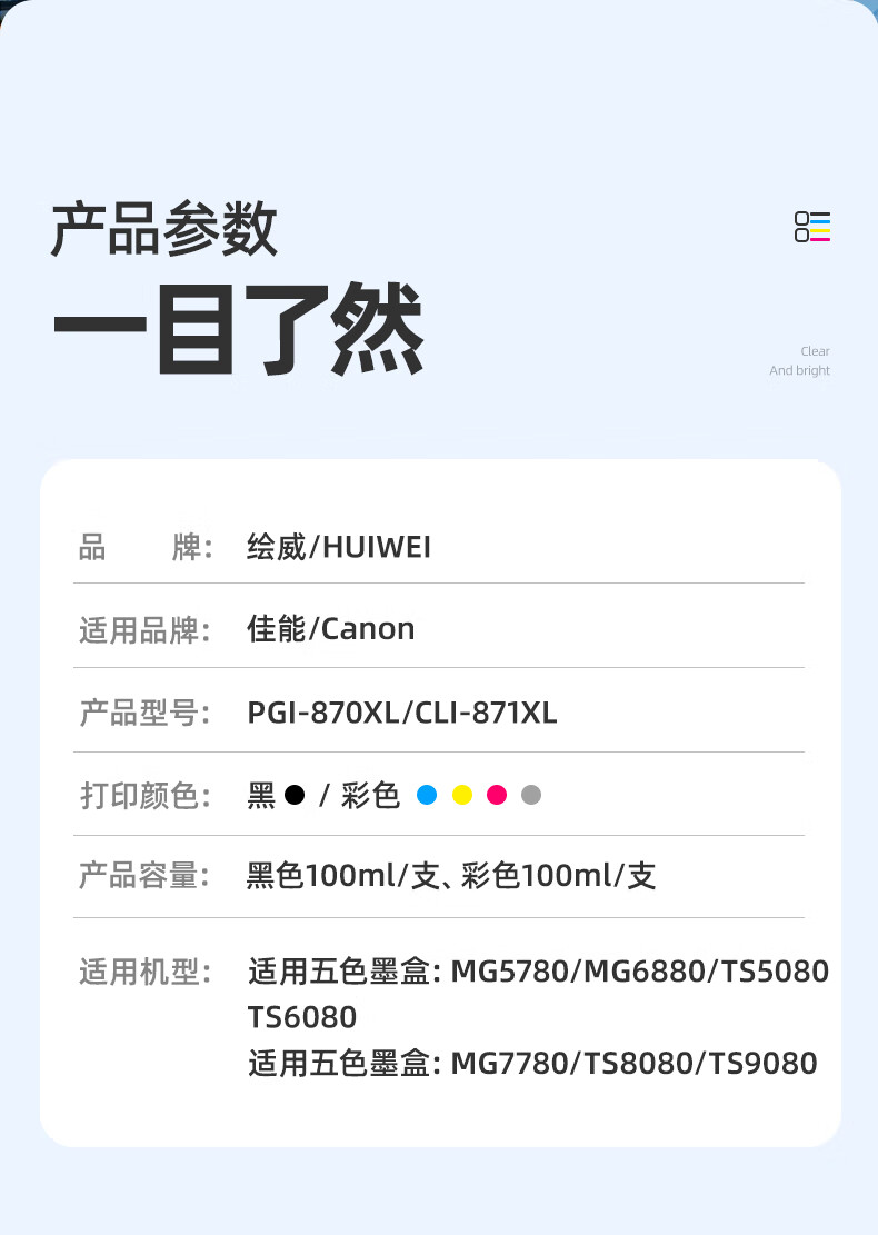 绘威PGI-870XL墨盒可加墨 适用佳能MG7780 TS8080 MG5780 TS5080 MG6880 9080打印机墨盒CLI-871XL 六色套装