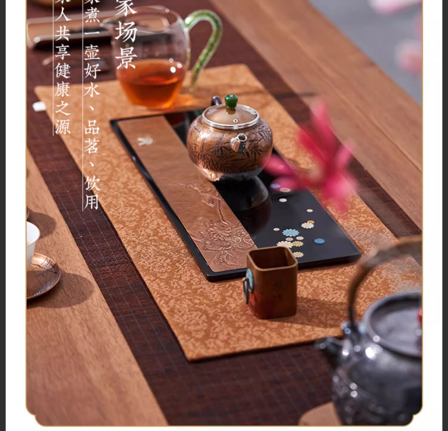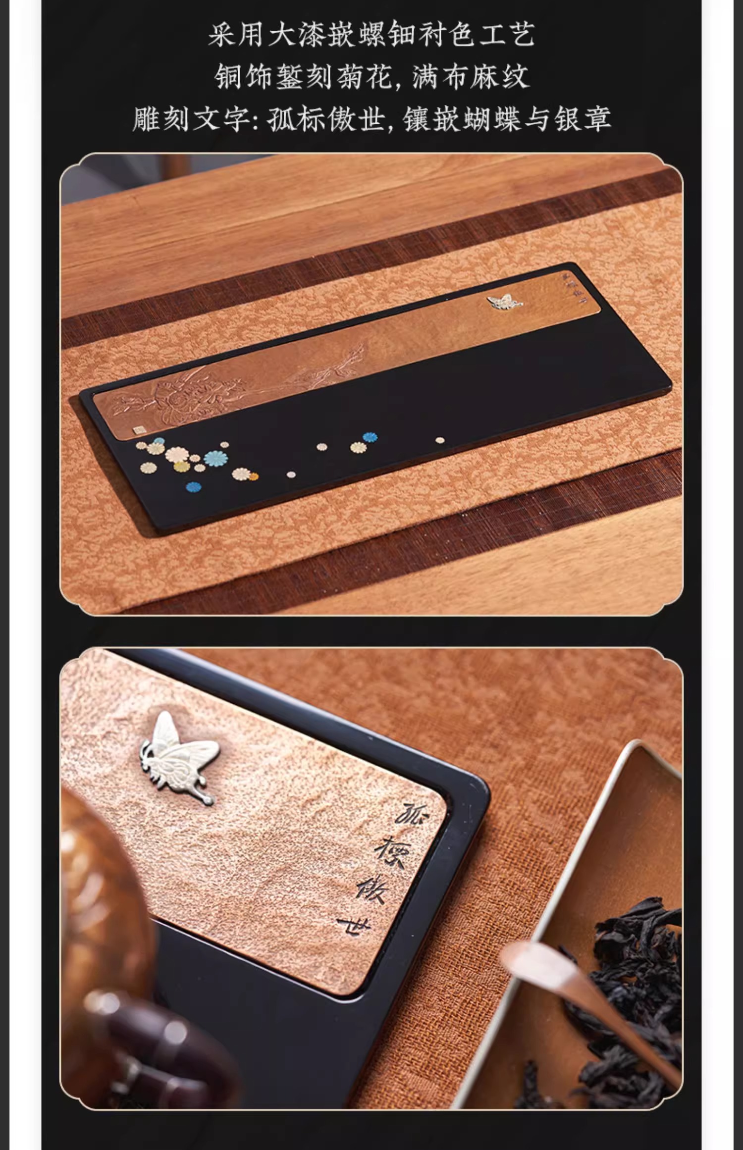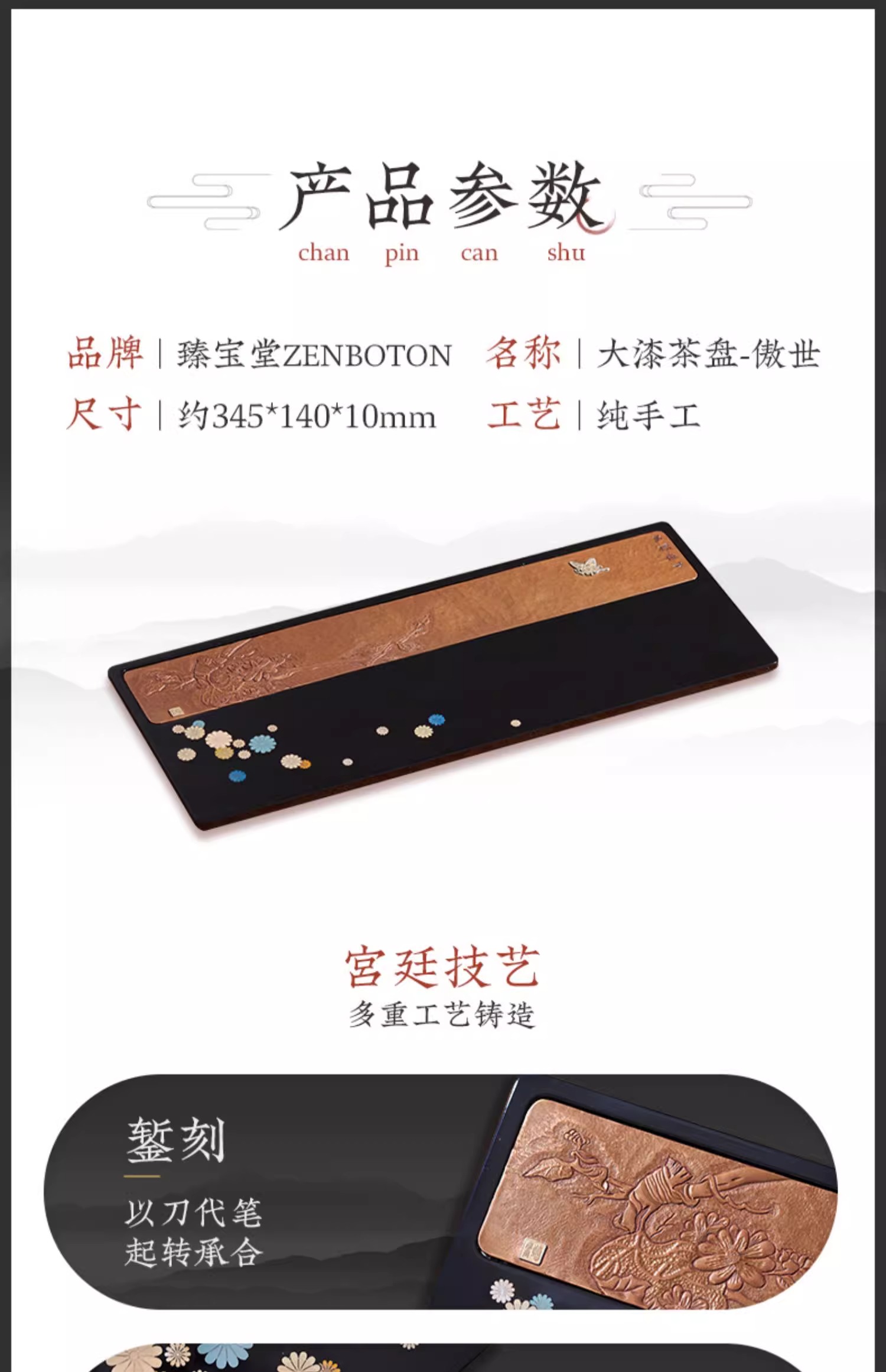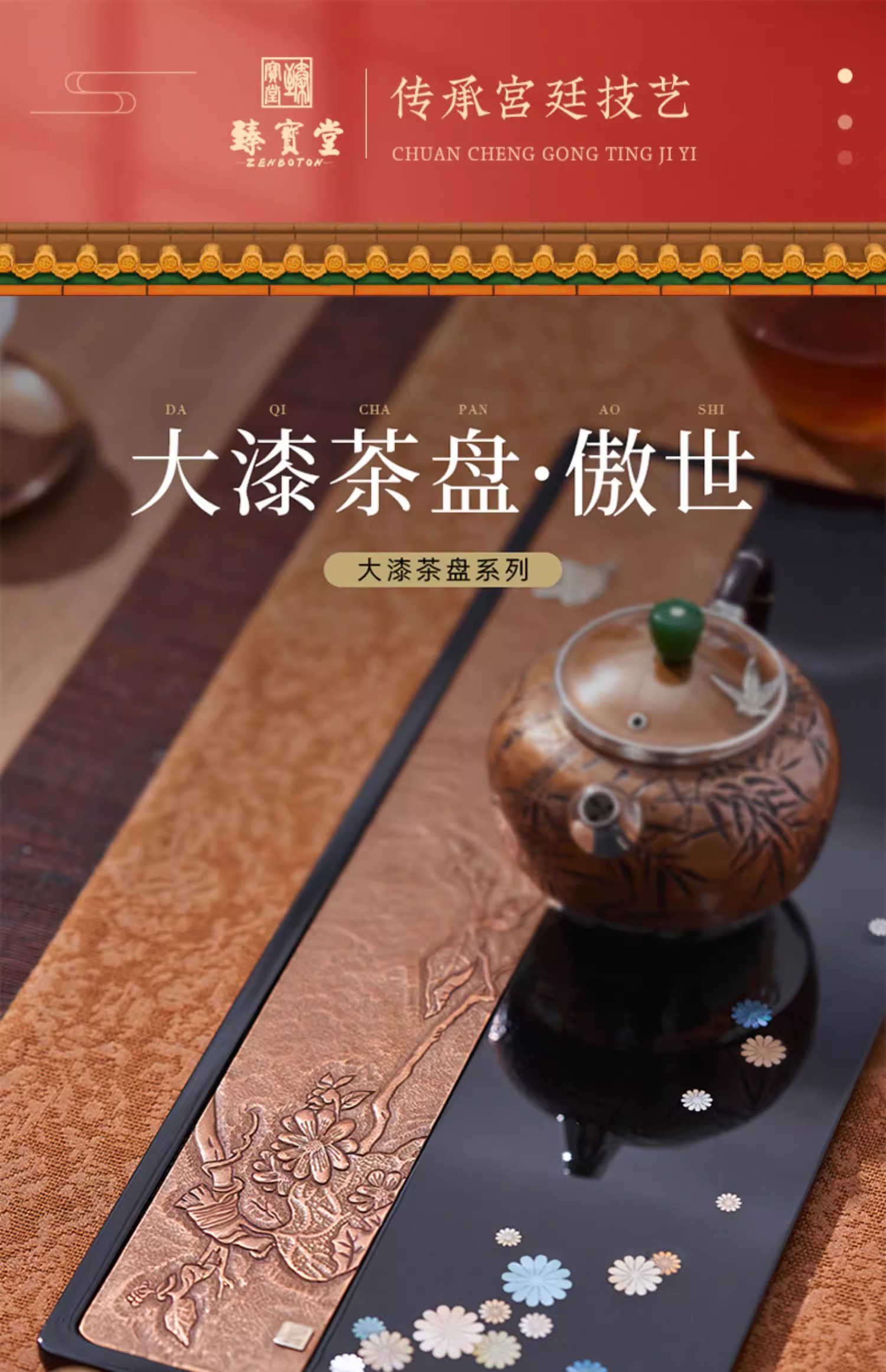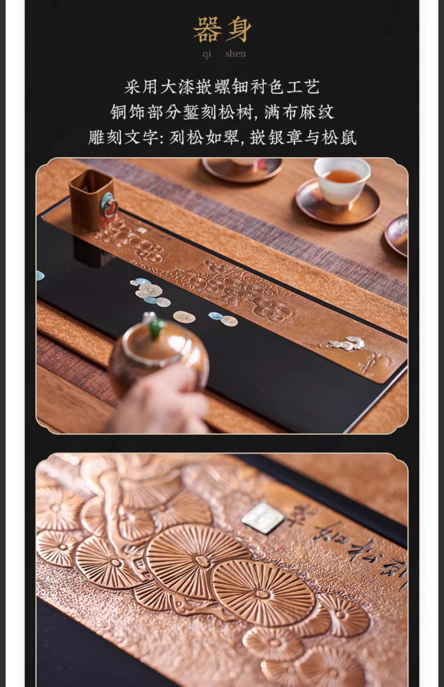 臻宝堂大漆茶盘纯手工镶铜雕刻干泡茶台中式壶承原创小型漆器茶具傲世345*140*10mm