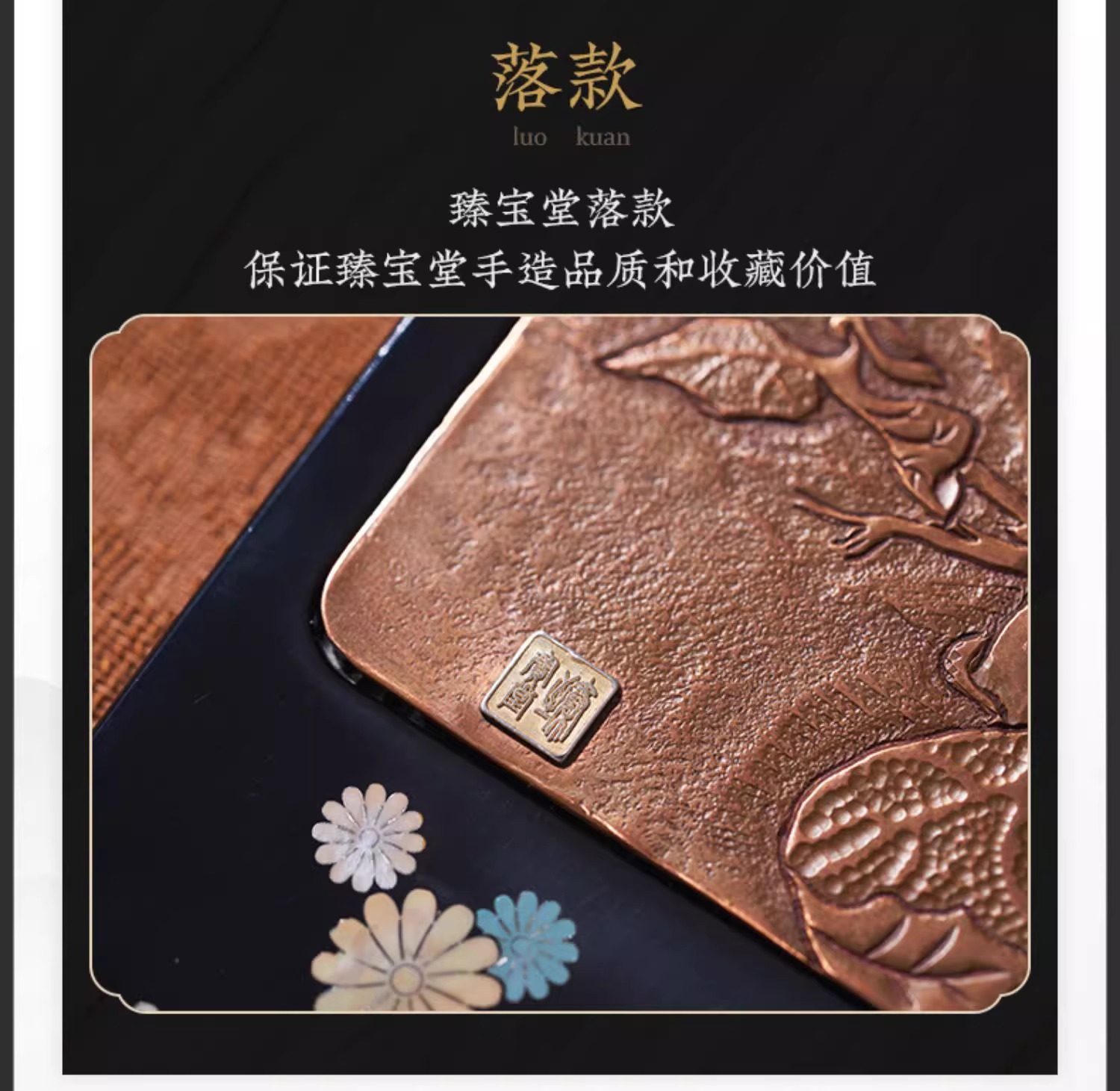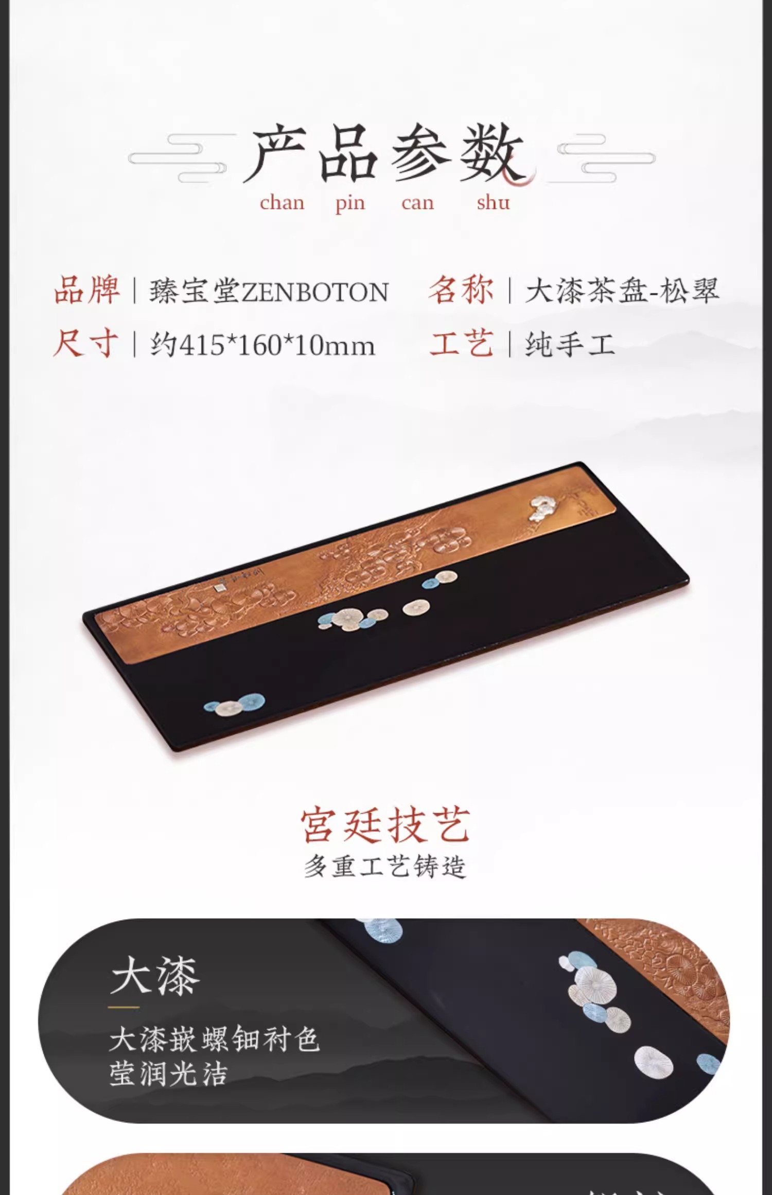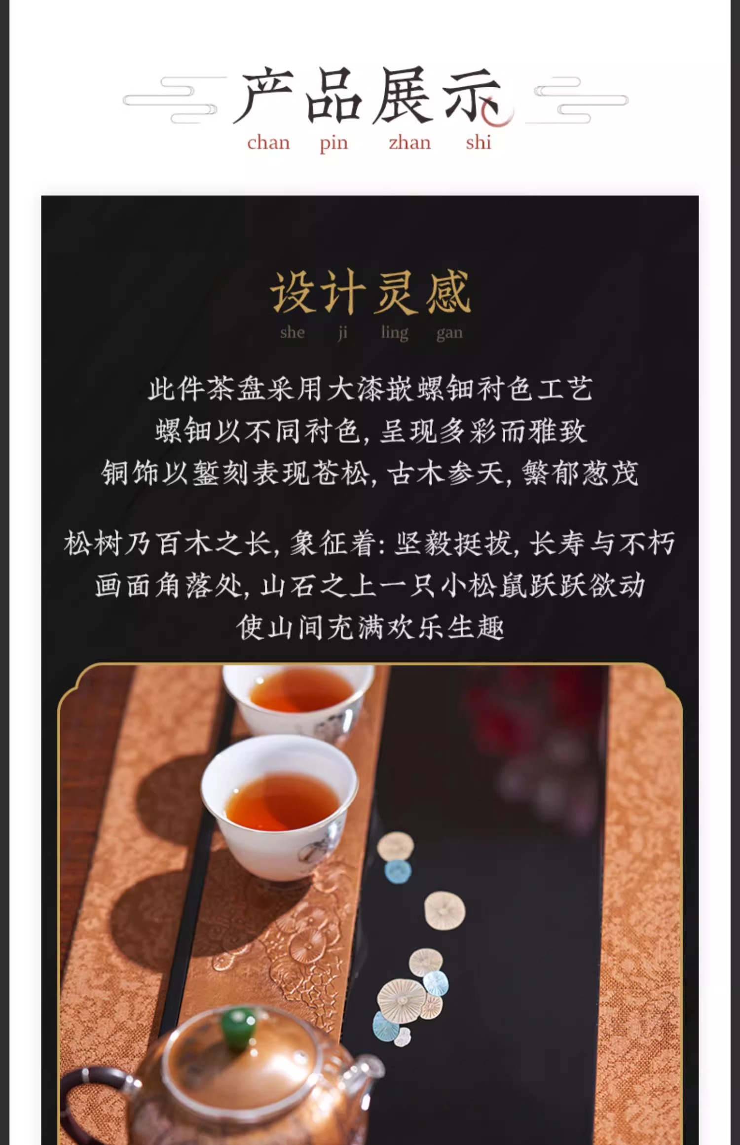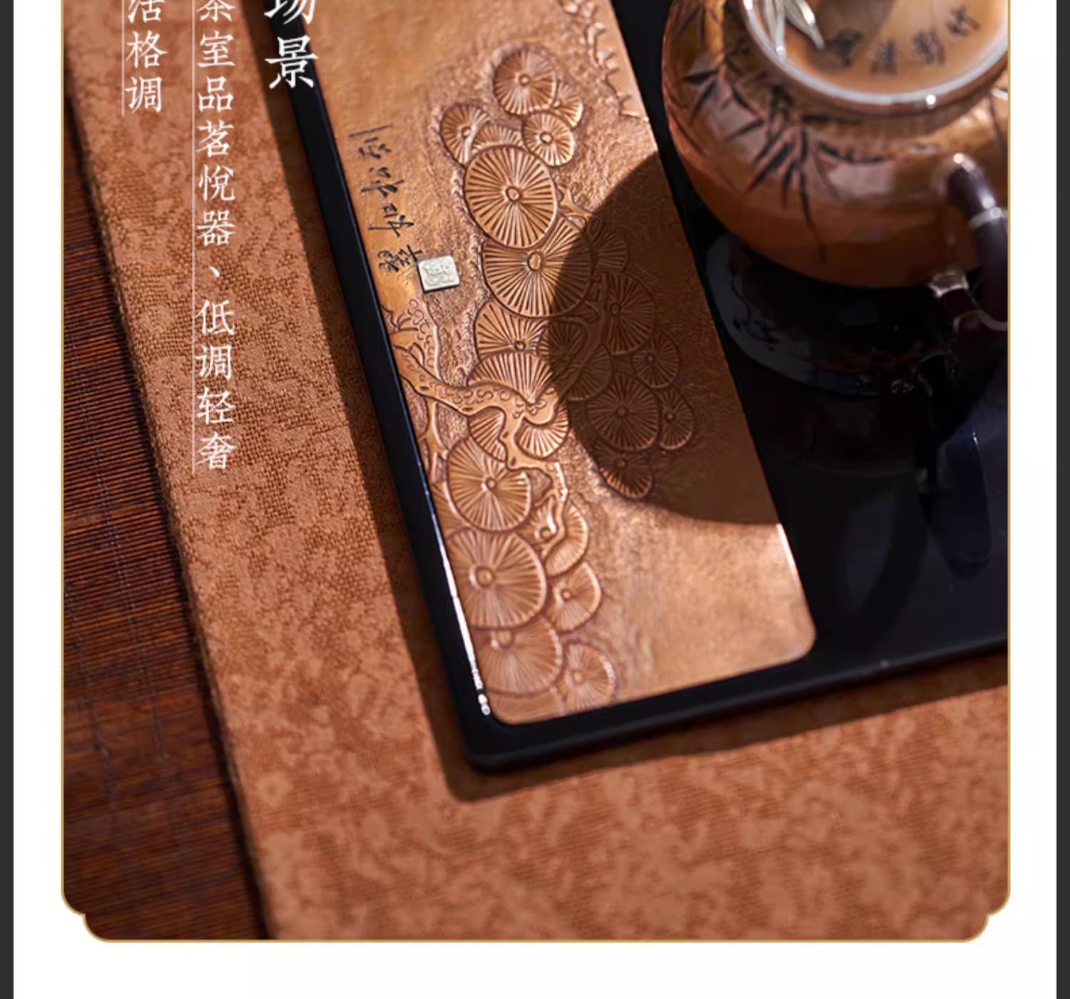臻宝堂大漆茶盘纯手工镶铜雕刻干泡茶台中式壶承原创小型漆器茶具傲世345*140*10mm