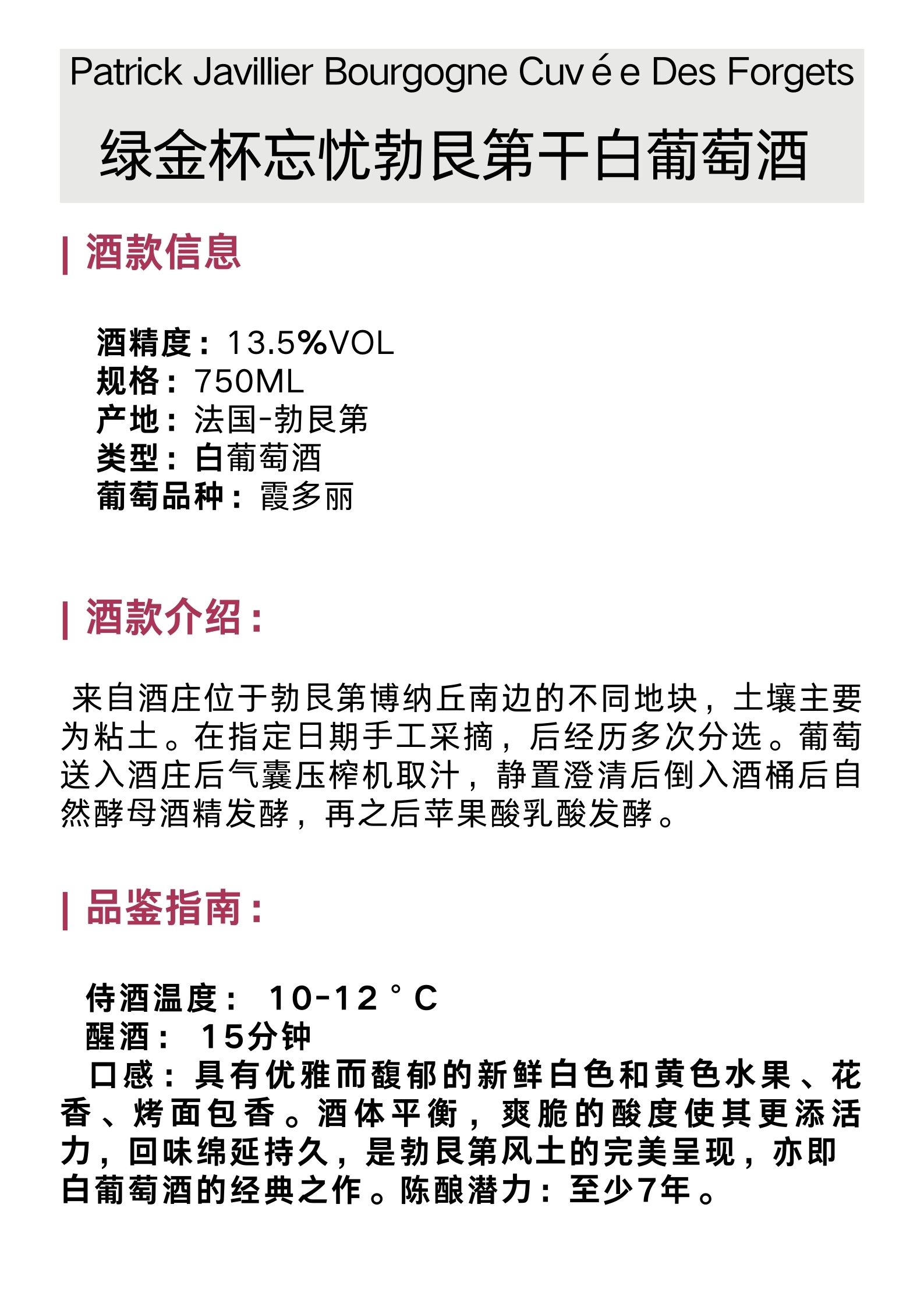 绿金杯忘忧勃艮第干白葡萄酒 Patrick Javillier Bourgogne Cuvée Des Forgets