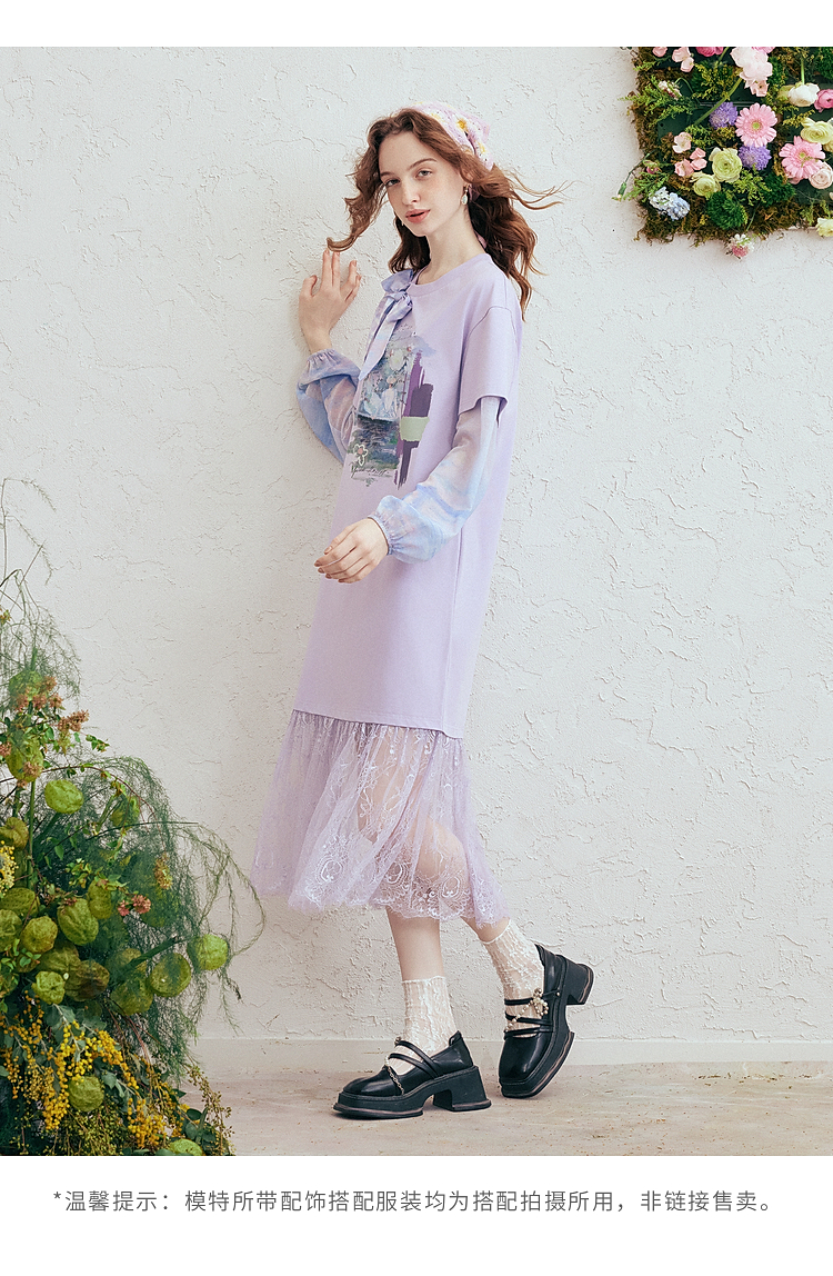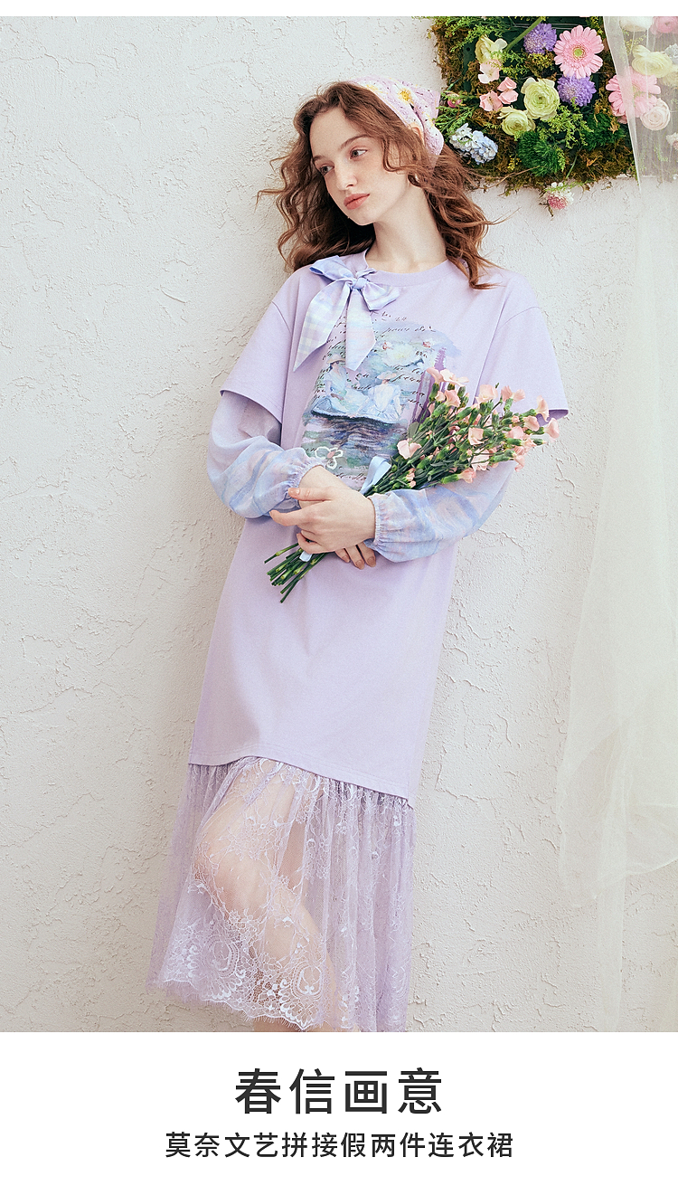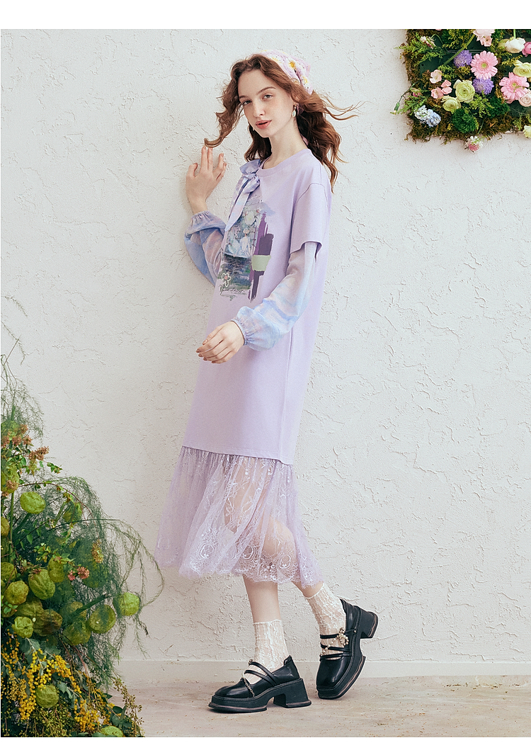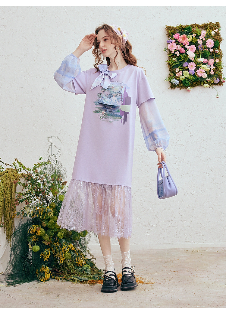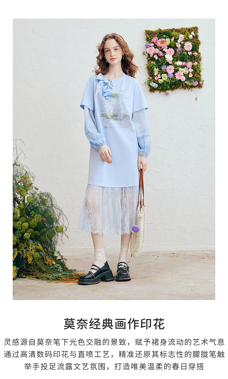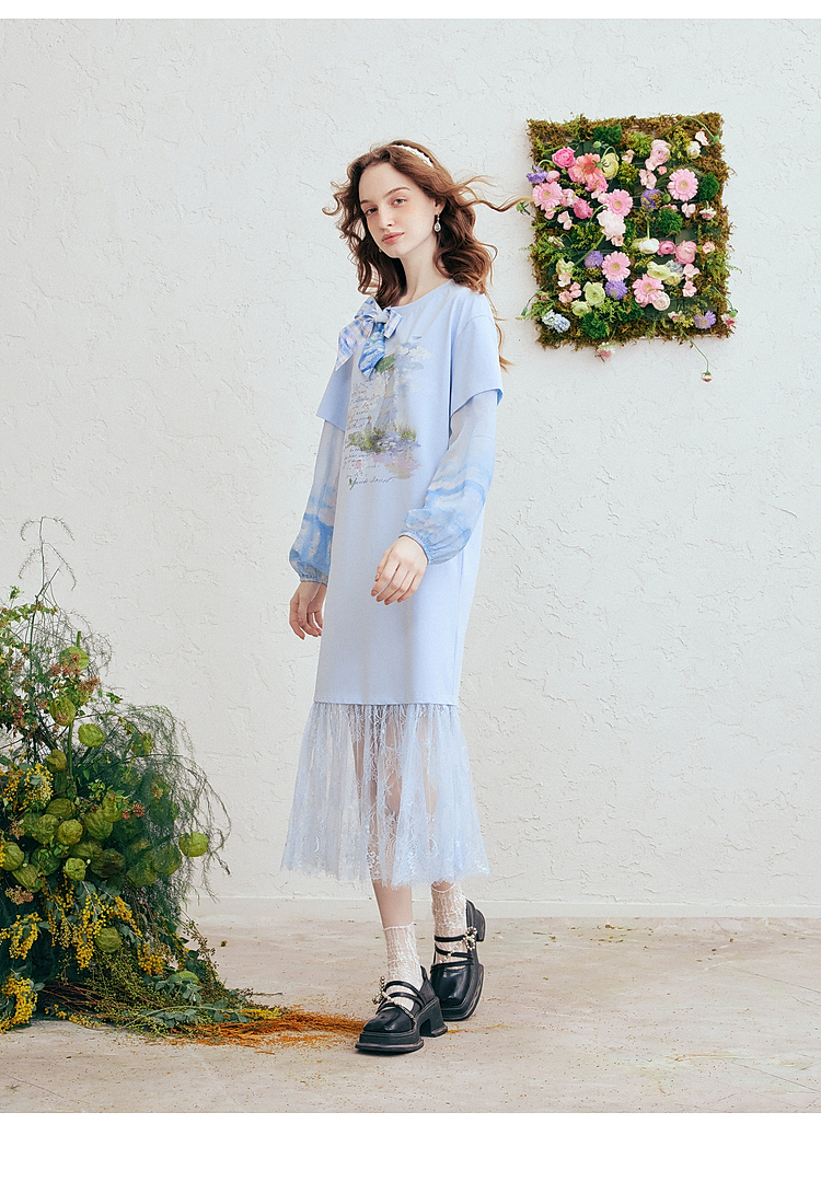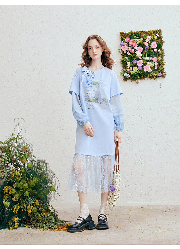 两三事春信画意2026春季新款蝴蝶结圆领拼接袖蕾丝裙摆印花连衣裙