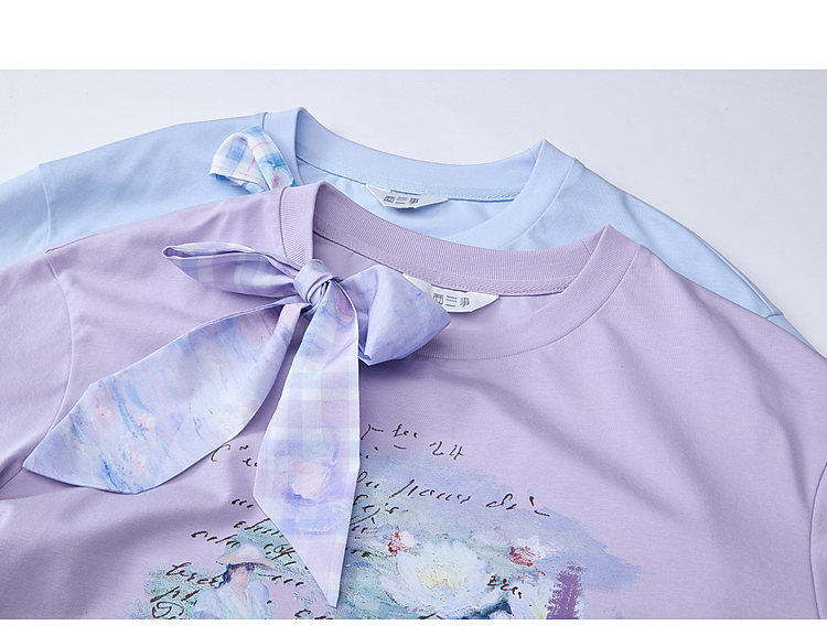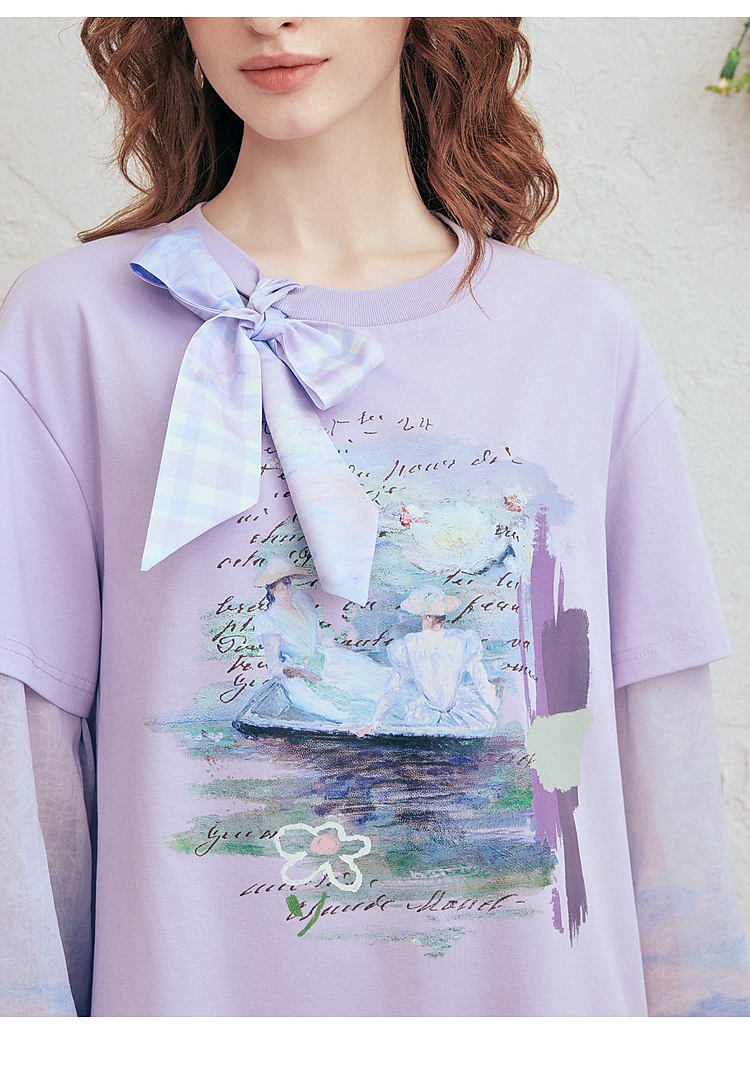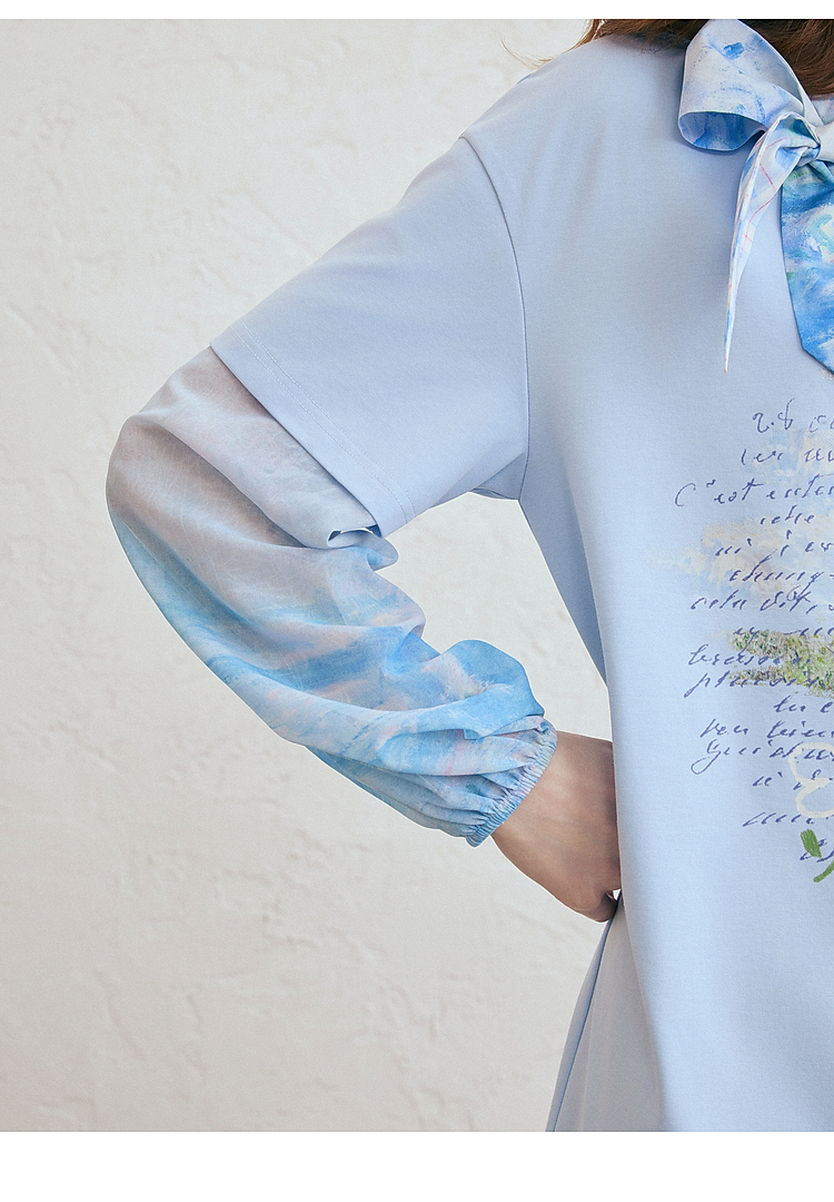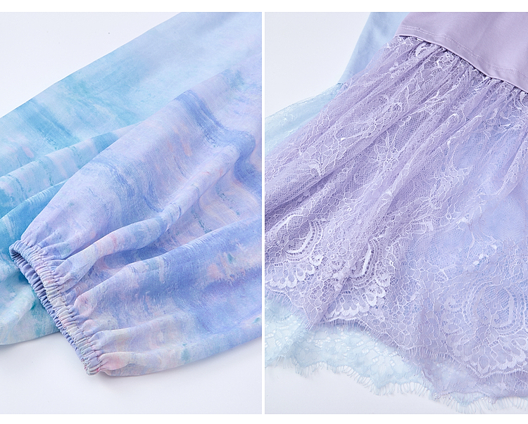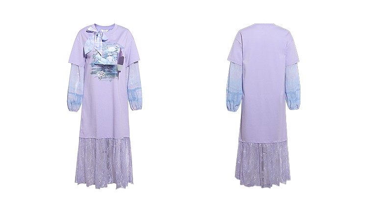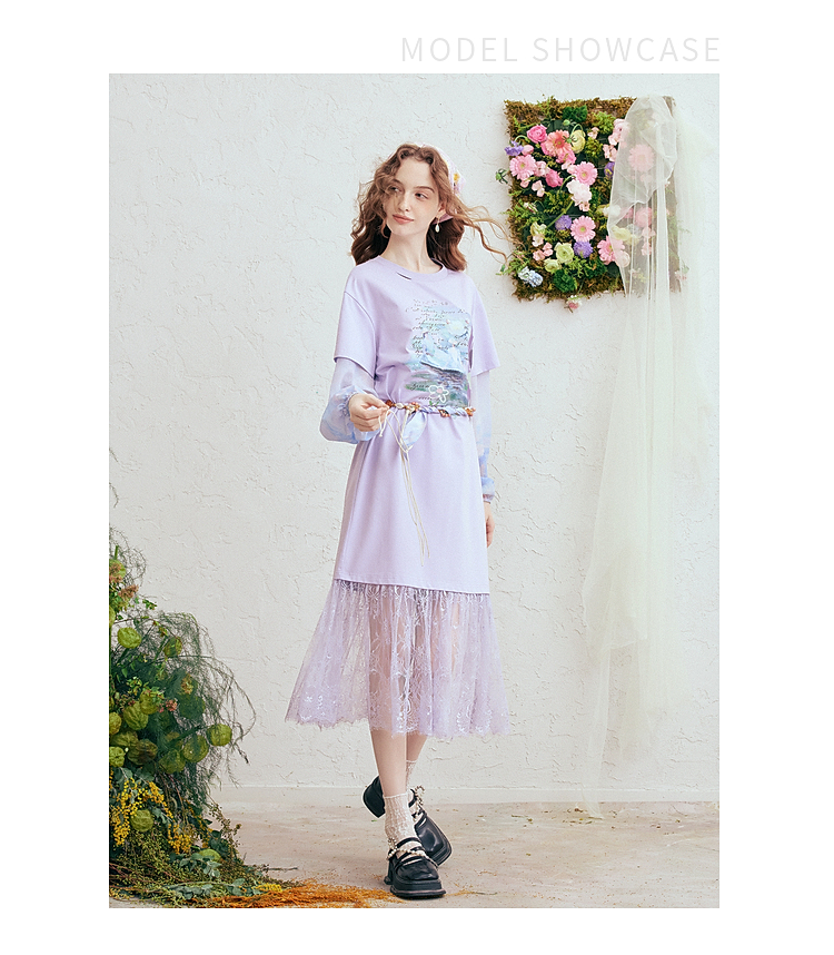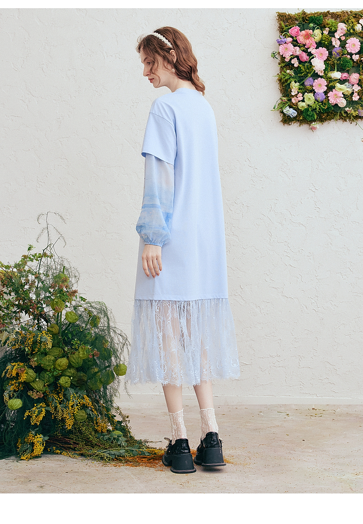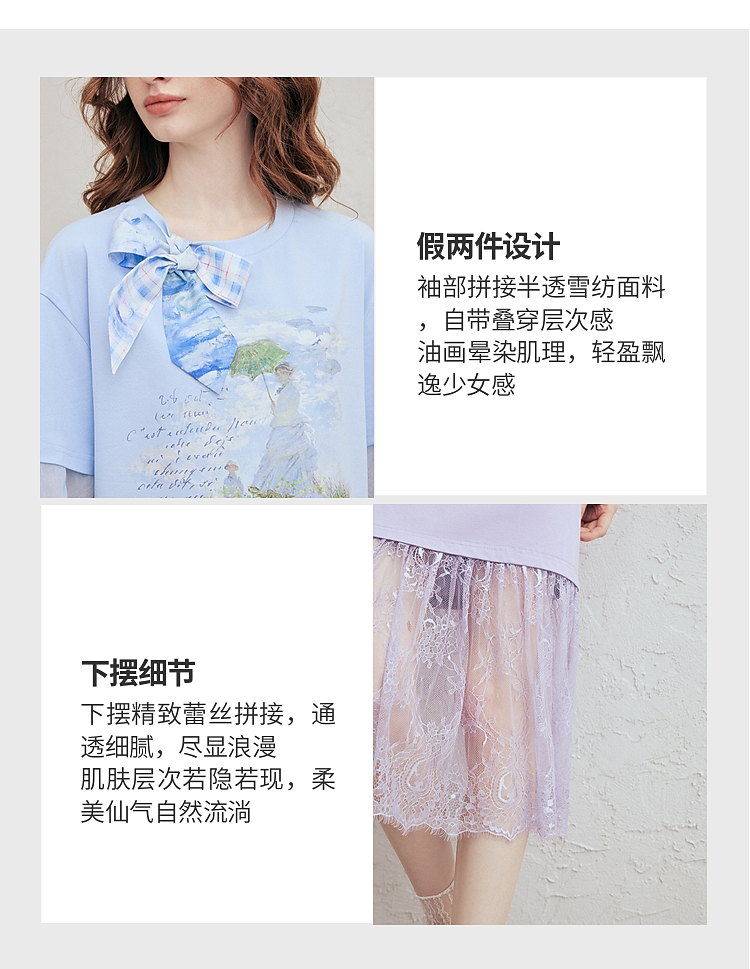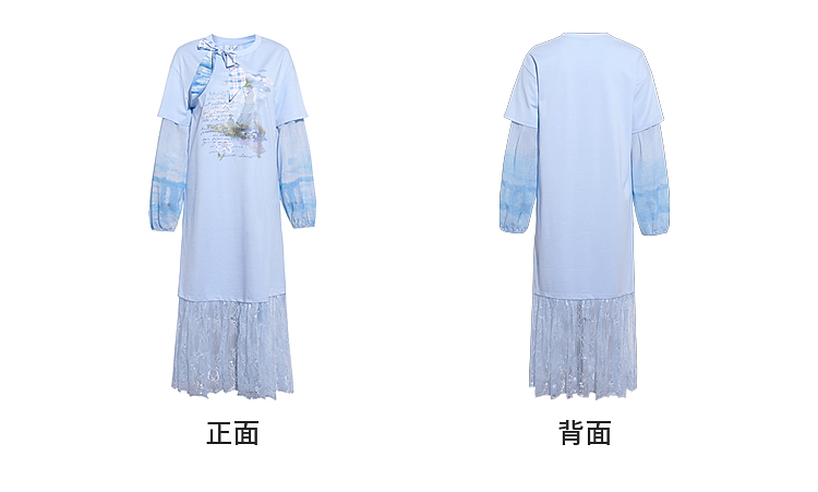 两三事春信画意2026春季新款蝴蝶结圆领拼接袖蕾丝裙摆印花连衣裙