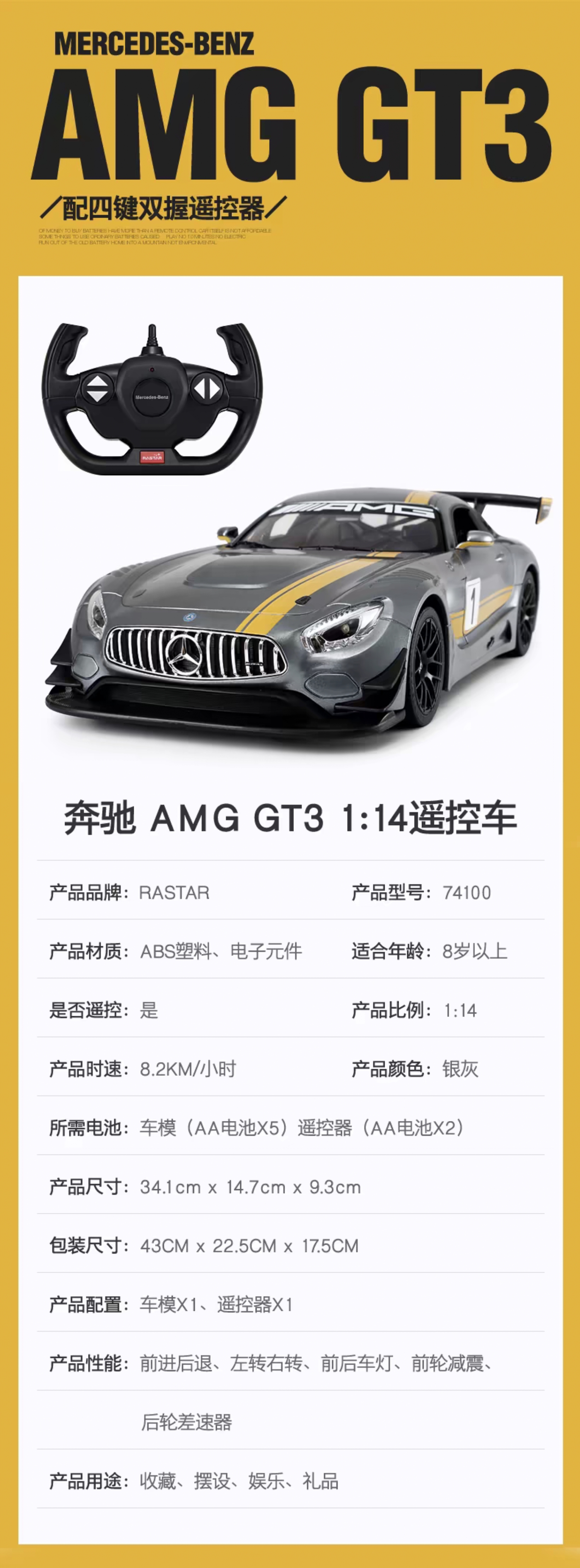 【星辉】奔驰AMG GT3遥控汽车漂移电动1:14跑车模型男孩儿赛车玩具