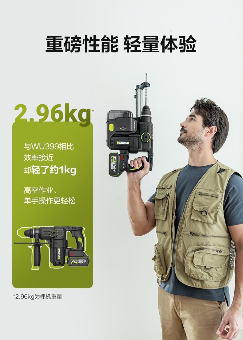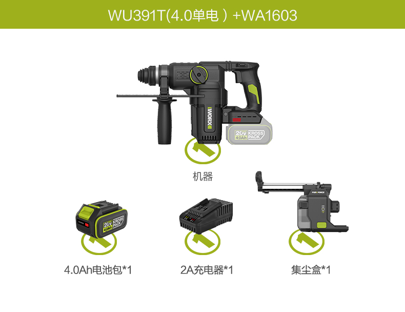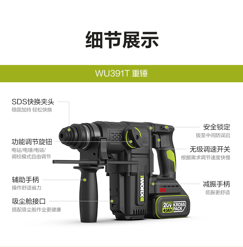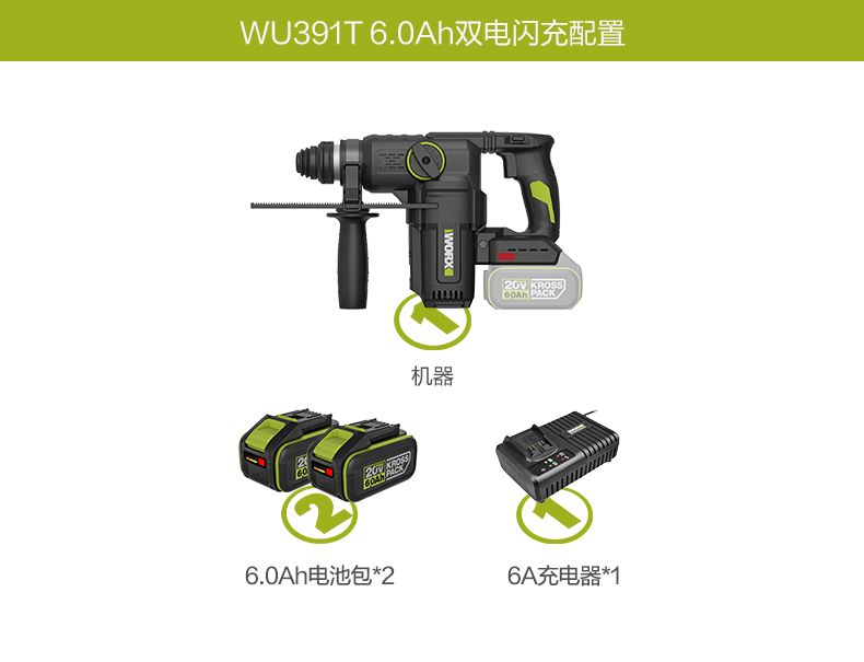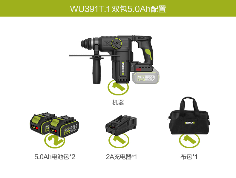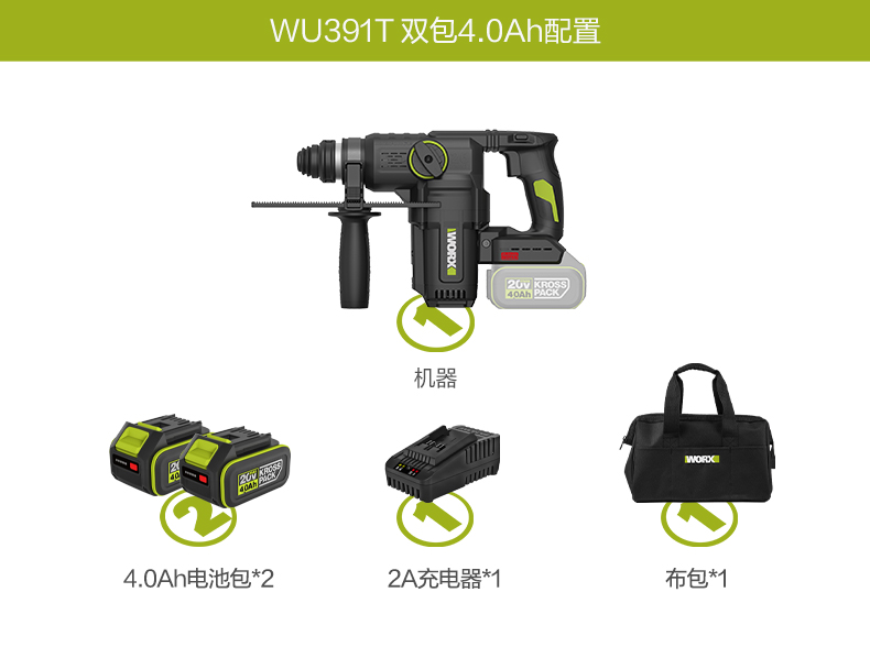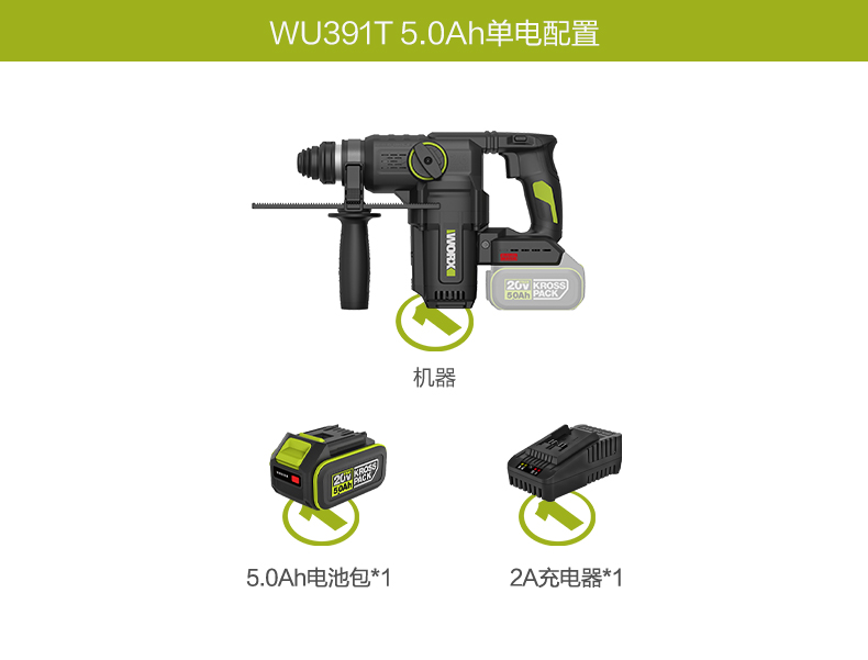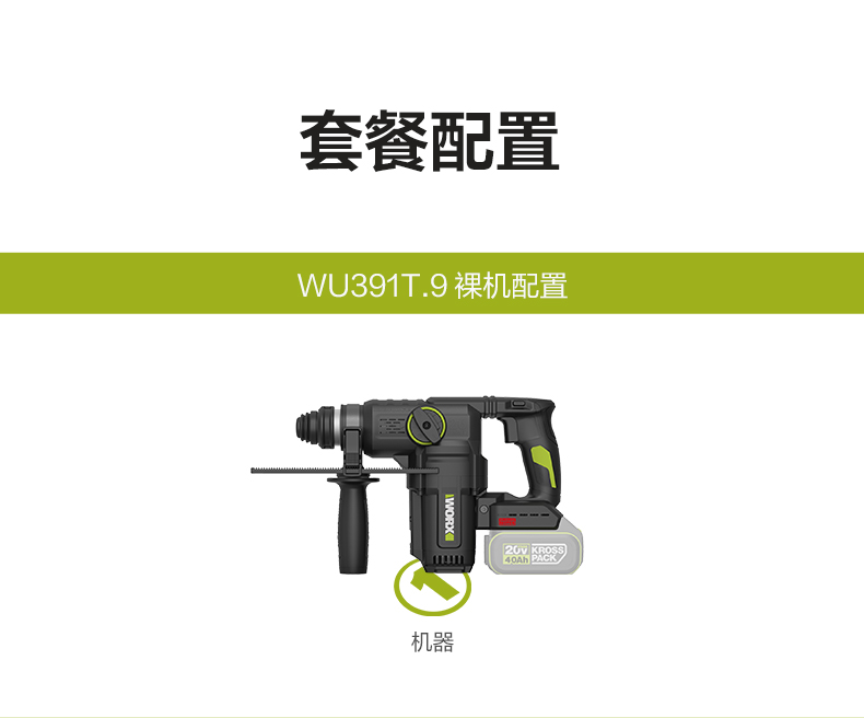 威克士20V 26mm 无刷重载电锤WU391T