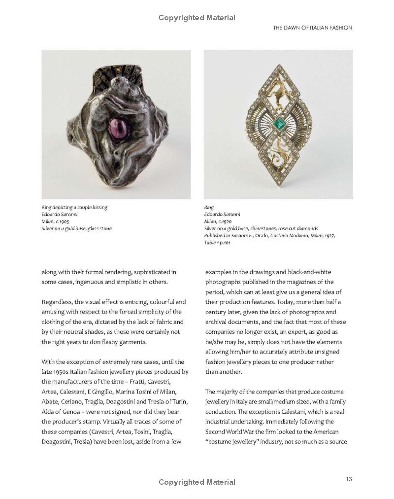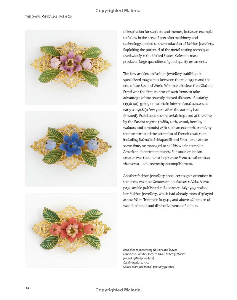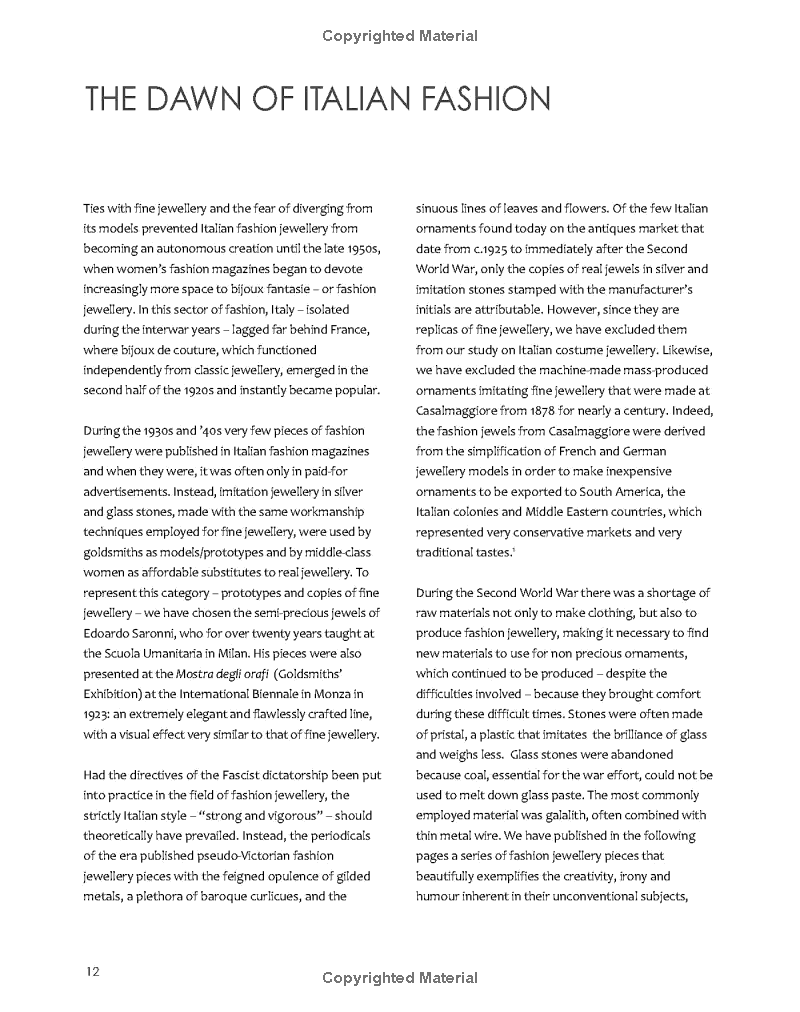 《时尚珠宝:意大利制造》是一本关于20世纪意大利制造的时尚珠宝的全面考察,探索了它与意大利时尚的共生关系。本书从材料受到限制的法西斯统治时期的作品,到五六十年代时尚珠宝界的大牌,均有涵盖。作者着重探讨了发生在20世纪70年代末米兰的一个重要现象——“意大利制造”——当时意大利时尚进入(并主导)国际舞台。