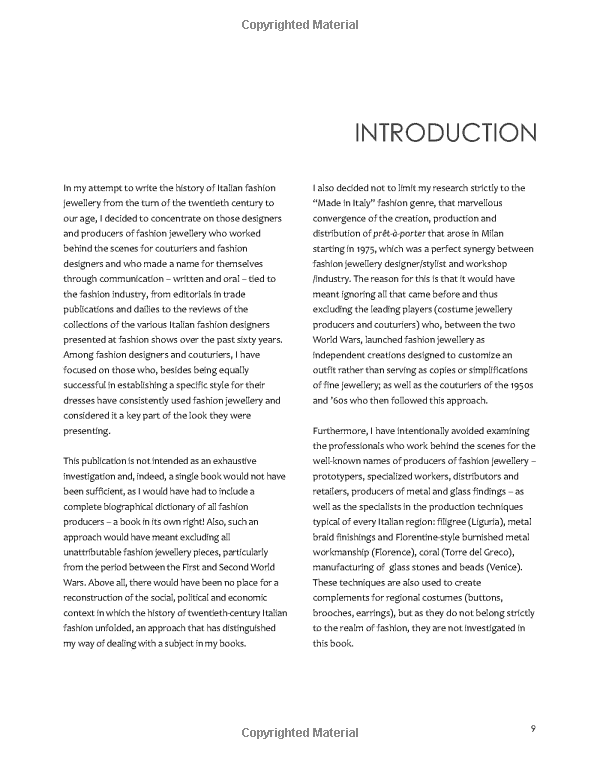 Fashion Jewellery: Made in Italy is a stunning survey of fashion jewellery made in Italy during the 20th century, and its symbiotic relationship with Italian fashion. The book includes pieces from the years spent under fascist rule, when materials were restricted, through to the big names in fashion jewellery of the 50s and 60s. Special attention is given to the important phenomenon that took place in Milan at the end of the 1970s - "Made in Italy" - when Italian fashion entered (and dominated) the international scene.