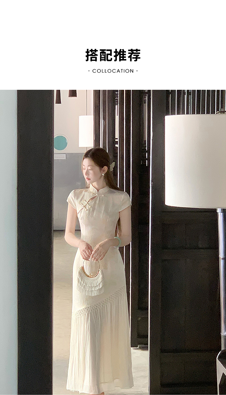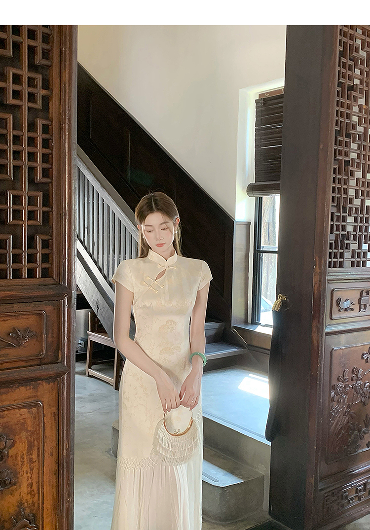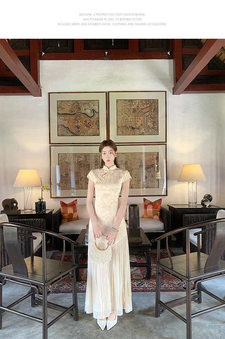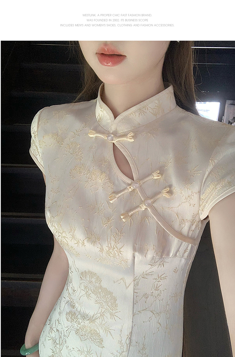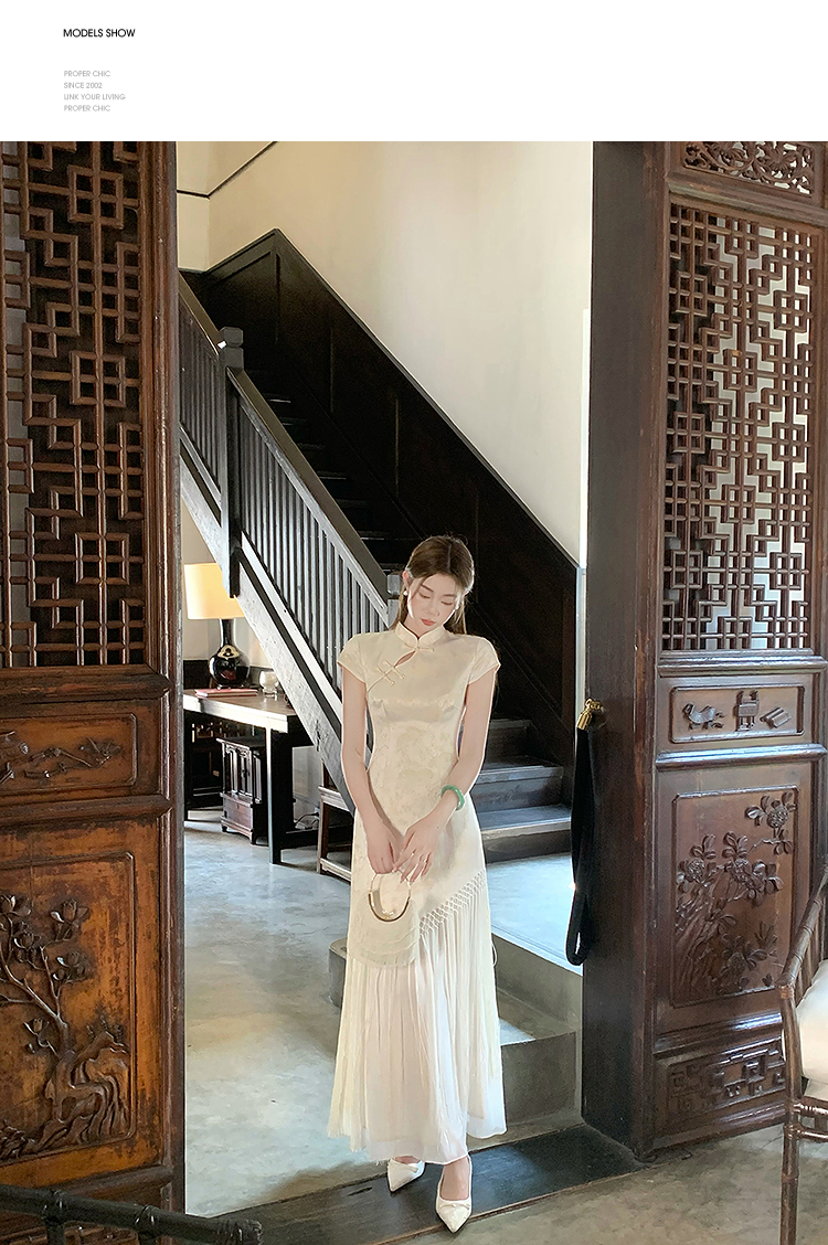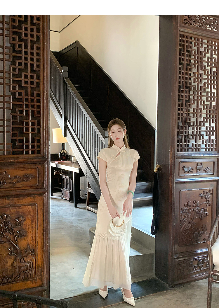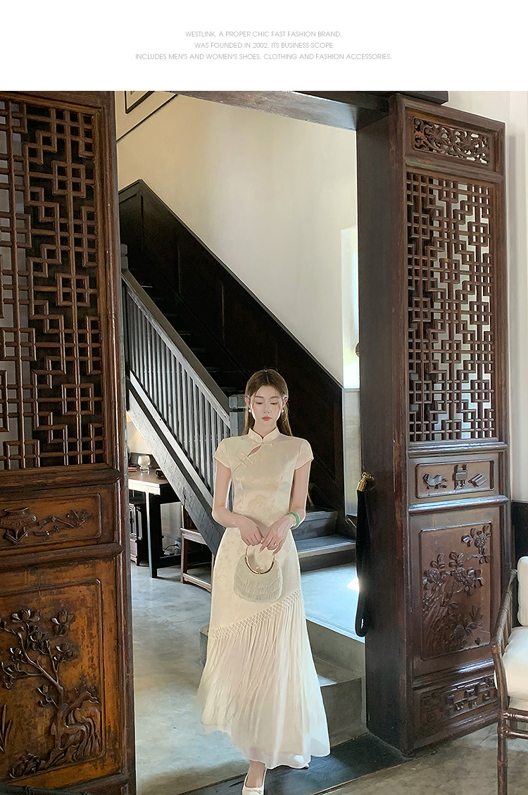 西遇新中式短袖连衣裙女夏季新款网纱拼接收腰盘扣改良旗袍SS050915