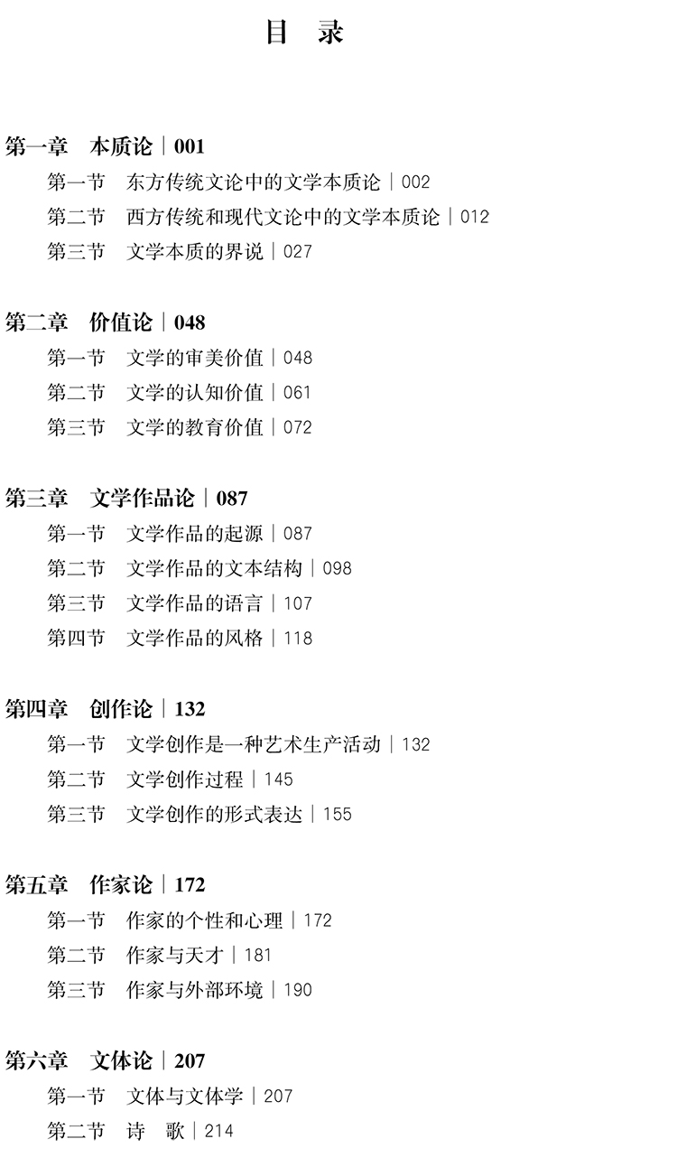 “文学概论”是中文专业学生的必修课程。就目前国内的“文学概论”教材来看,存在“经典”的流失问题。本书在编写过程中特别强调用经典、选经典,在体例上基本遵循了概论核经典文本“一加一”的模式。基于这样的体例安排,本书各章节主要包括文学的本质特点,文学的价值和功能,文学作品的起源、存在方式和结构层次,文学创作的本质和一般过程,作家个性、素养及其后天养成,文体学及文体的基本类型,文学接受及文学批评的特点、类型、功能和原理。这些内容基本上涵盖了文学理论最重要的问题,可使学生在有限的课程时间中进行有效的学习和思考。
