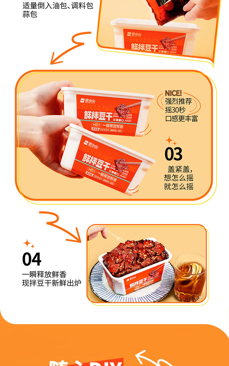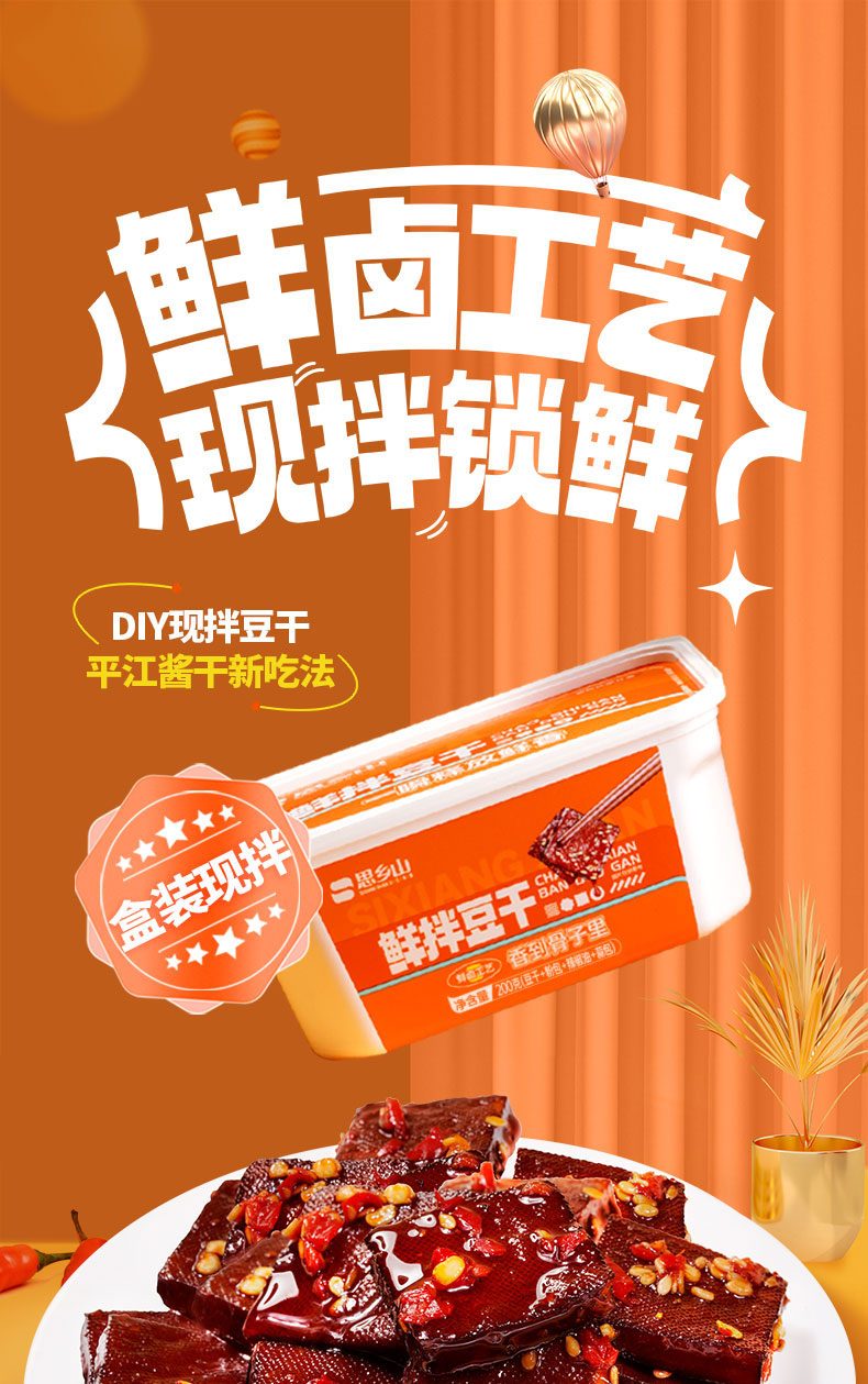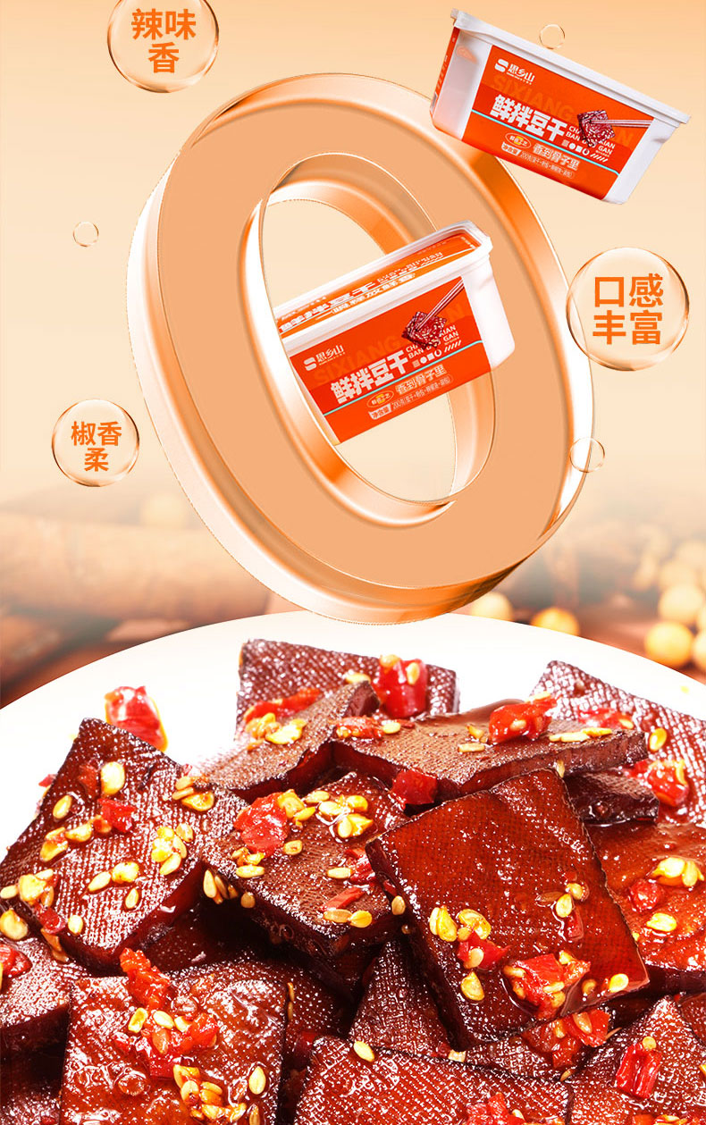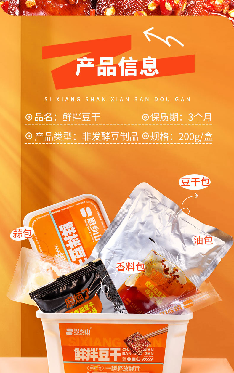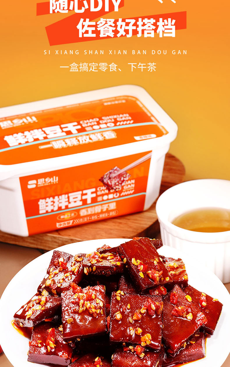 【美味零食 |思乡山鲜拌酱干香辣味 200g*3盒装 】鲜卤工艺现拌锁鲜,豆干慢卤入味豆香浓郁,加上秘制调料包,椒香辣爽过瘾,摇一摇30秒美味速成。食品类下单后不支持退款!
