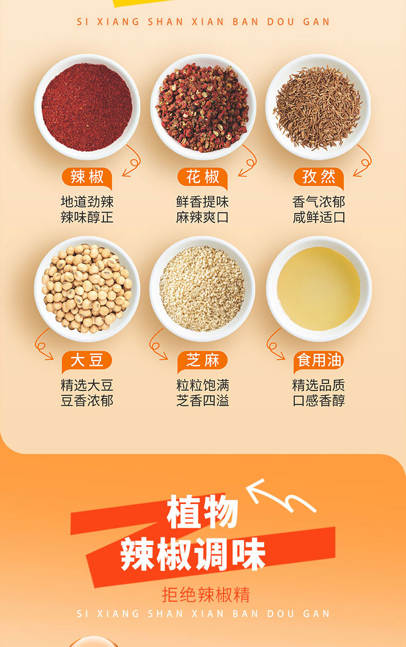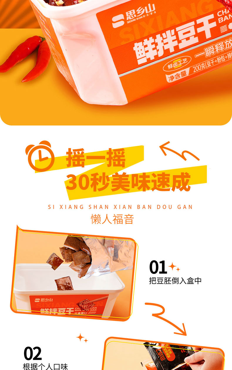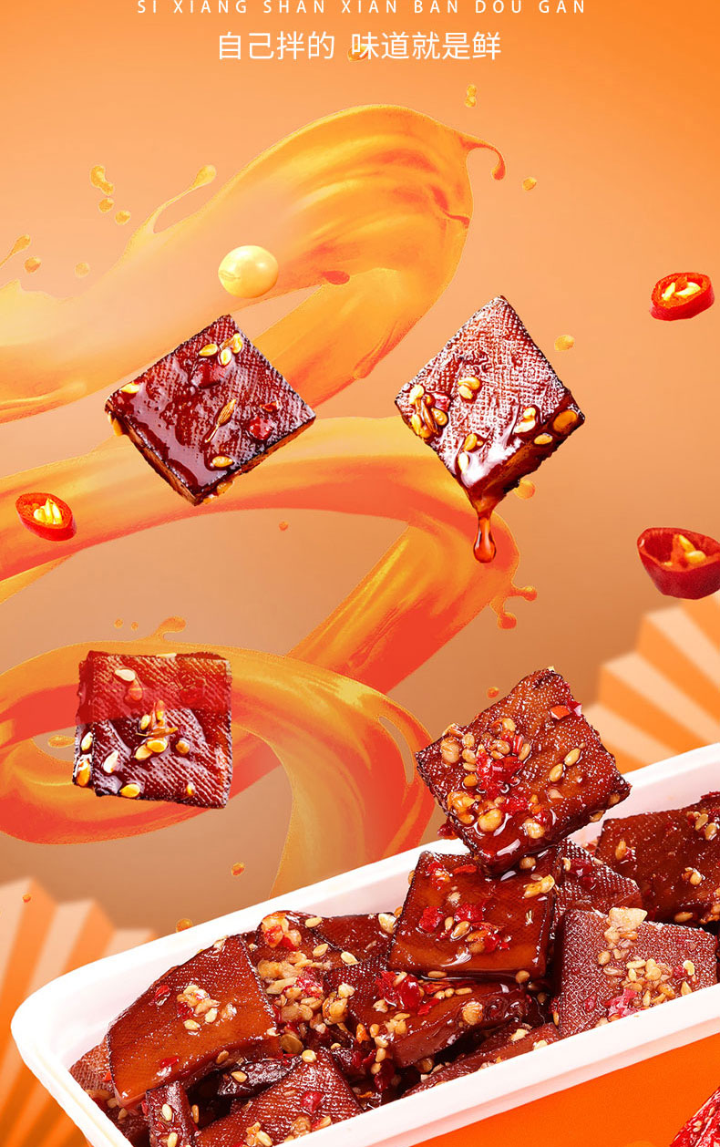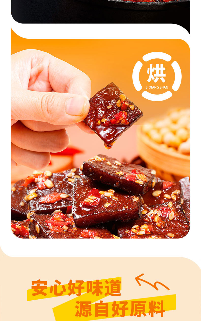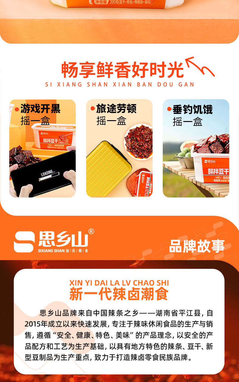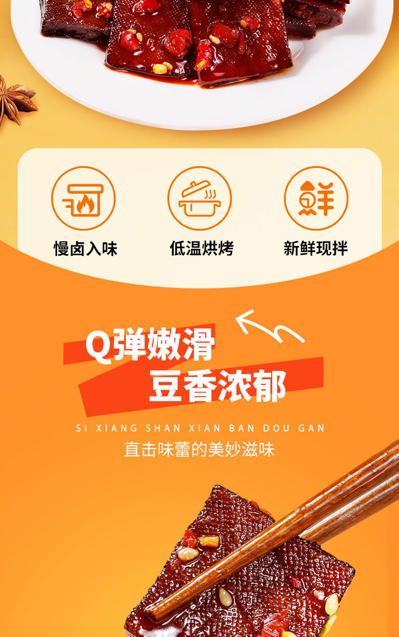 【美味零食 |思乡山鲜拌酱干香辣味 200g*3盒装 】鲜卤工艺现拌锁鲜,豆干慢卤入味豆香浓郁,加上秘制调料包,椒香辣爽过瘾,摇一摇30秒美味速成。食品类下单后不支持退款!