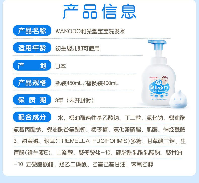 日本直邮 和光堂婴儿低敏泡沫洗发露450ml