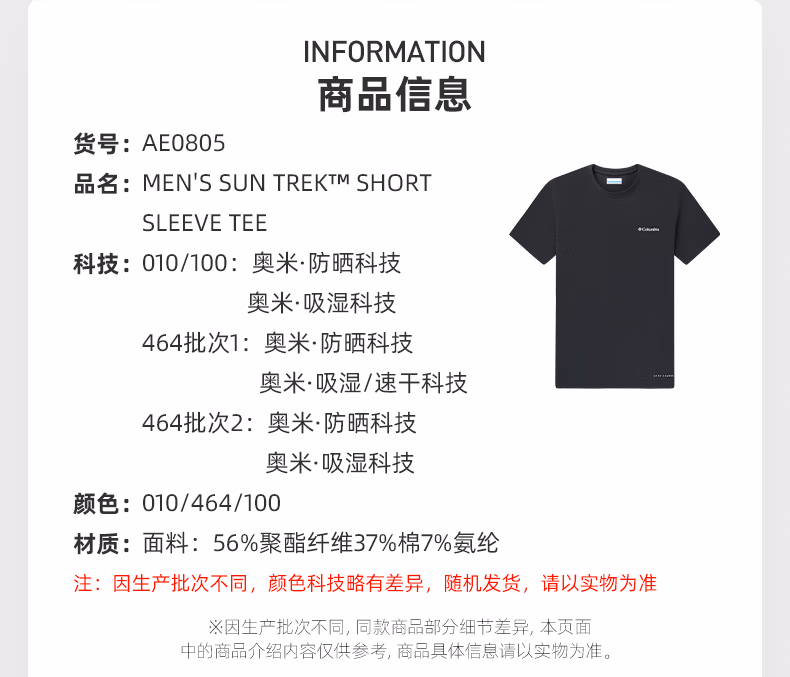 哥伦比亚男式防晒速干短袖T恤AE0805